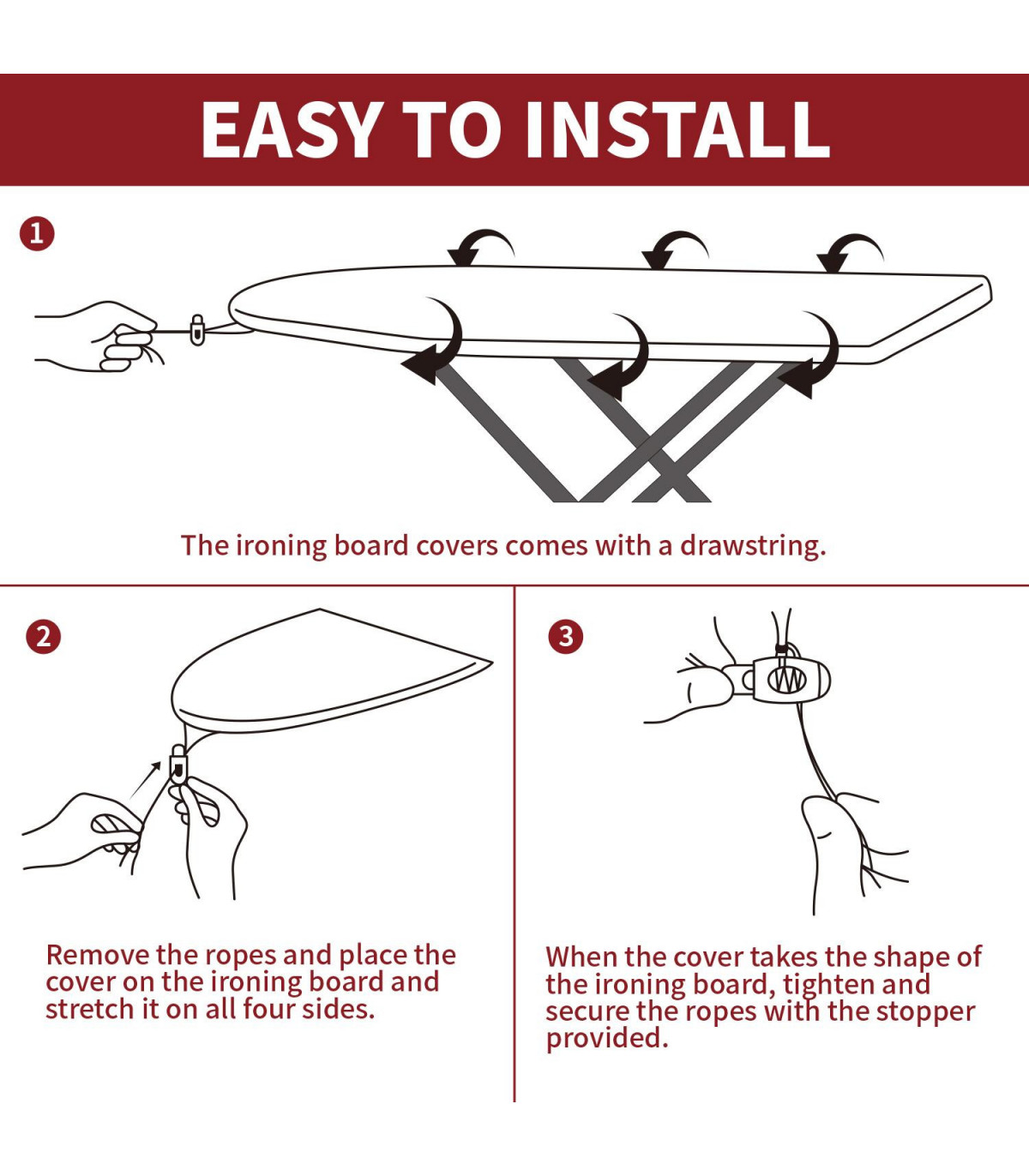 TAILOR TO FIT: Designed to fit all standards ironing boards from 110 cm (43 inch) till 140 cm (55 inch) in length and width till 52 cm (17.7 inch). Note* Iron and iron board are for illustration purpose only. TIME SAVING FASTER IRONING: Cotton Foam Pad material reflects heat, resulting in quicker ironing, saving both time and energy. The cushioned cover surface of the ironing board can also withstand high heat. NON-SLIP COTTON: 100% cotton cover with 3mm thick foam underlay for a super smooth ironing surface. The integrated thick underlay means no separate felt underlay lining is required. FITS IN SECONDS: Our ironing board cover is easy to place on since it has an adjustable elastic edging for a quick and secure fit, as well as a strong shrink rope to fit your boards seamlessly. Our cover will stay securely in place on your board and you may concentrate solely on your garments! EASY TO CLEAN: Wash care instructions, this ironing board cover is machine washable at 30 degree. Do not bleach. Do not tumble dry. Lay flat to dry. Do not dry clean. Please understand, due to some factors, such as the different monitors and the different light circumstances, the colours of the real items could be a little different to the items in the pictures.