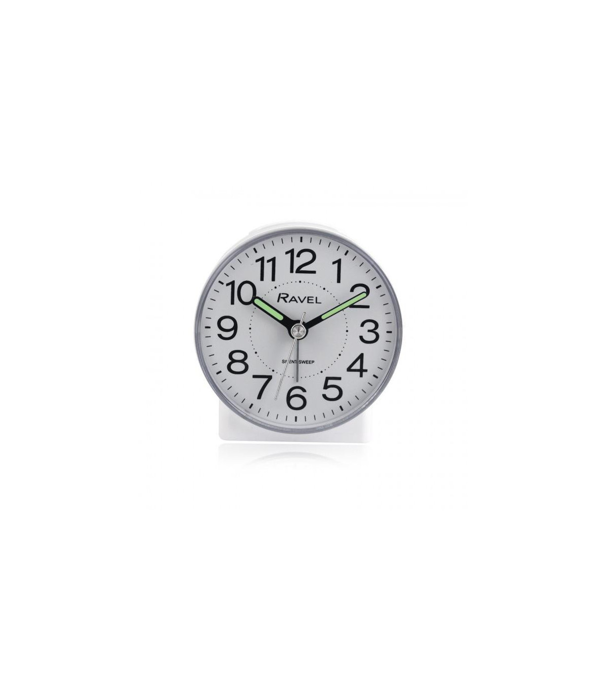 Ravel's midi, bold and contemporary bedside bell alarm clock for the home. Featuring a clear white dial with super-bold black numbers that offers the complete easy-read option. The high-visibility, luminous-tipped hands and hour markers glow in the darkest of rooms. Featuring a beep alarm with crescendo function. Available in white, black, silver, white / pink or white / blue. With snooze, silent sweep and light functions. Ideal for bedside table's, mantel pieces, desk's and office spaces.