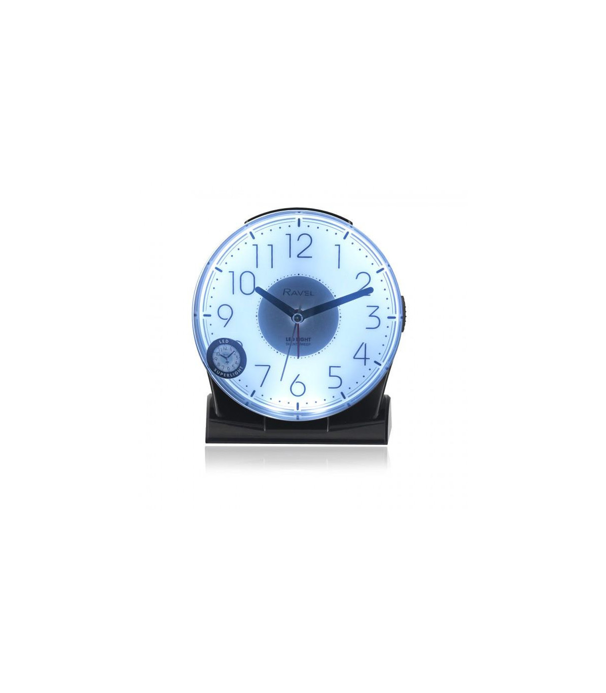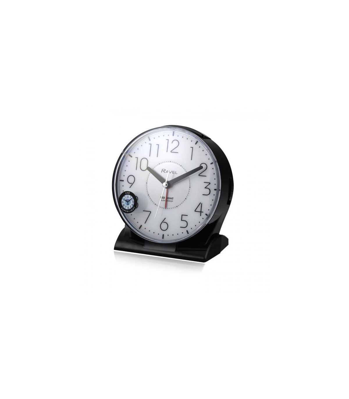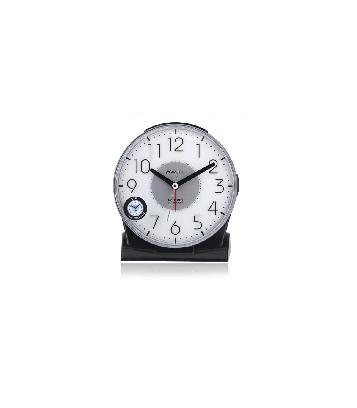 Ravel's large, bold and contemporary bedside / mantel alarm clock with LED superlight for the home. Featuring a clear white dial with large, modern styled black numbers that offer the complete easy-read option. Bold black hands and hour markers are easy to see. Featuring a beep alarm with crescendo function. Available in black or white. With snooze, silent sweep and superbright LED light functions. Ideal for bedside table's, mantel pieces, desk's and office spaces.