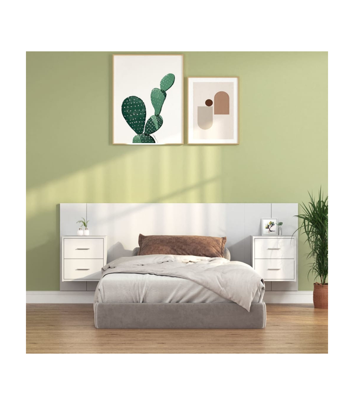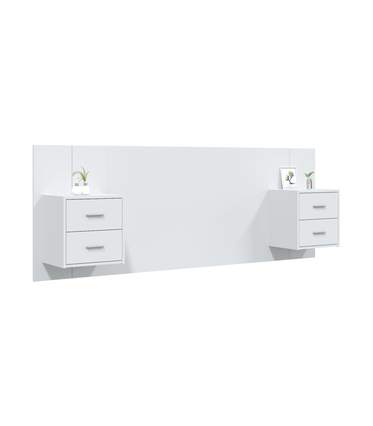 This sturdy bed headboard with cabinets features a classic design that provides a complete look for your bed frame and fits in any bedroom. Stable and durable material: Engineered wood is a durable and stable material with a smooth surface that is resistant to moisture, warping, and splitting, making it a reliable choice for a variety of projects. Wall-mounted design: The floating nightstands and headboard can be wall-mounted. That way, you can maximise your floor space and keep the area clean. RGB LED lights for a pleasant ambience: The cabinet features LED lights that can be easily adjusted to create a personalised light show. You can customise the modes, colours, and brightness to enhance the ambience of your interior space. Storage space: The bedside unit features spacious storage space which allows you to keep your things organised. Easy to maintain: Thanks to its smooth surface, the bedroom furniture is easy to clean with a damp cloth and requires less maintenance. Good to know:Screws and plugs for inside the wall are not included. We advise to find and use screws and plugs suitable specifically for your walls. If you're not sure, you can consult with a professional. Please read and follow each step of the instructions. The product has a USB connector that requires a certified 5V USB power source (not included).