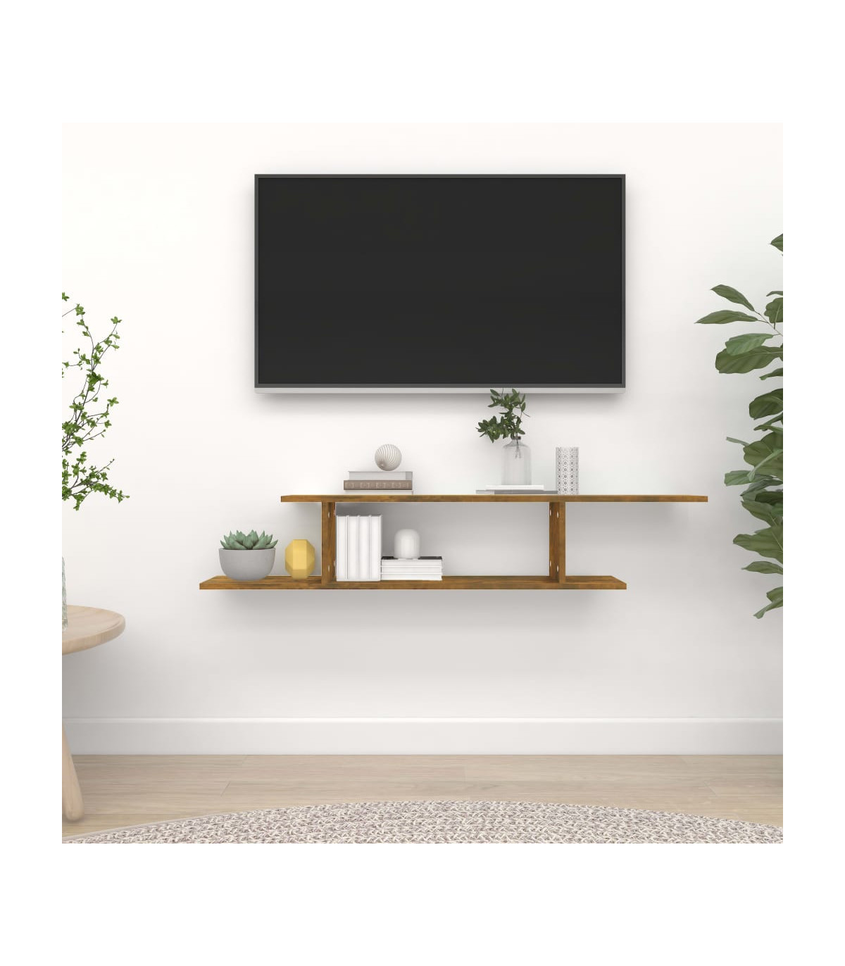 This stylish and modern wall-mounted TV shelf is meant to be the focal point of your home. This hanging wall shelf is sturdy and stable. It is suitable for placing DVD players, CD, AV components, game systems, books, magazines or other decorative items. The wall-mounted design doesn't take much space and frees up valuable floor space. The upper board and lower board, featuring asymmetrical design, can be installed in an opposite position, such as one on the left and one on the right. It is also easy to clean with a damp cloth. Additionally, this wall rack is easy to assemble with included mounting materials.