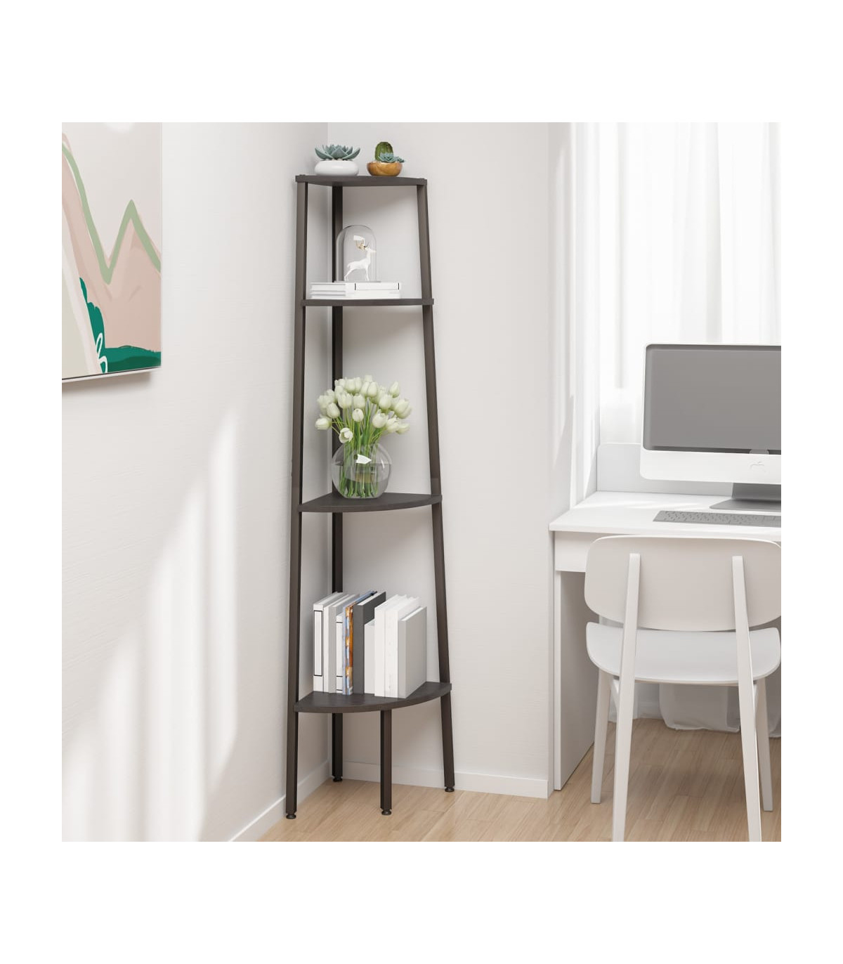 Create an extra storage area in a limited space with this 3-tier corner shelf! Strong steel construction: The storage shelf has a strong steel frame, which ensures sturdiness and stability.Ample storage space: The corner bookcase takes little space while offering ample space to store your books, plants, picture frames and any additional stuff.Wide application: The practical shelf is perfectly suitable for your home and office, including your living room, bathroom, bedroom, balcony, etc. WARNING:To prevent overturning, this product must be used with the wall attachment device provided.Note:Each product comes with an assembly manual in the box for easy assembly.