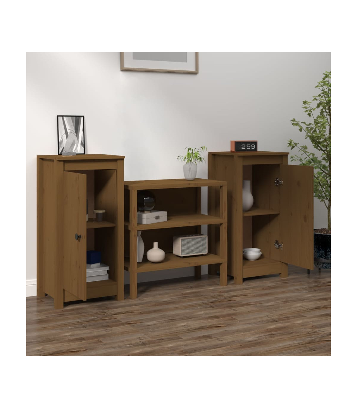 Enjoy a tidy living room with this wooden sideboard! The practical sideboard will satisfy your various requirements and is an ideal complement in your room. Solid pine wood: Solid pine wood is a beautiful natural material. Pine wood has a straight grain, and the knots give the material its signature, rustic look.Ample storage: The side cabinet provides ample storage space for keeping your various daily essentials well organised and within easy reach.Sturdy top: The sturdy tabletop of this storage cabinet is ideal for displaying decorative objects, photo frames, or potted plants. Warning:In order to prevent overturning, this product must be used with the wall attachment device provided.