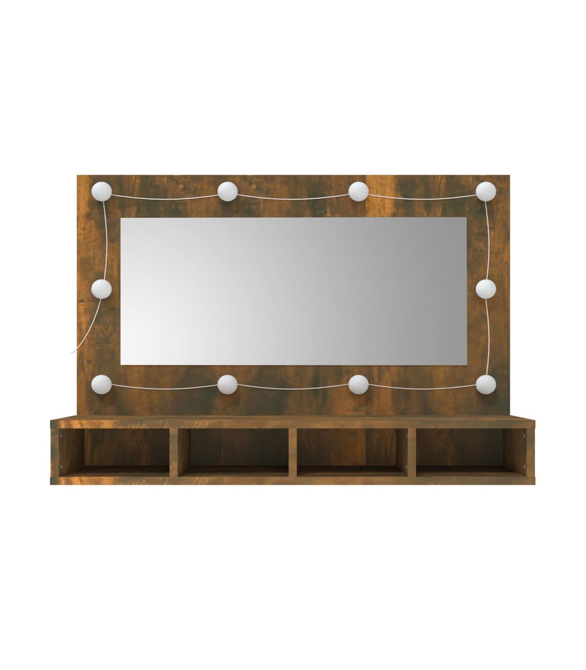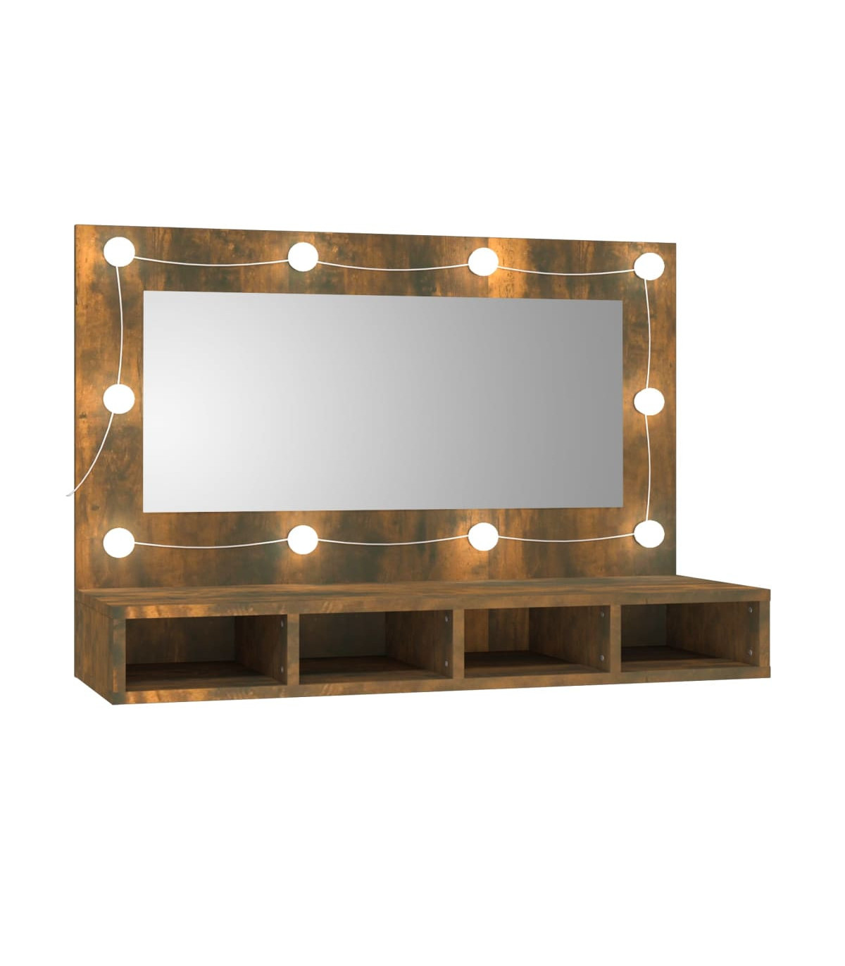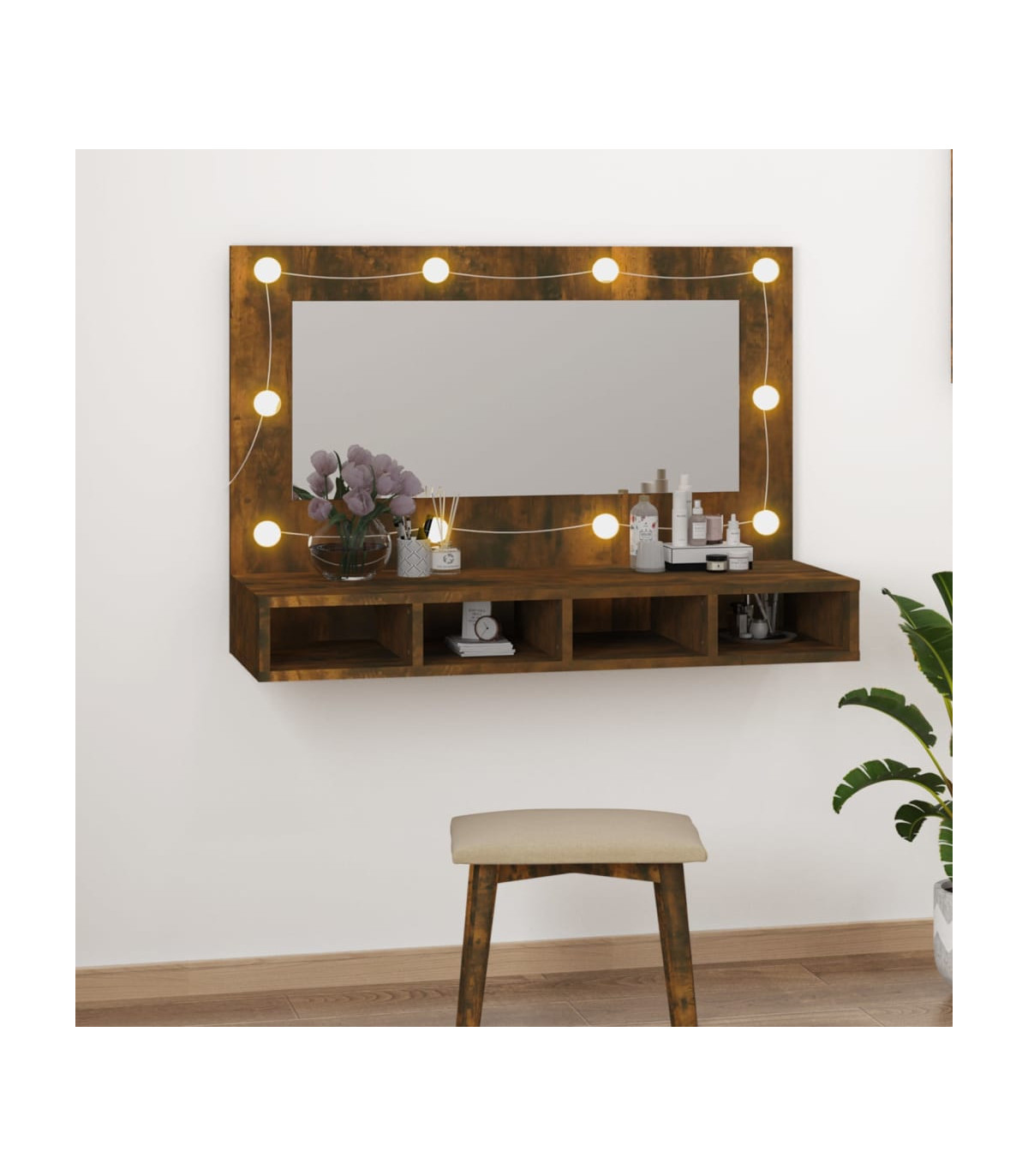 Keep your make-up essentials organised and neat with this trendy LED mirror cabinet! Durable material: The engineered wood is of exceptional quality with smooth surface and also features strength, stability and resistance to moisture.LED light: The mirror cabinet has LED bulbs with USB, which are easy to switch modes from warm to cold white. The featured LED bulbs around mirror illuminate your beauty as well.Flexible installation ways: This mirror cabinet with LED can be placed steadily on your dresser, or you can mount it on the wall to save floor space.Ample storage space: This wall cabinet has 4 open shelves, which can perfectly improve the storage efficiency and also brings a reliable storage solution. Good to know:Screw(s) and plug(s) for inside the wall are not included. Seek and use screw(s) and plug(s) suitable for your walls. If you are uncertain, seek professional advice. Read and follow each step of the instruction carefully.