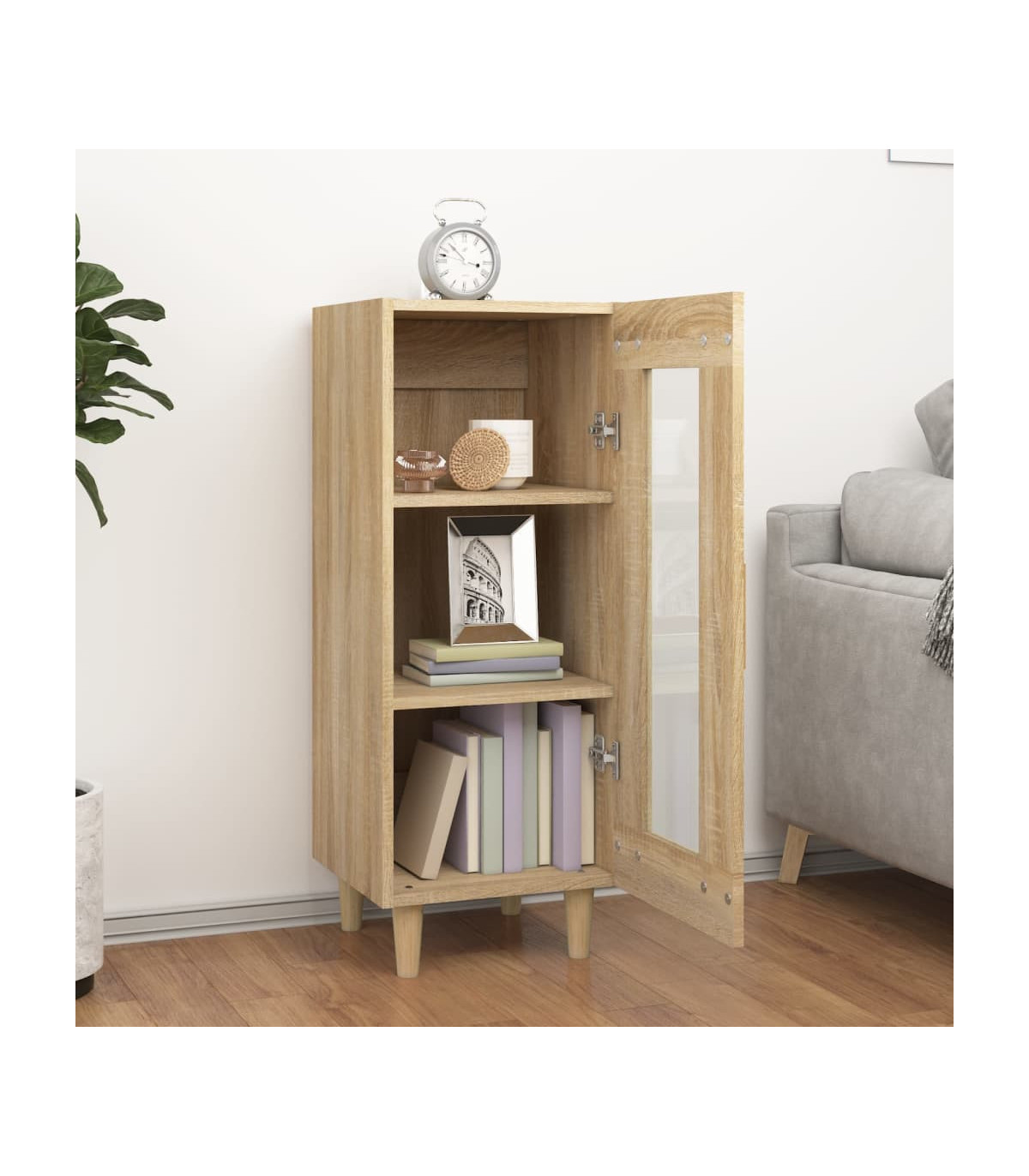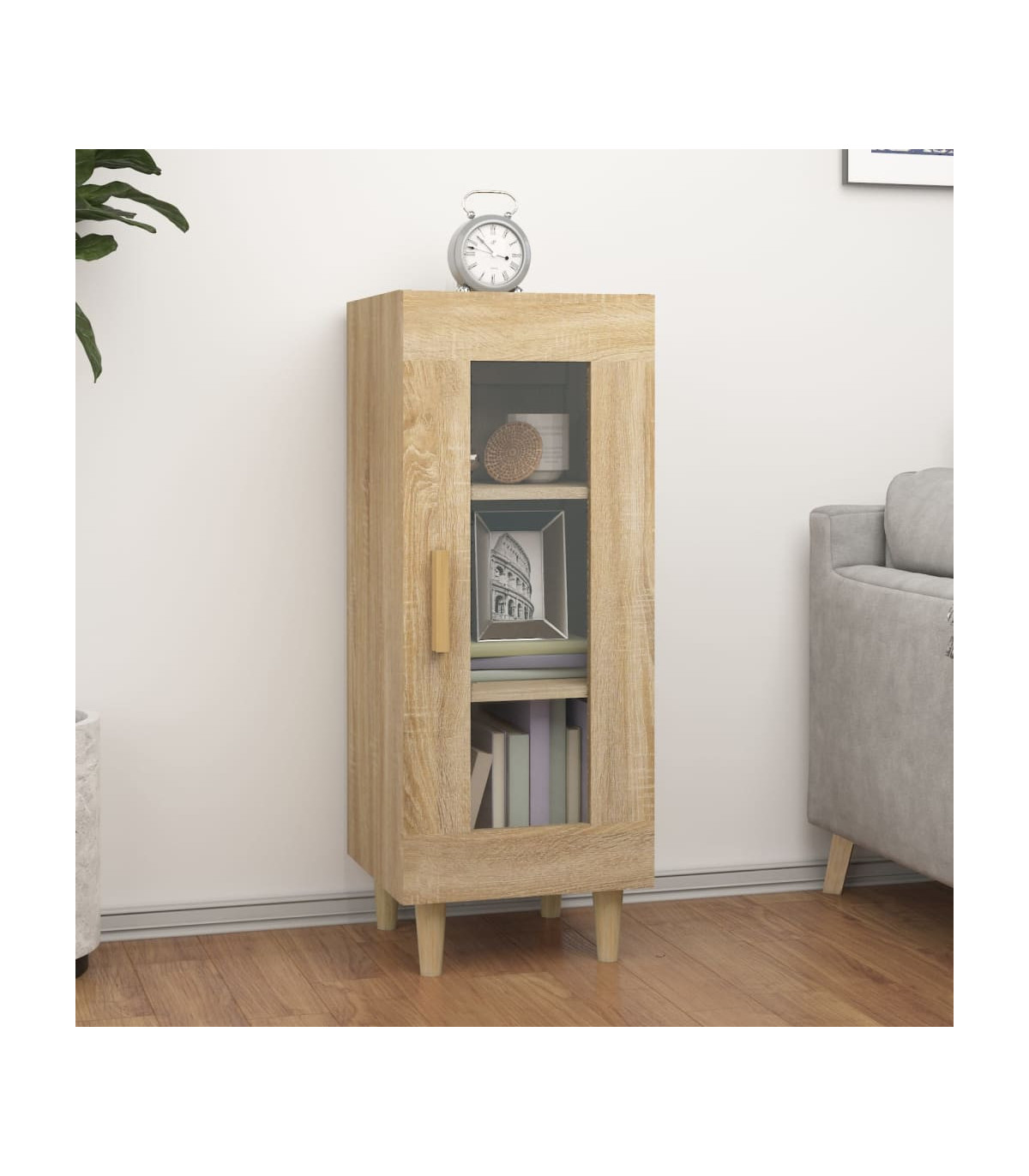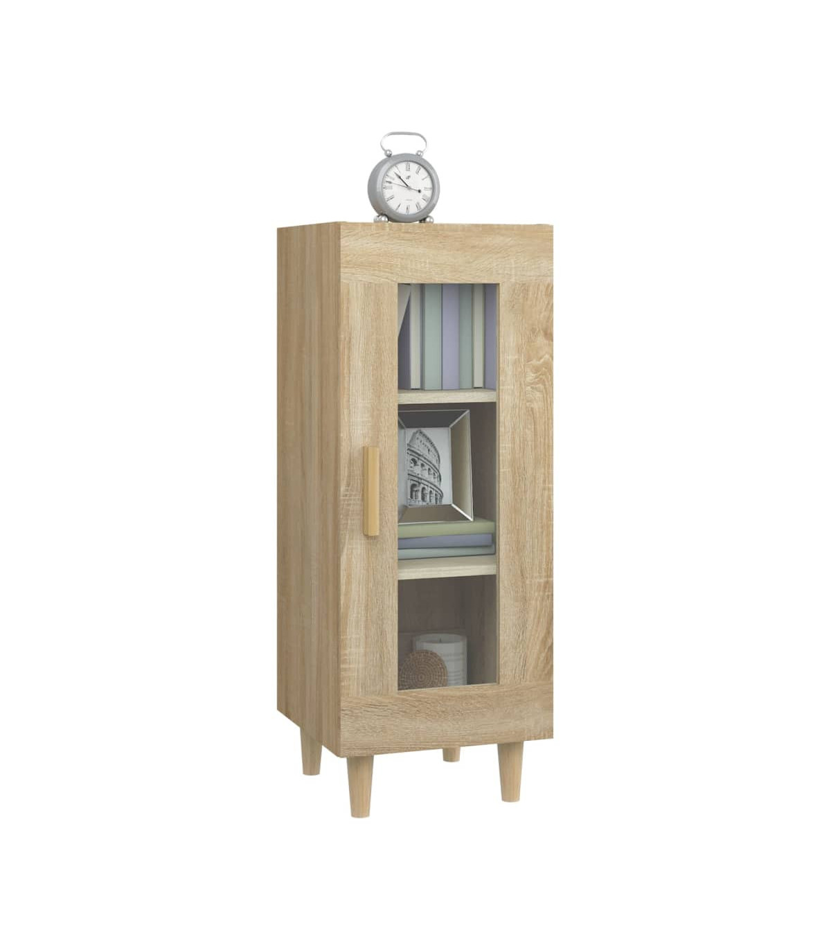 This stylish and practical sideboard is meant to meet all your requirements and is an ideal addition to your room. Durable engineered wood: The engineered wood is of exceptional quality with smooth surface and also features strength, stability and resistance to moisture. Made of engineered wood, this cabinet is easy to clean.Ample storage space: This sideboard cabinet, featuring 3 compartments and 1 glass door, offers ample storage space for keeping your magazines, books, DVDs, multimedia devices and other decorative items well organised and within reach.Flexible door installation: The door of the cupboard can be installed on the left or right according to your personal habits and convenience.Wooden legs: The wooden legs give the storage cabinet a natural and pleasant look while ensuring stability. It can blend well with any interior decor. Warning:In order to prevent overturning, this product must be used with the wall attachment device provided. Note:Each product comes with an assembly manual in the box for easy assembly.