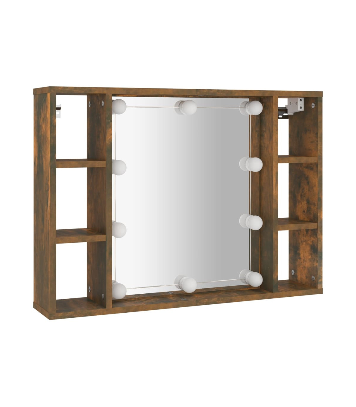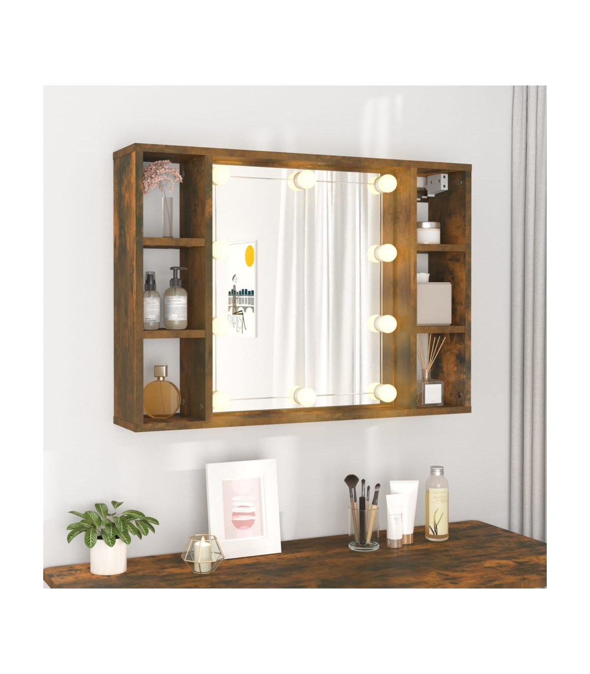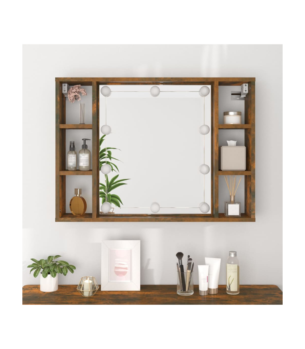Keep your make-up essentials organised and neat with this trendy mirror cabinet with LED lights! Durable material: The engineered wood is of exceptional quality with smooth surface and also features strength, stability and resistance to moisture. Made of engineered wood, the LED mirror cabinet is easy to clean.Utility mirror: A beautiful mirror provides a view for makeup application and adds an elegant touch to the bathroom mirror cabinet.LED lights: The wall cabinet has LED bulbs, which are equipped with a USB interface, making it very convenient to use.Ample storage space: This jewellery mirror cabinet features 6 compartments, which offer places for your items and keep everything in its place.Wall-mounted design: The LED bathroom mirror cabinet can be wall-mounted. That way, you can maximise your floor space and keep the area clean. Note:Each product comes with an assembly manual in the box for easy assembly.Screw(s) and plug(s) for inside the wall are not included. Seek and use screw(s) and plug(s) suitable for your walls. If you are uncertain, seek professional advice. Read and follow each step of the instruction carefully.