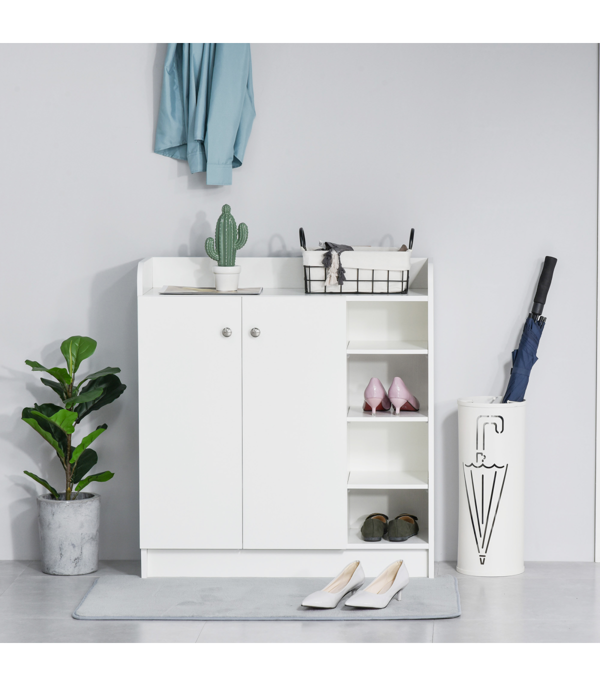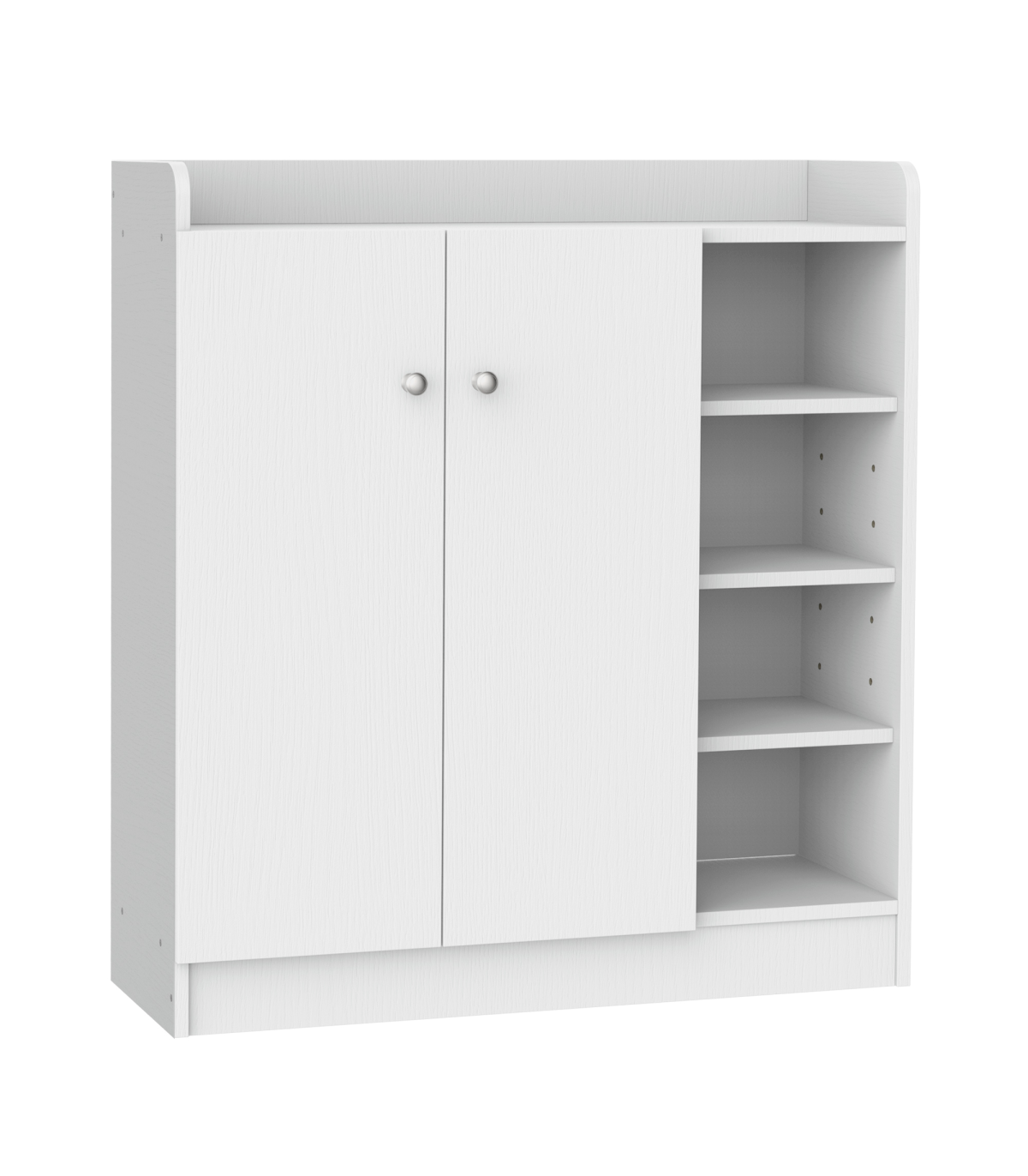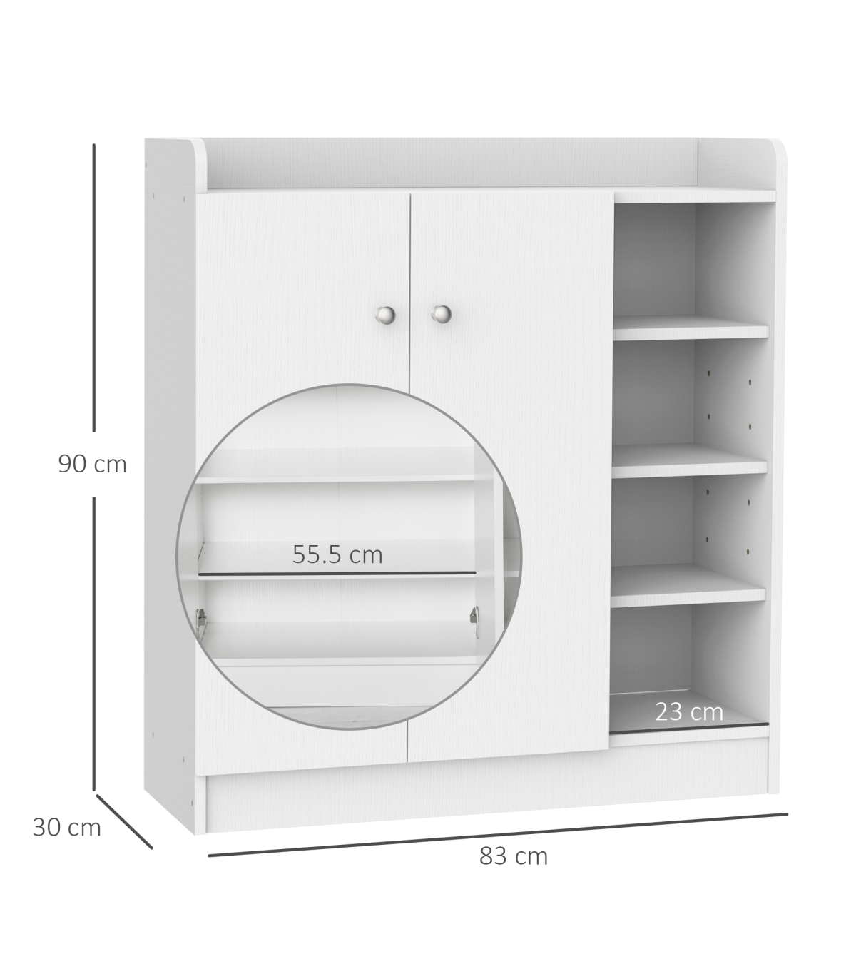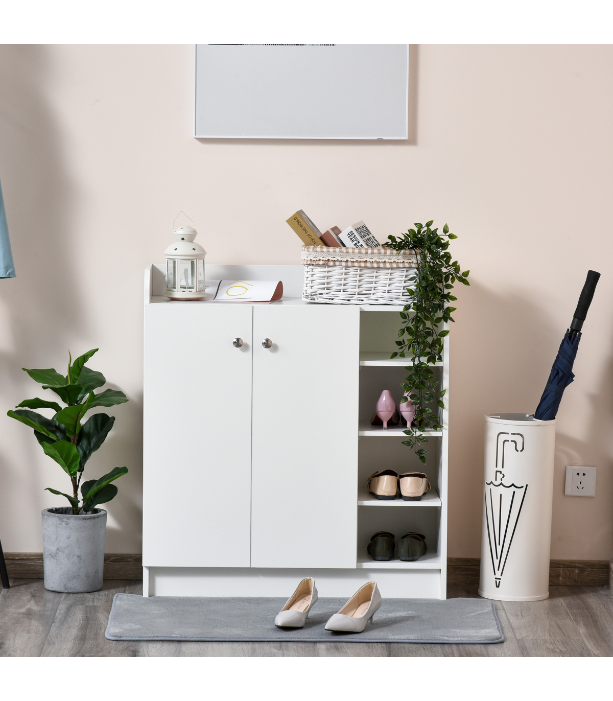 - Shoe Storage Cabinet Home 2 Doors with Adjustable 4 Shelves in White Description: - Features 4-tier open and door covered shelving with aluminium alloy handles - Shelves can be adjusted up and down within 6.5 cm to fit various sizes - Able to store up to 12 pairs of shoes to clear up your hall and entryway - Top surface offers added storage area - Made of high-quality E1 chipboard with wood grain effect finish - Melamine coated surface provides water and scratch resistance - Assembly is required.