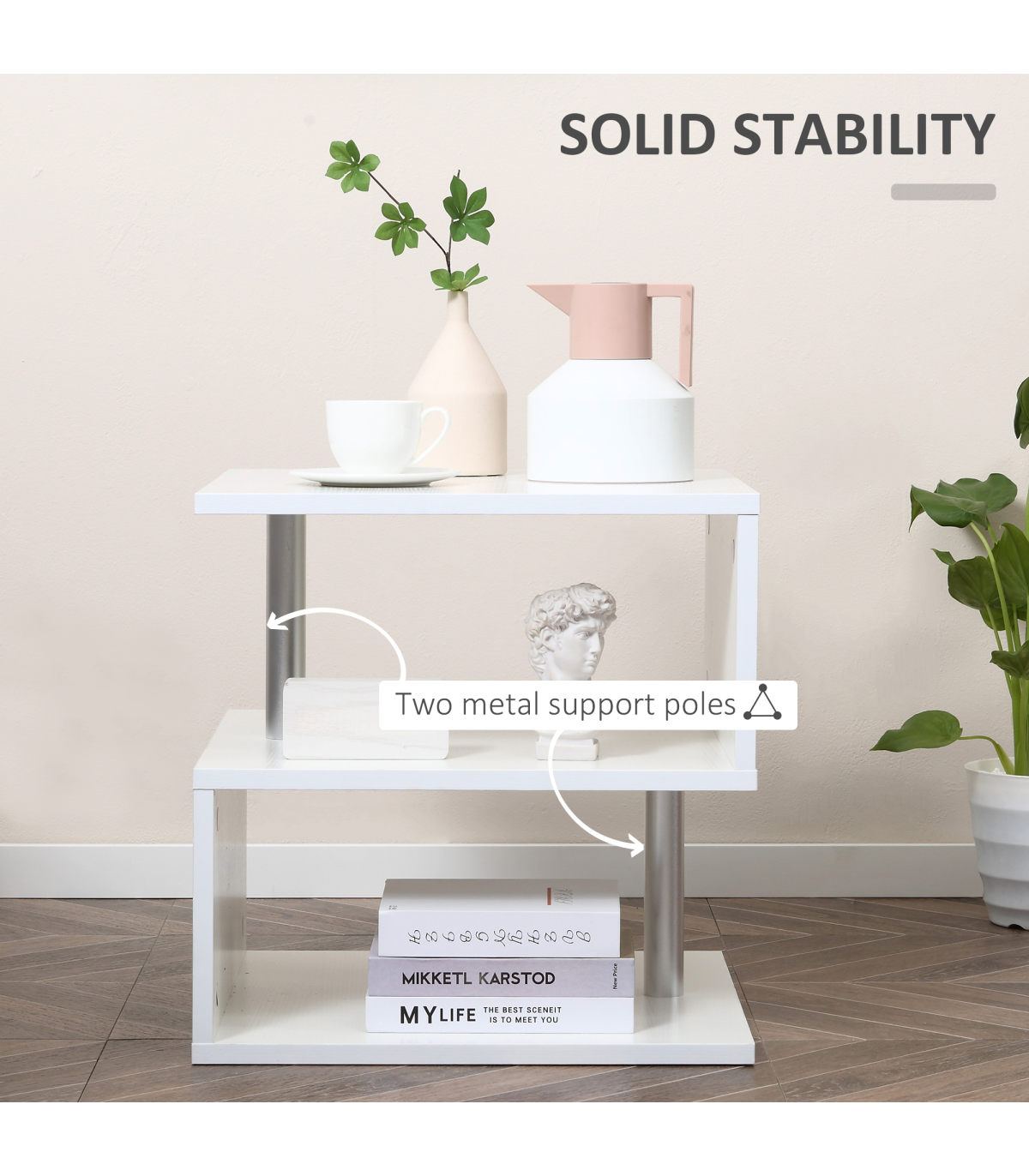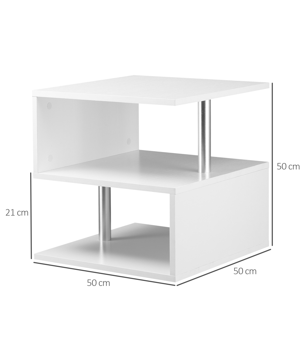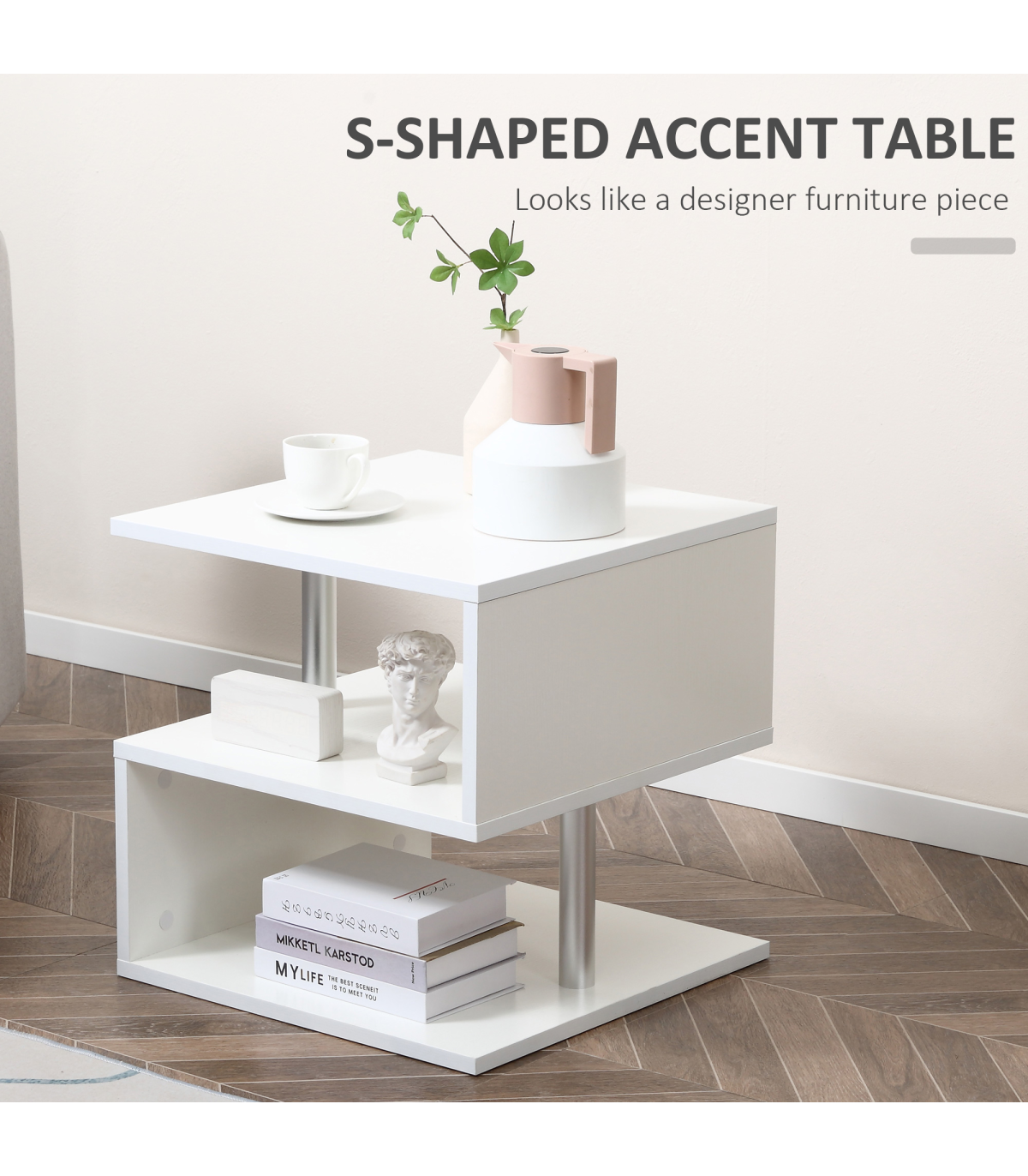 Enhance your living space with HOMCOM�s 3 tier s-shaped accent end table that is perfect for displaying your favorite decorative items, lighting, or plants in entryways, bedrooms and living rooms. It�s an artful way to place lamps, books, and collectibles in smaller spaces around furniture. Use it to complement your existing furniture or make it the centerpiece of any setting. The unique design features three tiers, two with eye-catching metal supporting poles, and a large open surface table top. The smooth water-resistant surface is easy to clean and maintain. For bold, contemporary style and endless possibilities, you can�t beat this latest exciting offering from HOMCOM.