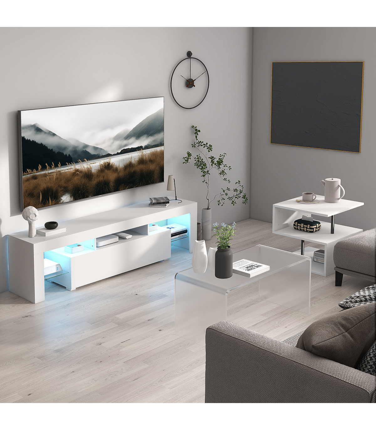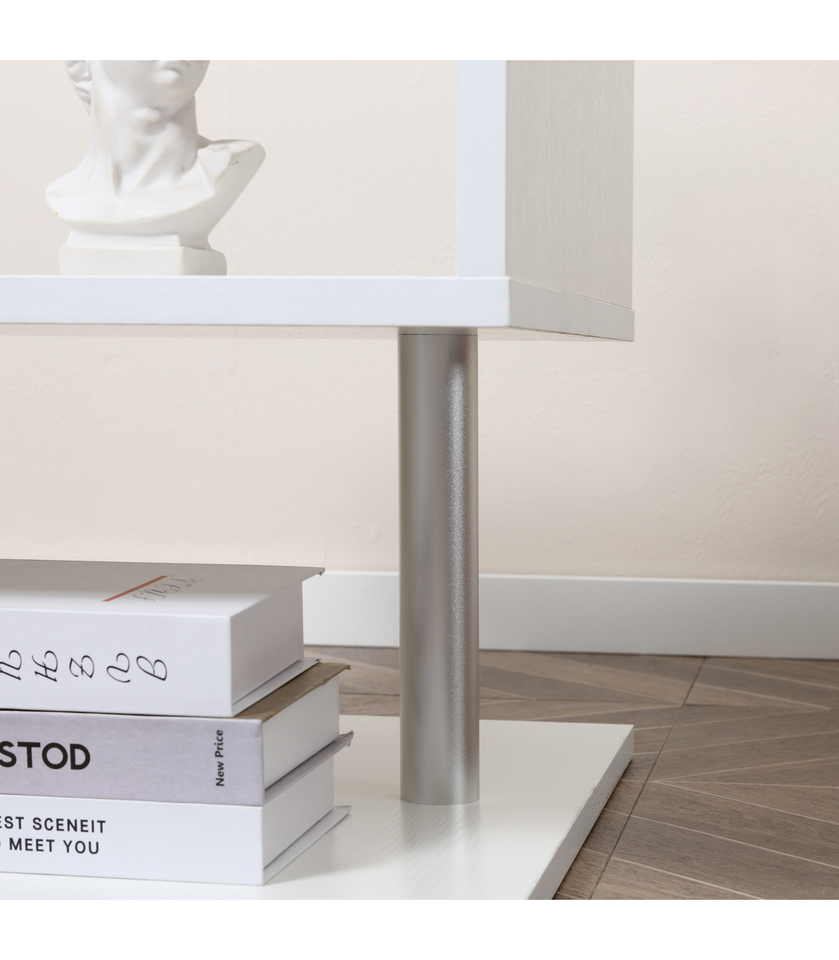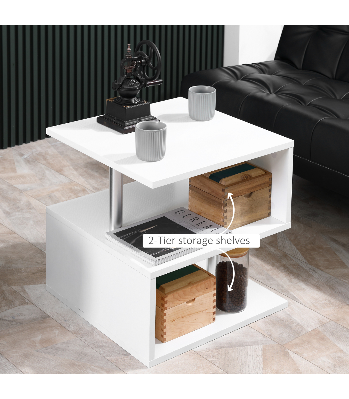 - "Side Table 2 Tier Storage Shelf Organizer Bookcase End Desk Stand Display - White" - Description: - Modern s-shaped accent table with wood grain for storage and display - Can be placed in the bedroom, living room, lounge, by the bed, next to the sofa - Can be used as a side table, lamp table, decorative display table, or bookshelf - Constructed of durable particle board and metal poles for long-term use - Features 2-tier shelves and an open tabletop for storing items - Lightweight and space-saving design - Assembly required.