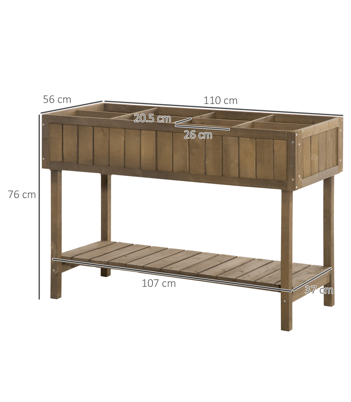 - Wooden Raised Bed Container Garden Plant Stand 8 Boxes 110x46x76cm Brown - Description: - Crafted from fir wood with water-resistant paint all over to ensure prolonged strength and reliability both indoors and outdoors - Features eight separate cubes, providing plenty of room for you to grow and nurture plants flowers, vegetables, herbs and fruits etc. - Drainage hole on the bottom of each cube - Lower shelf for extra storage room – great for gardening tools and equipment - Four feet for elevated design, prevents the ground and grass from touching the potter - Maximum weight 80kg, assembly required