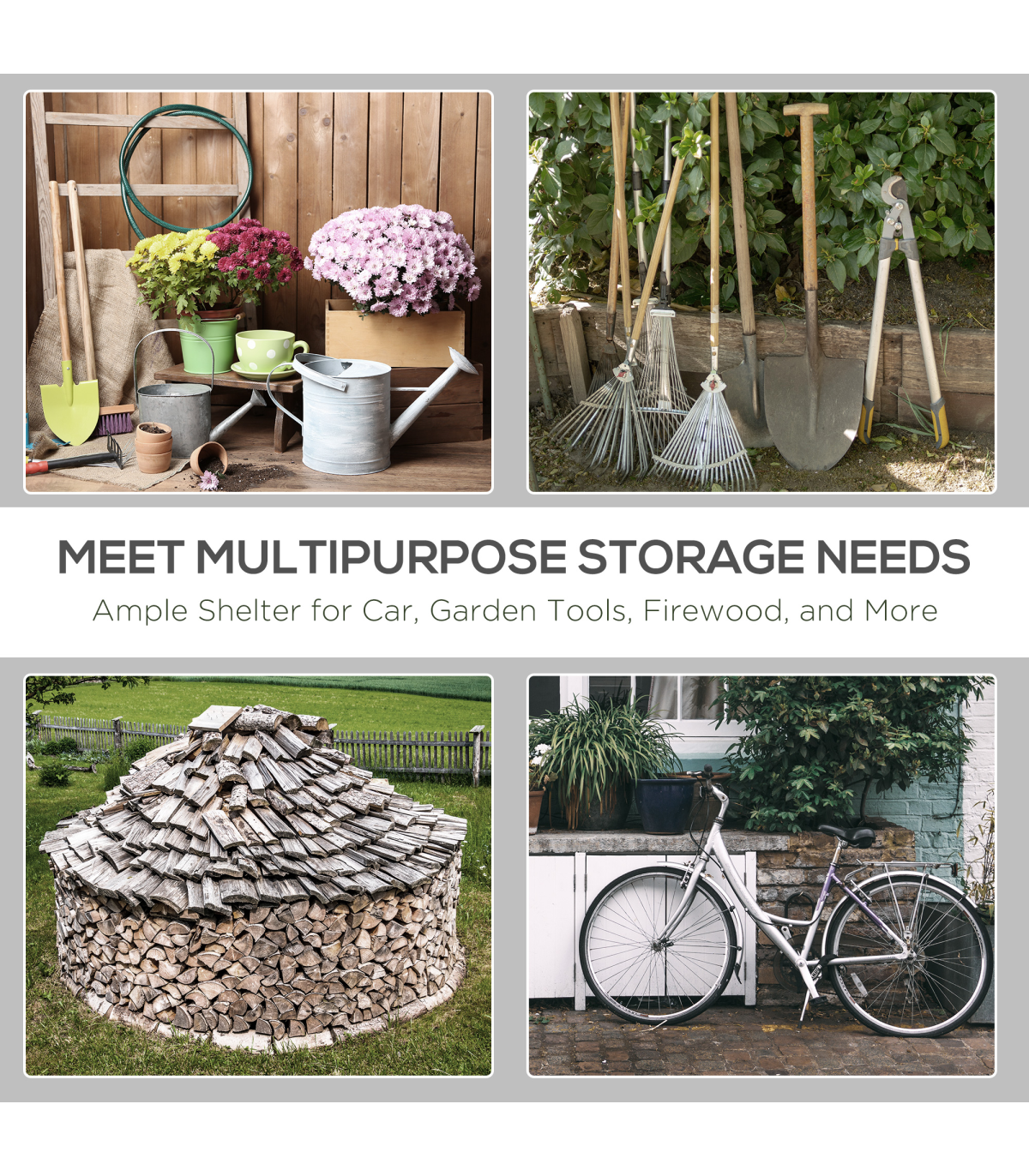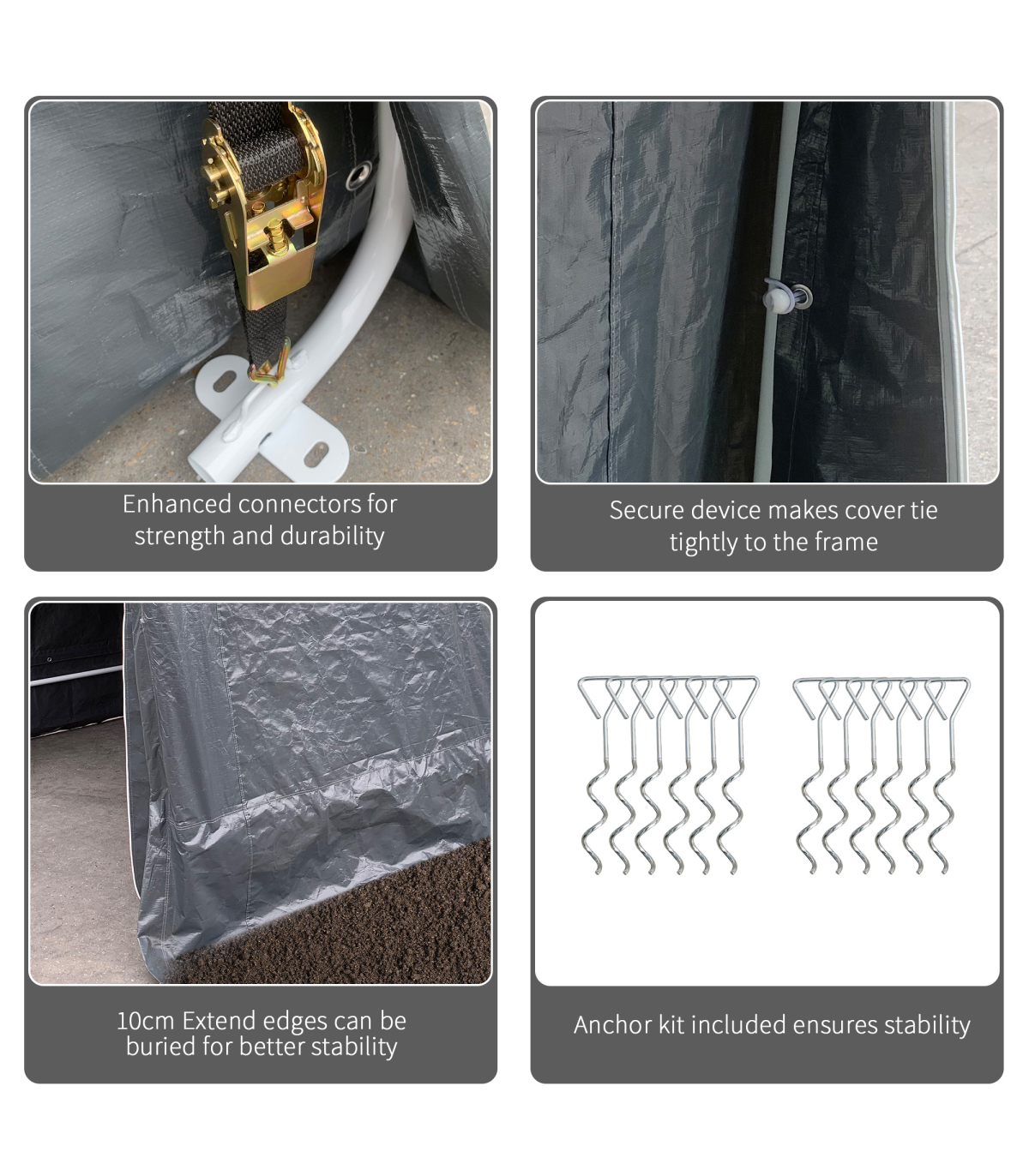 Garden storage shed just got serious. Go for this swish and spacious 9ft x 7.5ft motorcycle shelter from Outsunny. A metal frame for a strong core structure, with ground pegs included to pin to the ground for extra stability. It comes with a plastic fabric cover, keeping inside sheltered from light wind and rain. The front and back doors allows easy access in and out it's ideal for riding your bike outdoors. Whatever it is - garden/outdoor equipment, outdoor bike storage will keep safe.