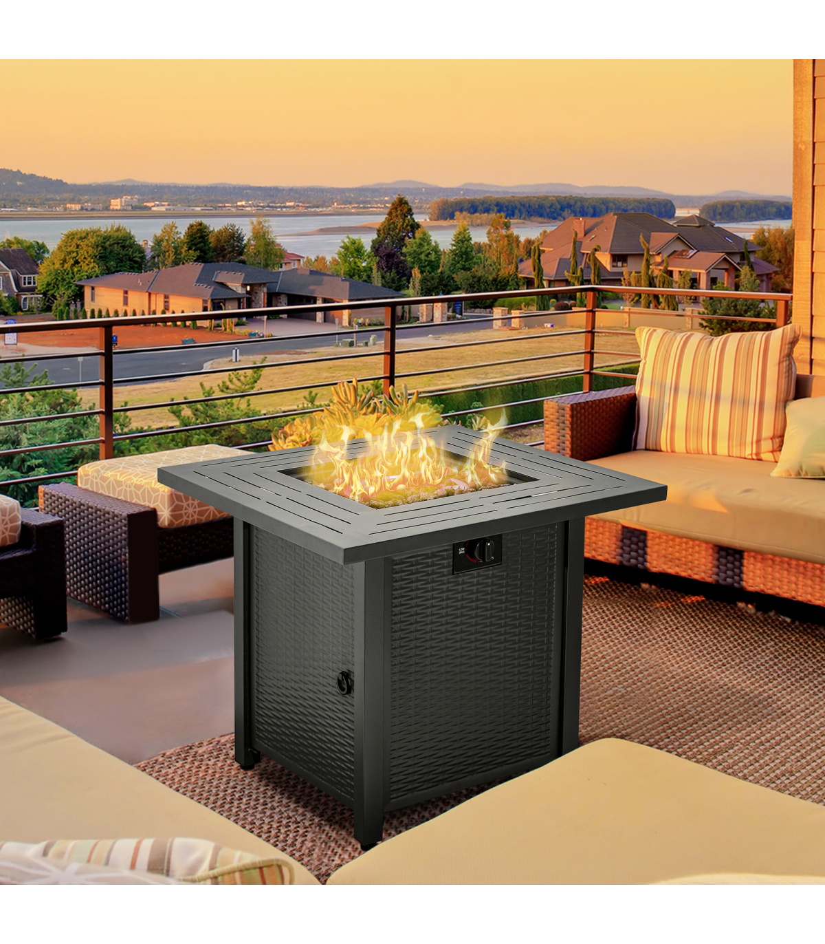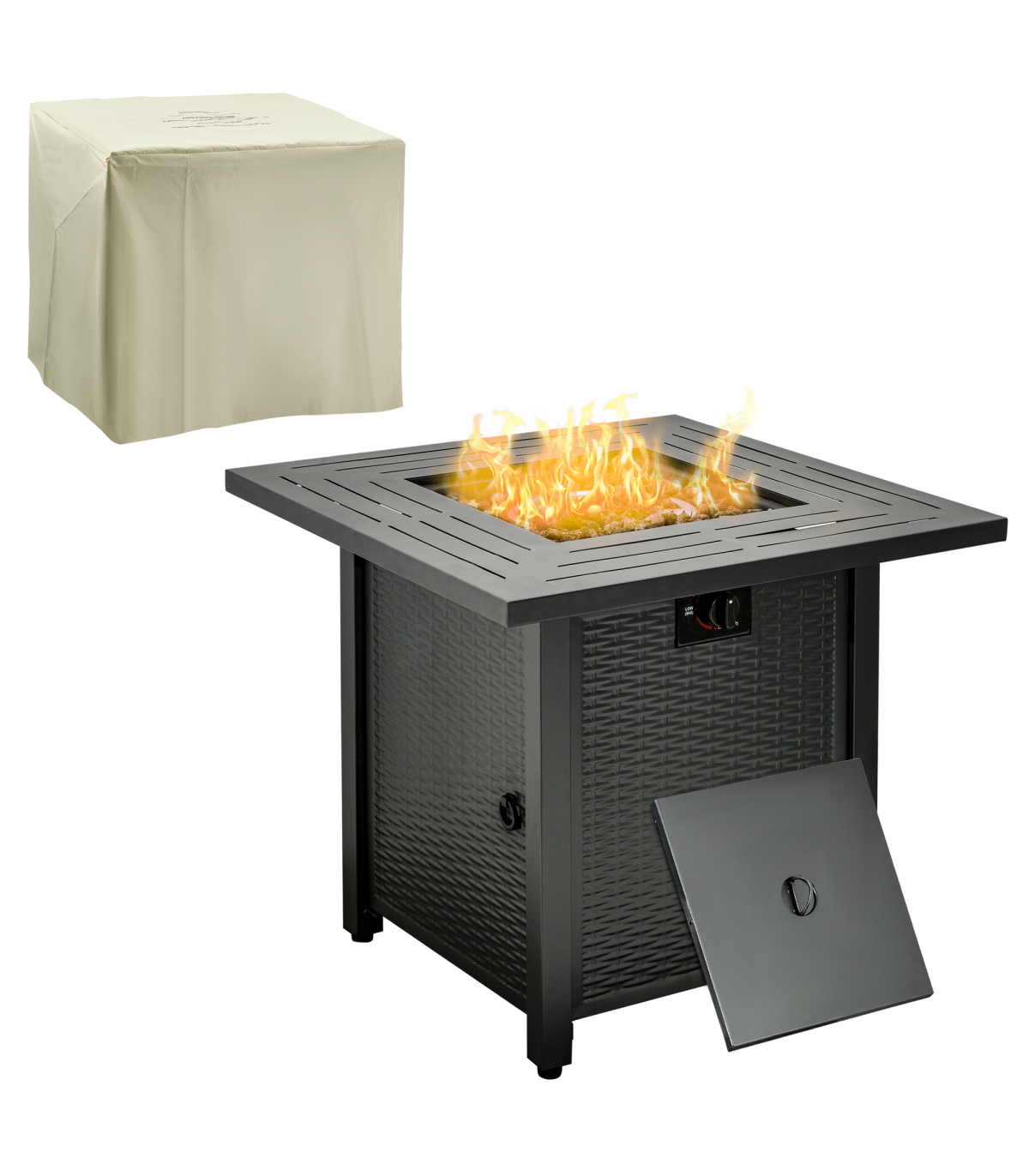 Square Propane Gas Fire Pit Table Rattan Smokeless Patio Heater Lava Rocks & Lid