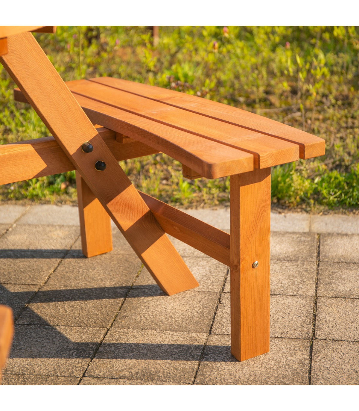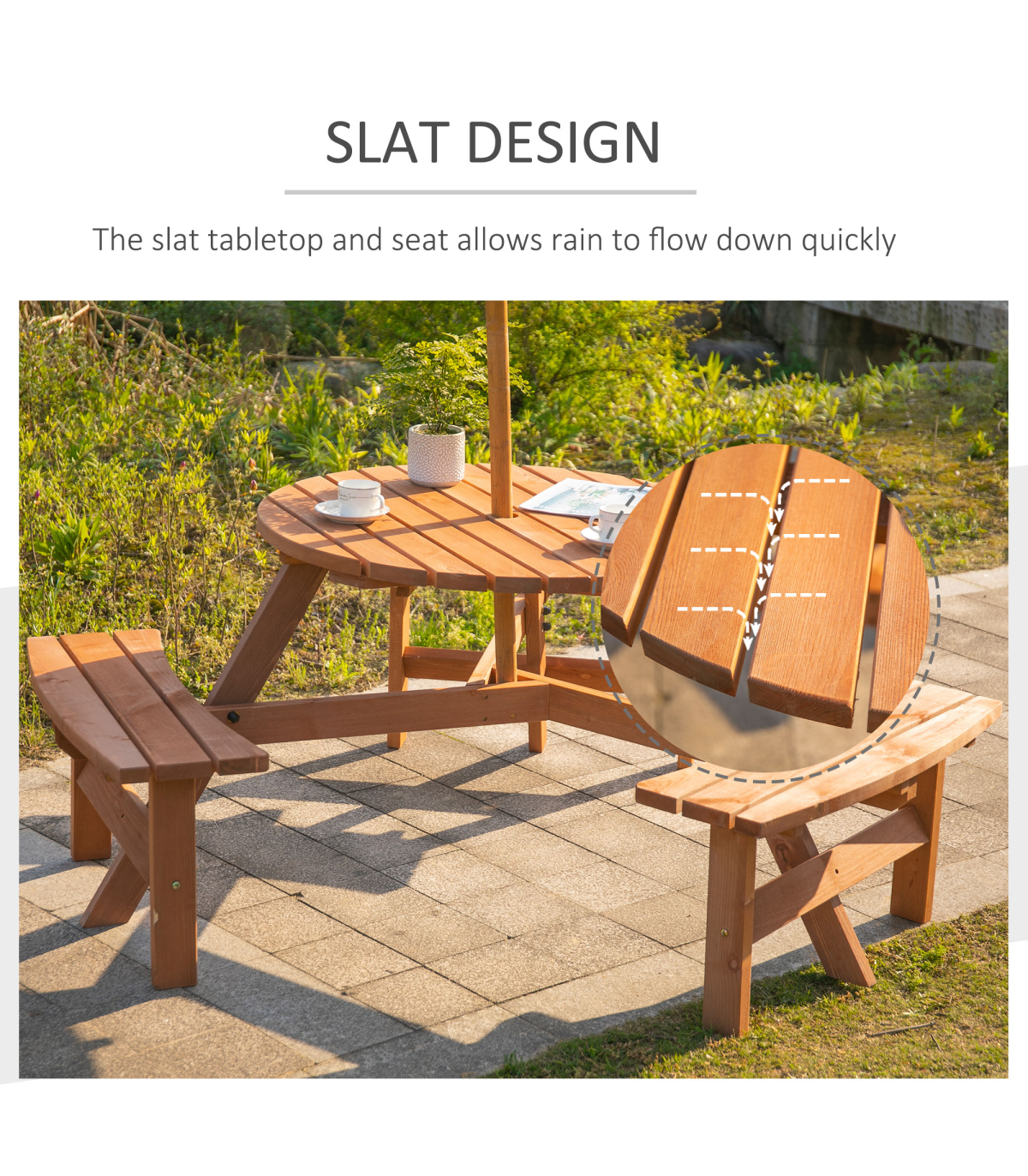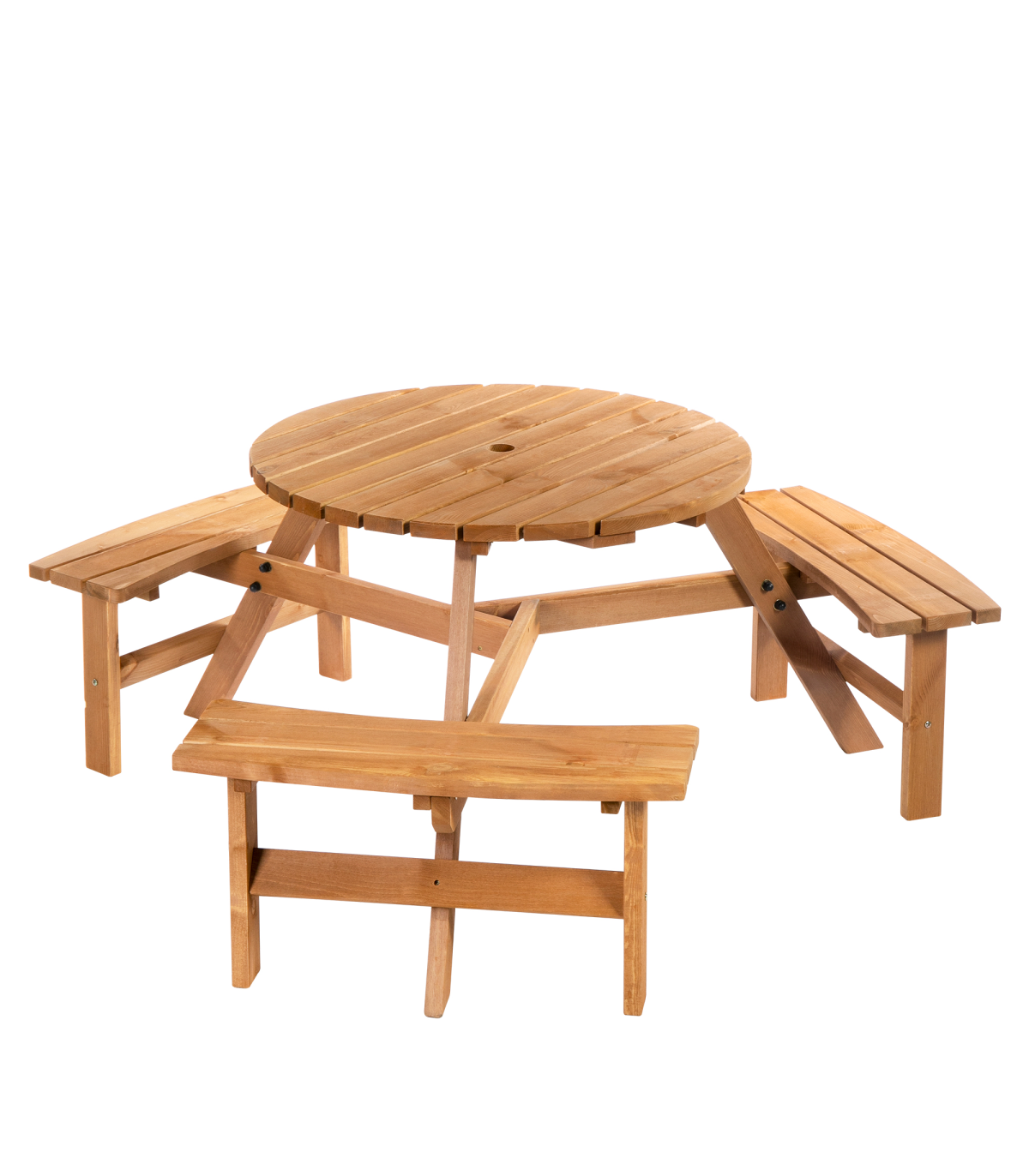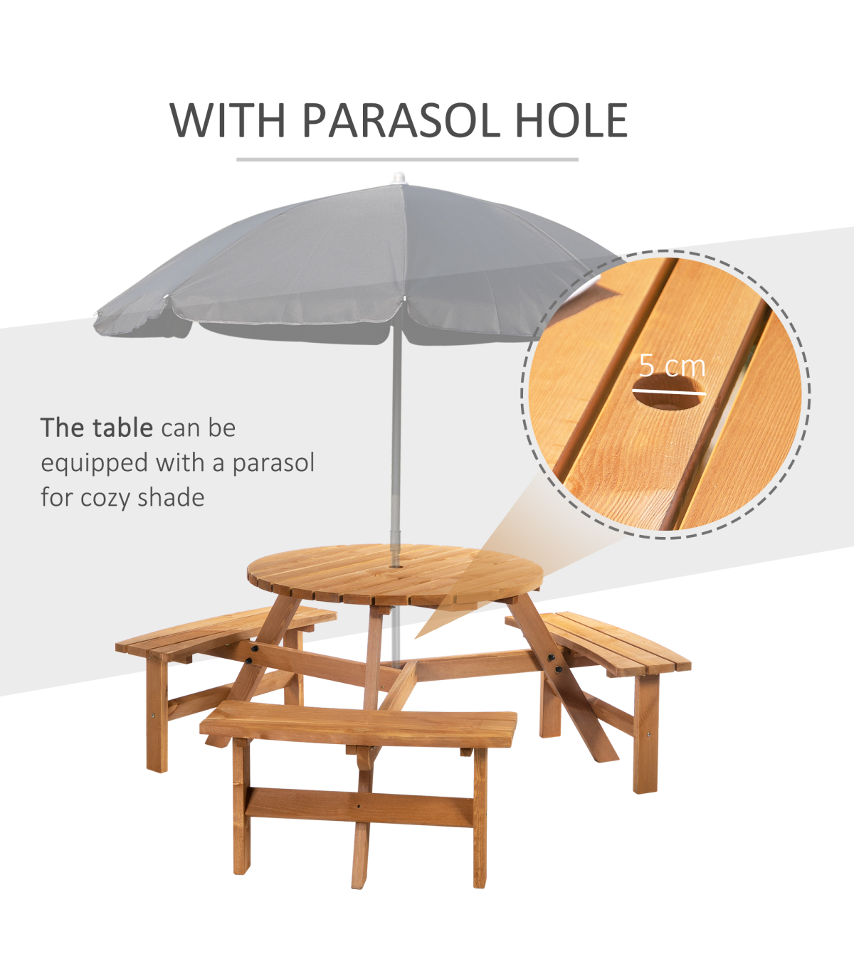 Table with 3 attached benches Wooden frame construction for long term use Perfect for outdoor activities and garden use Hole in the center to add Parasol umbrella to keep you protected from the sun Assembly required
