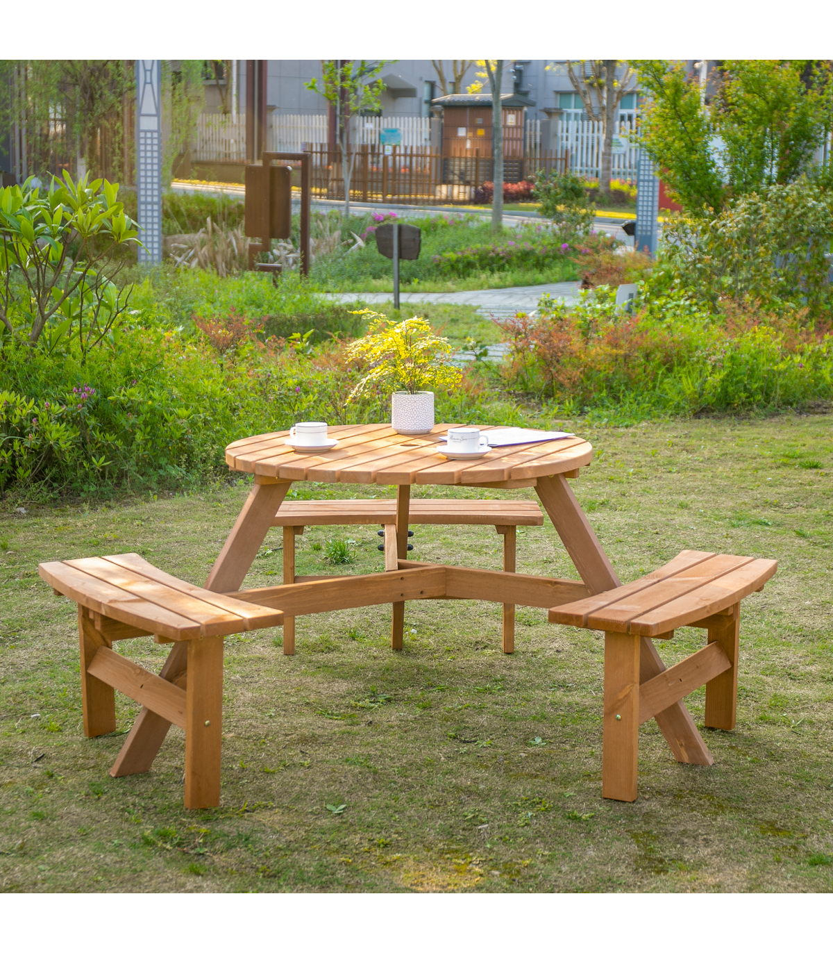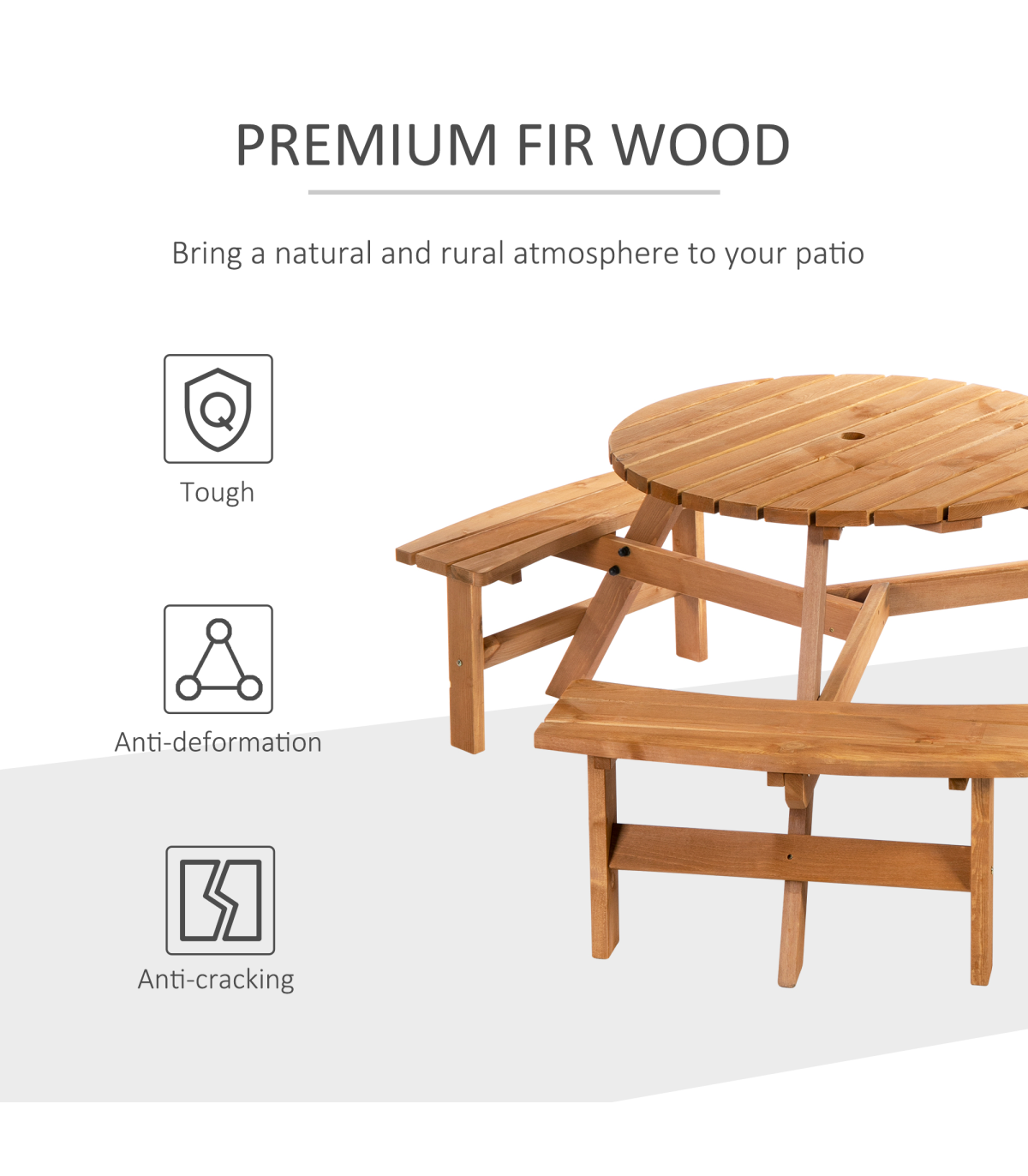 Outsunny Round Table W/3 Attached Benches-Fir Wood