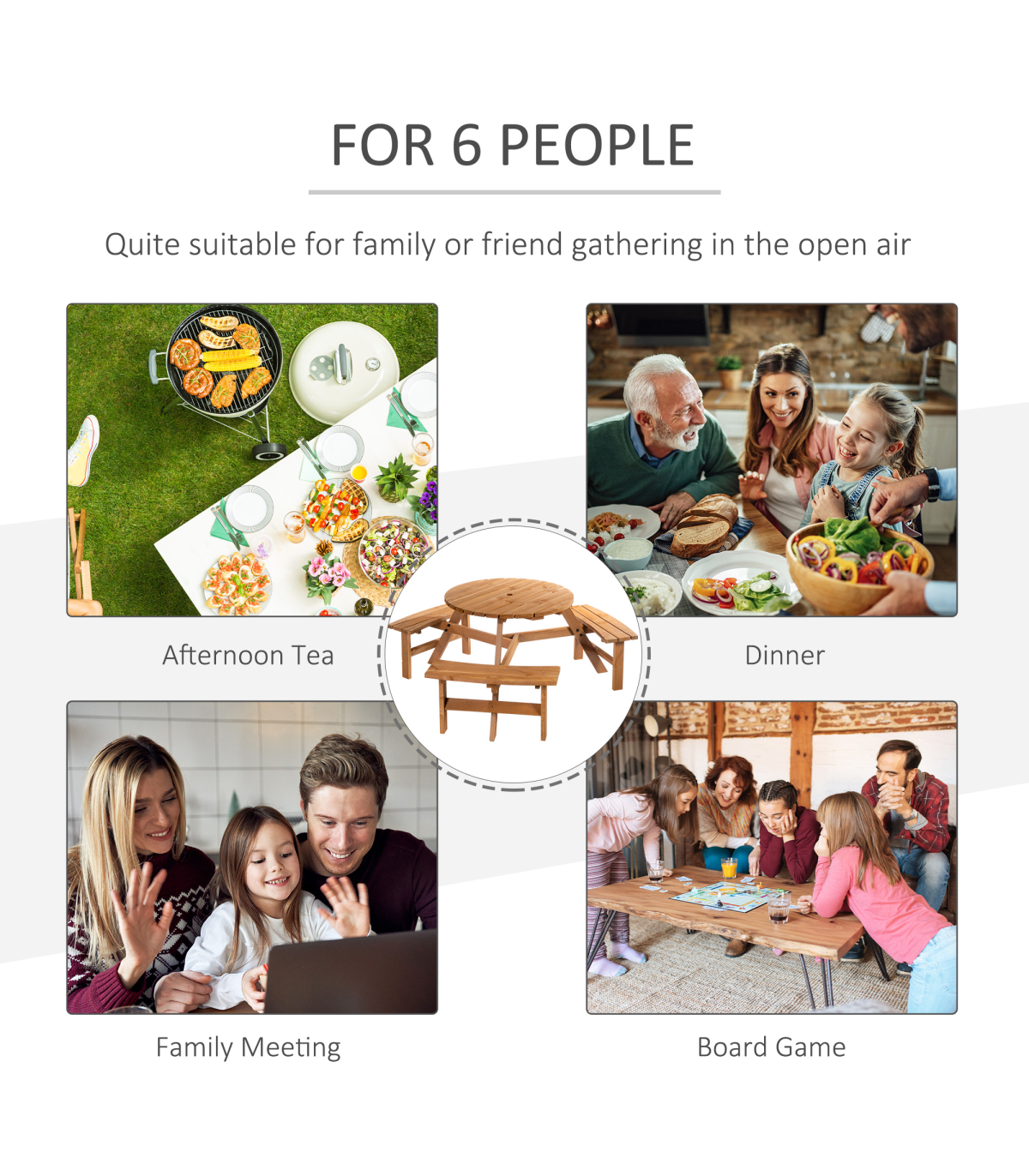 This Outsunny wooden bench table set is a great addition to any outdoor setting. Perfect for the garden or patio with the ability to accommodate 6 people easily. Designed in a circular shape with a table and 3 benches providing ample room to place drinks and food. The table also has a hole to add a parasol umbrella to keep you out of the sun. The unit is made from fir wood offering strength and stability with long term use. It is ideal for the summer and will match excellent in your backyard.
