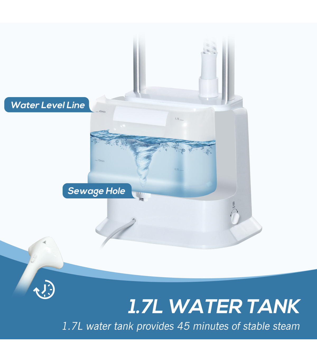 1.7L water tank can be removed to refill water and water volume is clearly visible