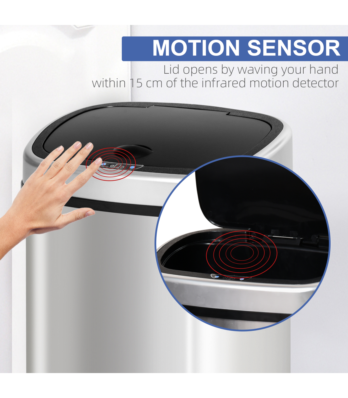Trash can lid opens by waving your hand within 15 cm of the infrared motion detector