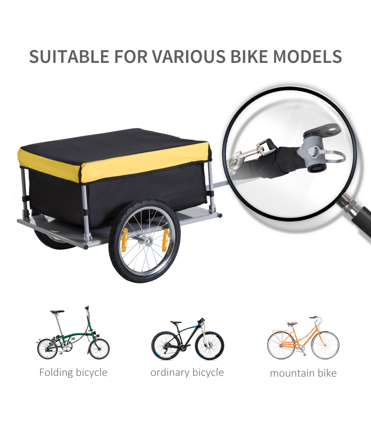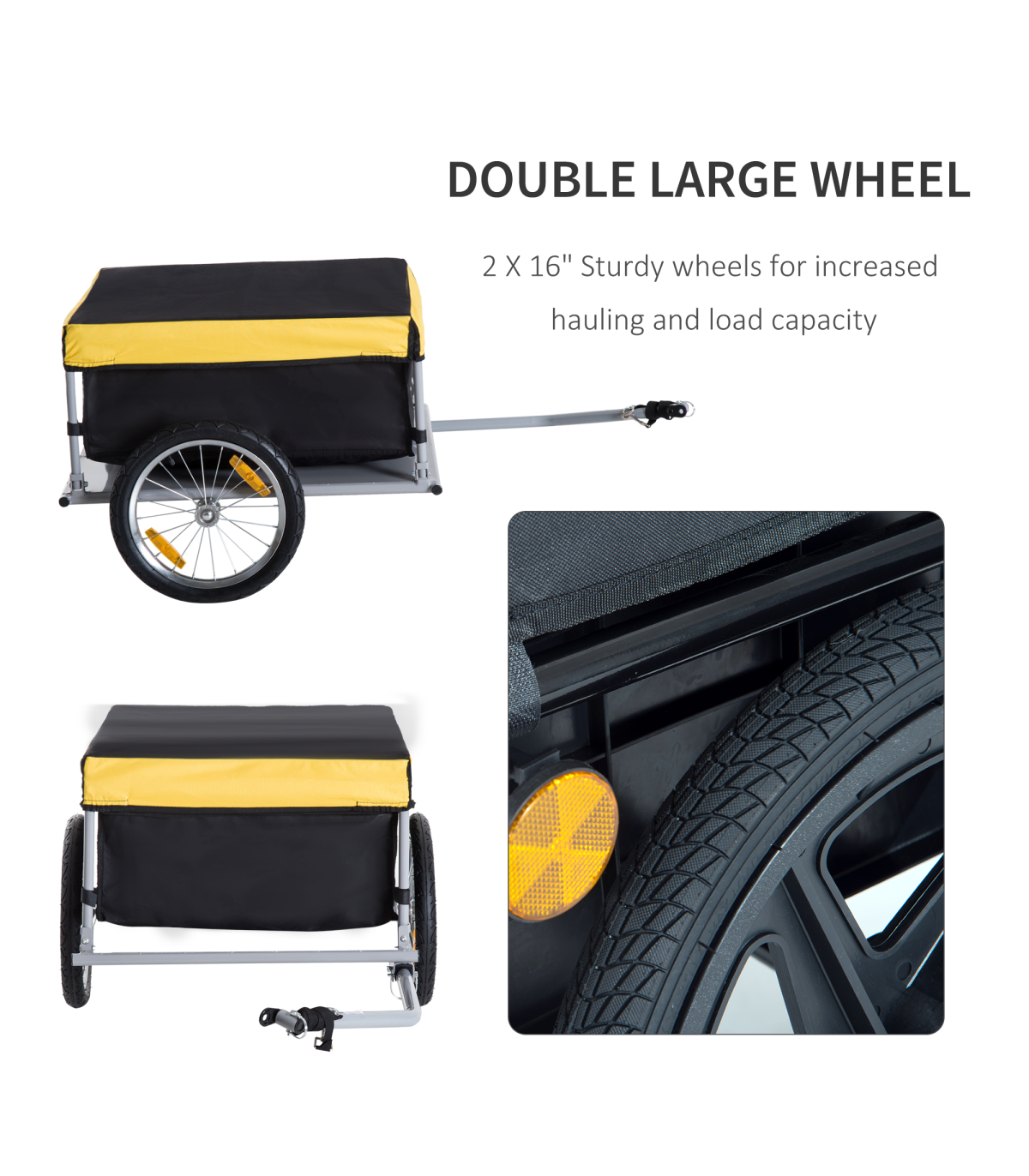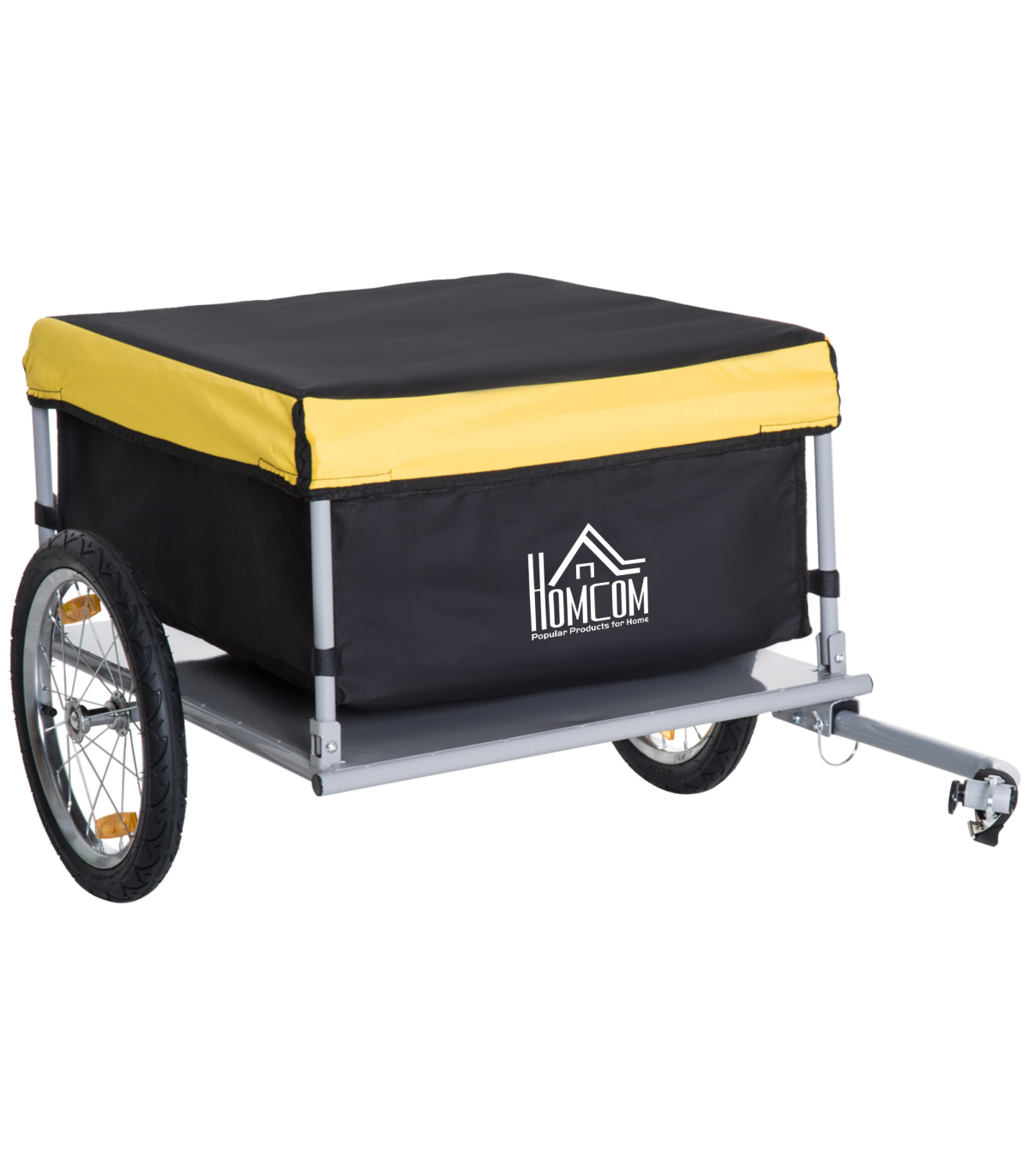 With this bicycle trailer from HOMCOM, the durable bag will keep all the contents safe and protected, with its bright yellow top making it visible to everyone. The bike trolley's solid steel base attaches to your bike quickly and gives the carry bag a balanced and safe platform. Features two wheels for smooth movement, with reflectors for safety in the dark. Both wheels are detachable so that you can easily pack and store this trailer. Attach our camping trailer to your bike back and go!