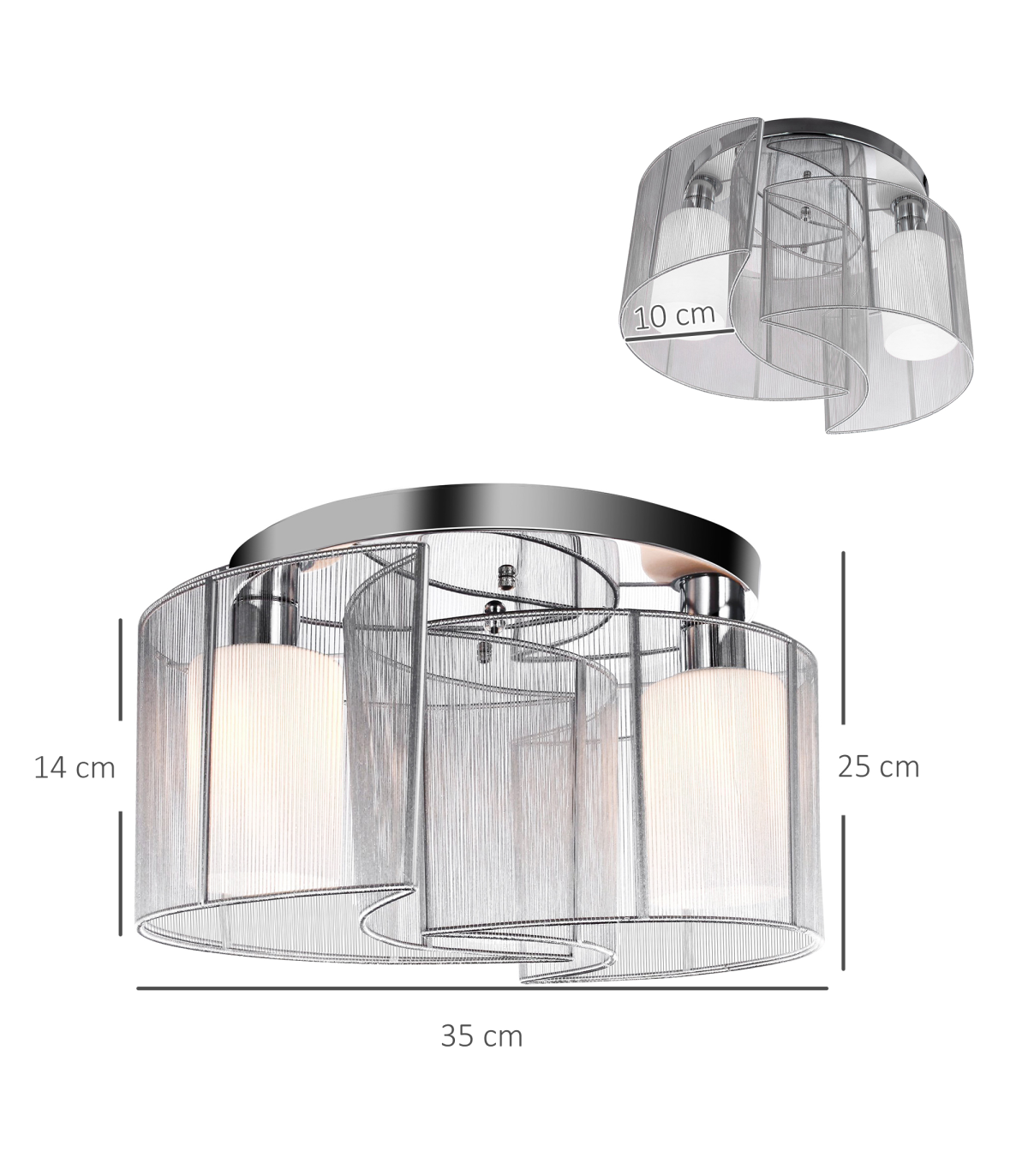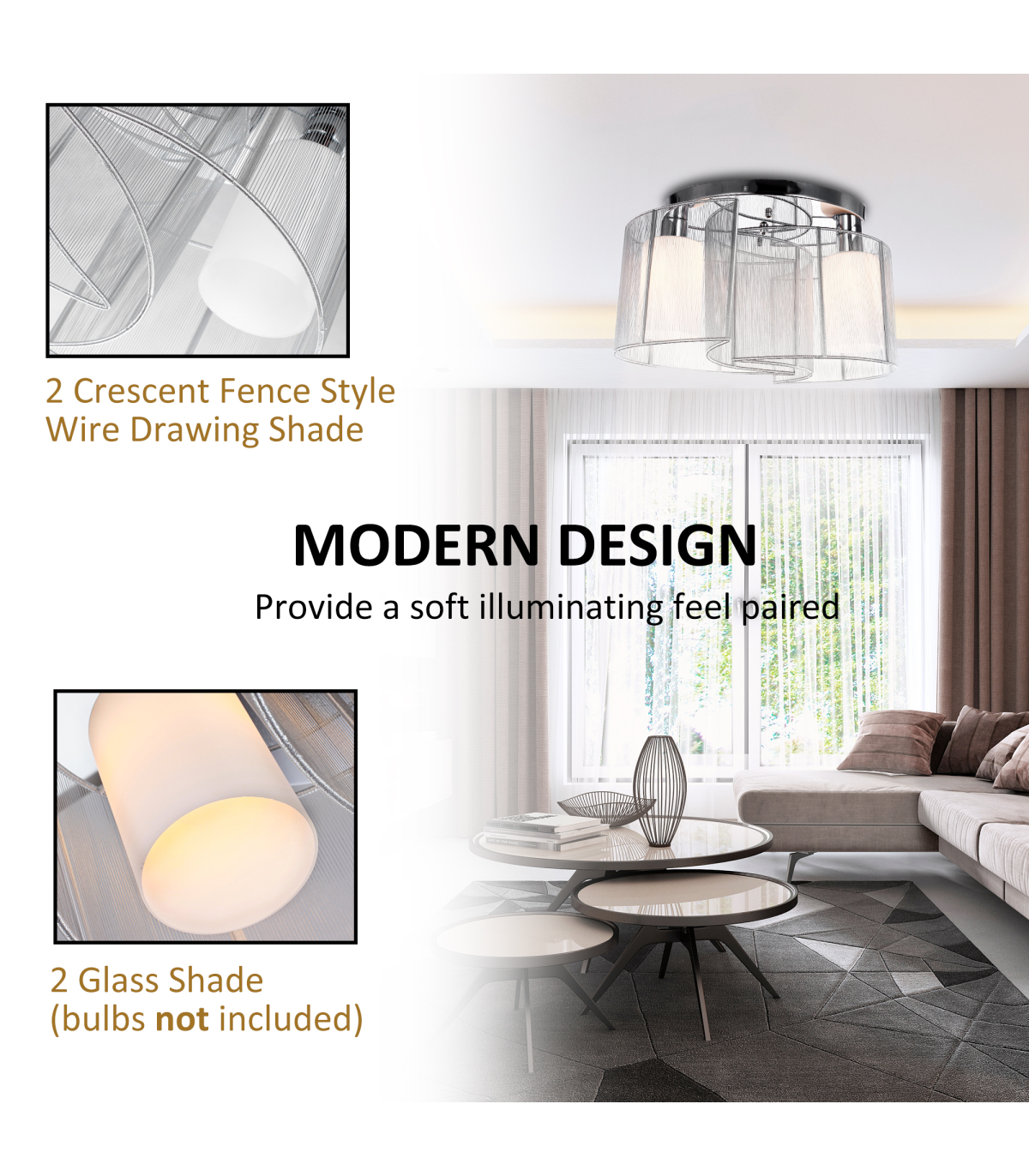 Made up of 2 crescent fence style wire drawing shade and 2 glass lightshades (bulbs not included)