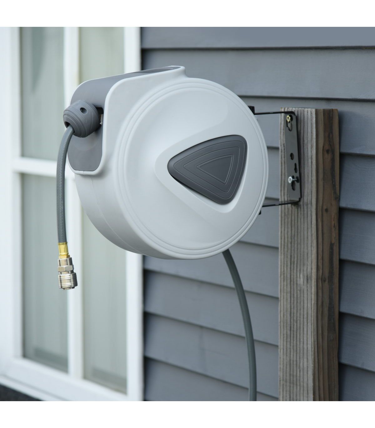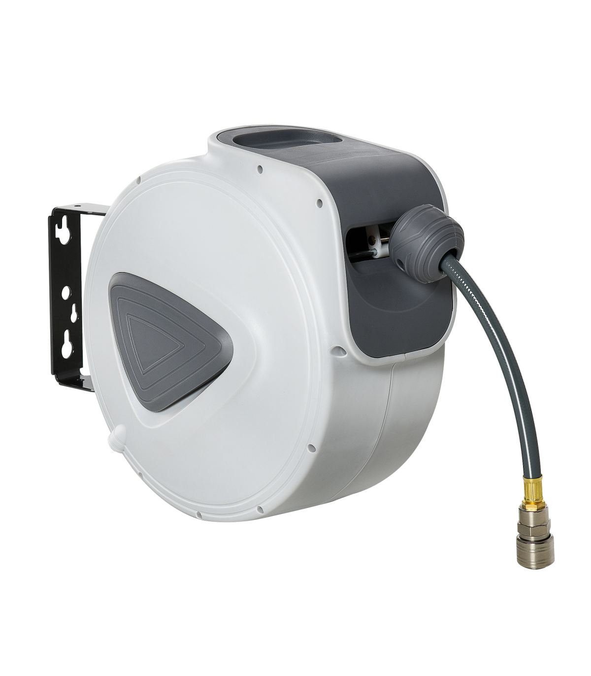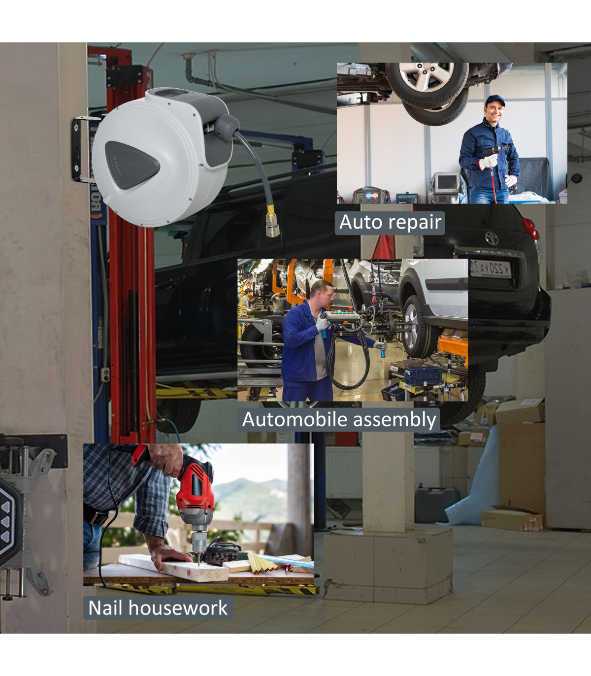 - "Retractable Air Hose Reel" - Description: - Ideal for home garages and other workshops - Can connect to other compressors and air accessories - Auto retract reels hose back smoothly and helps prevent tangles - Cord can lock into place - Mounts to wall if wanted, bracket rotates 180 - Features handle to carry easily