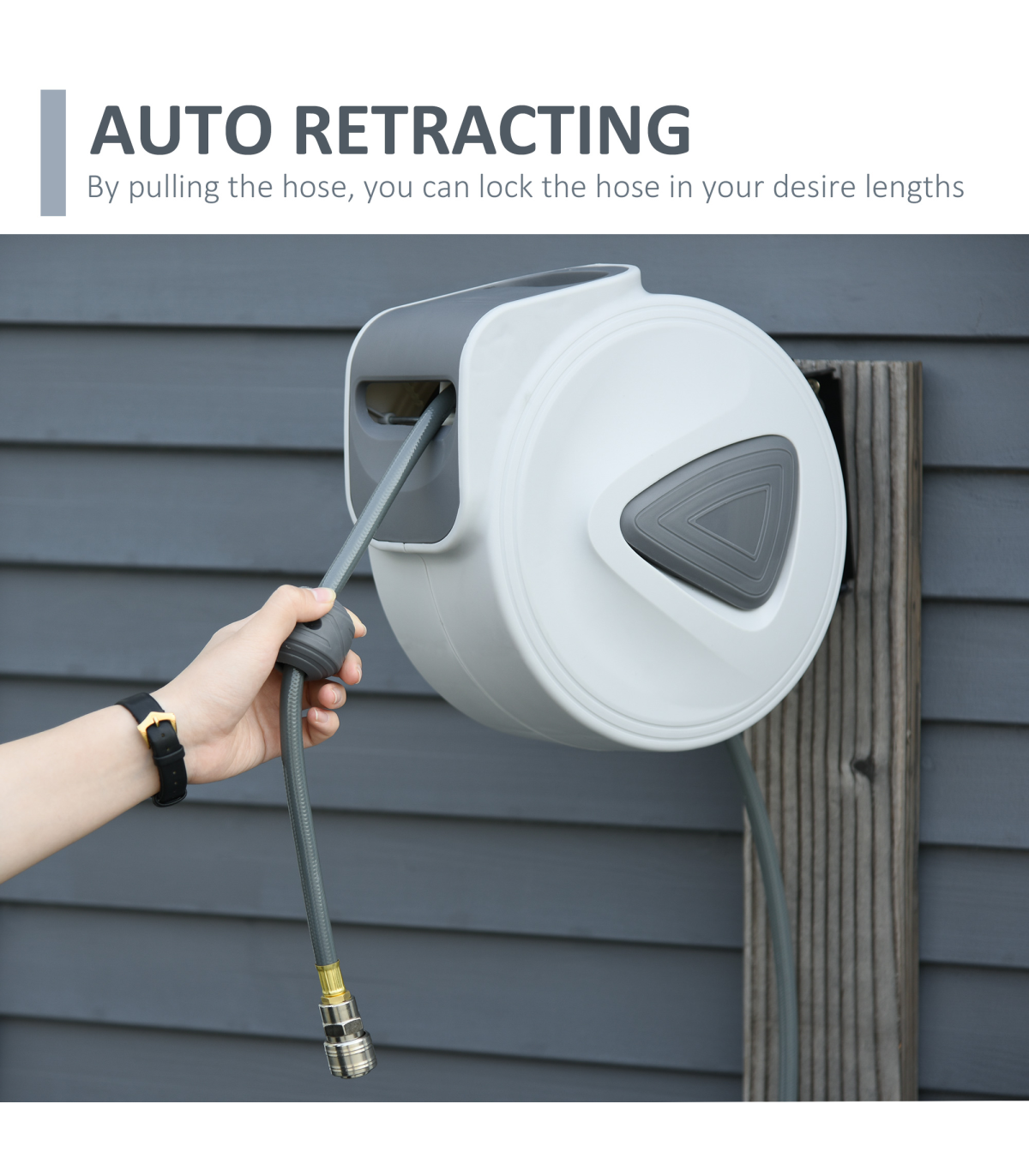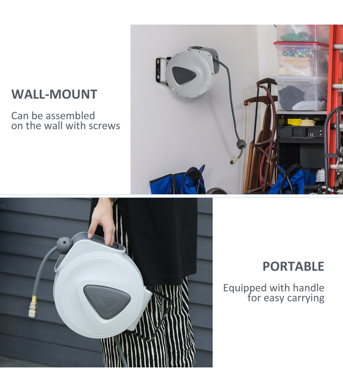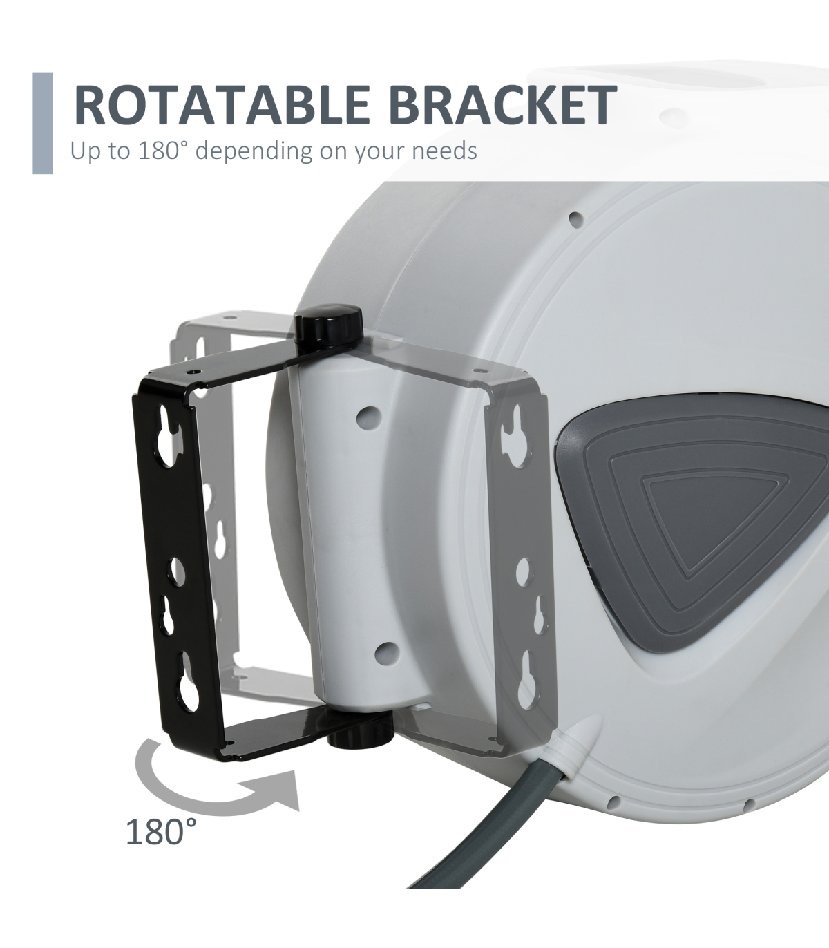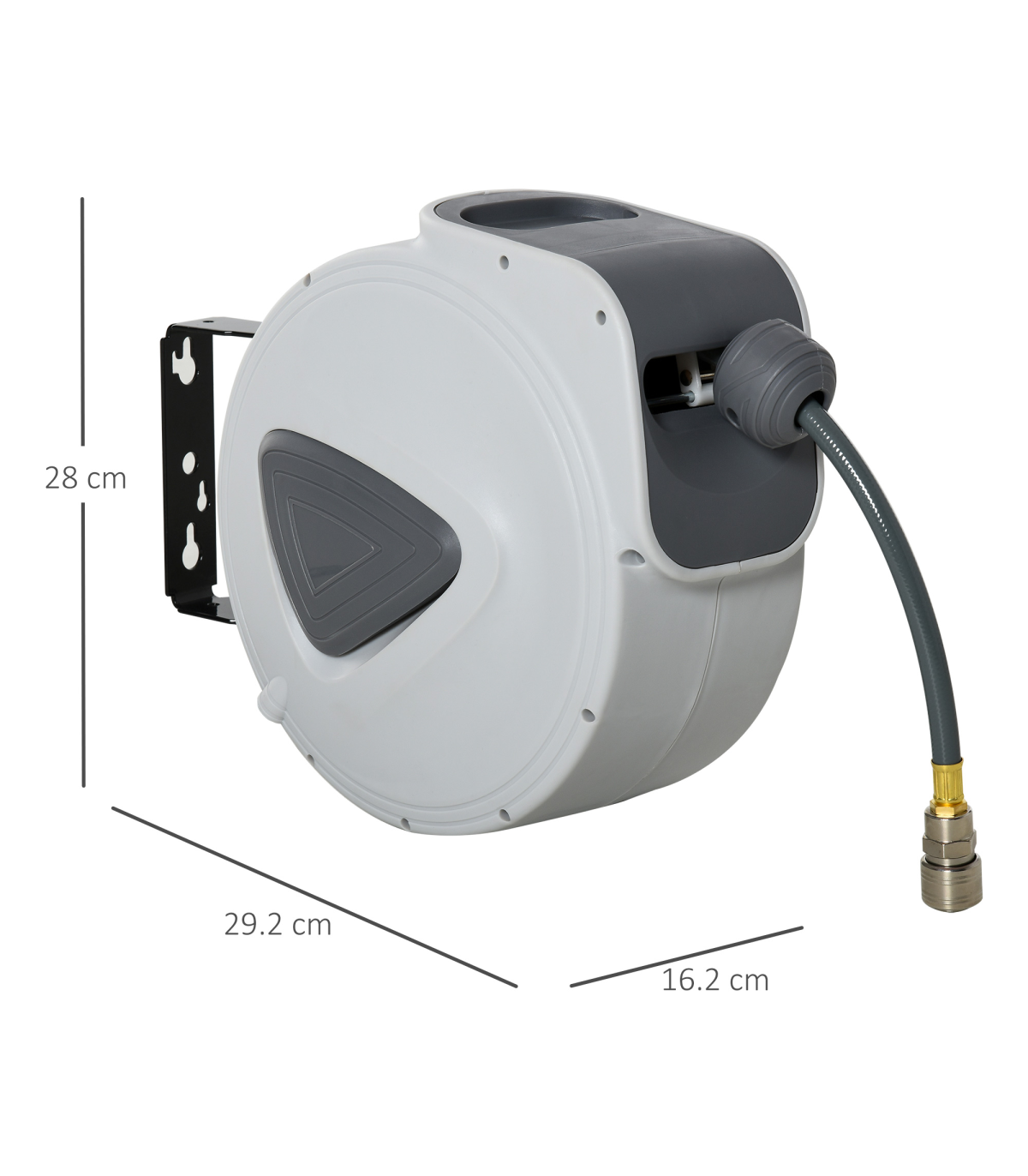 Refill tyres, use compressed air and more at any distance with this air hose reel from DURHAND. It can be mounted on the wall if wanted, with a built-in handle for easy carrying. The hose automatically retracts and can be locked in place to a particular length if required. It's compatible with other compressors and air accessories so it's truly multifunctional. Rotates 180� to move with you as you use it.