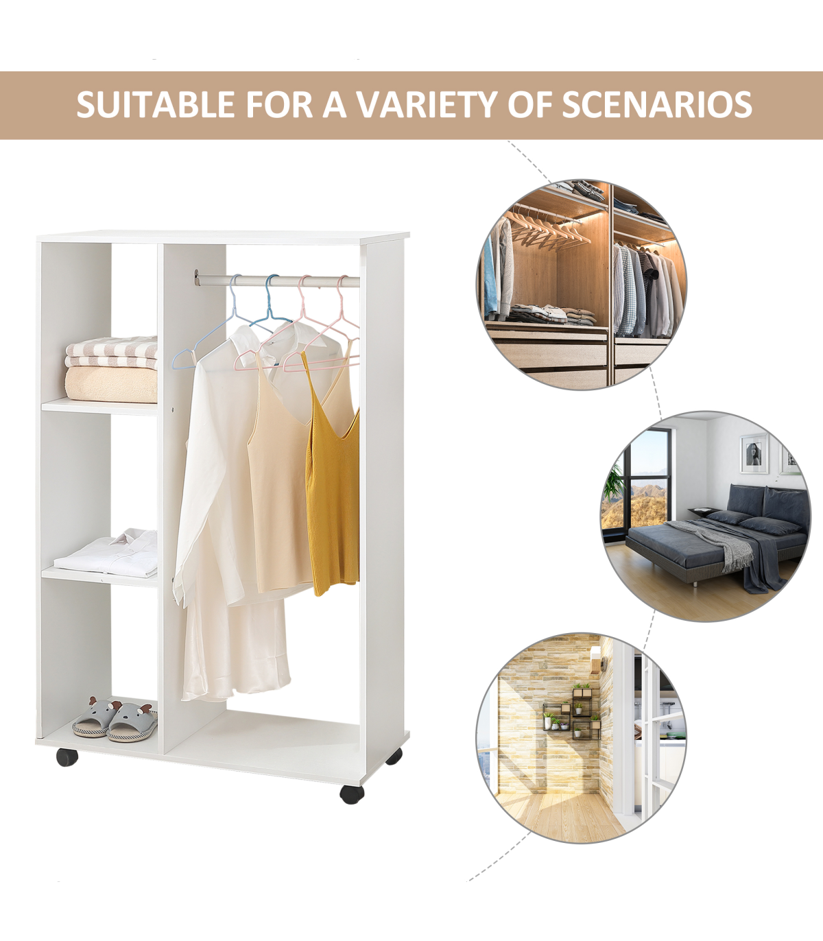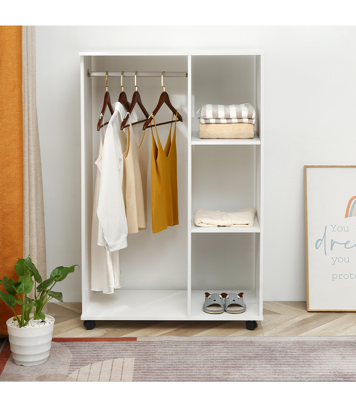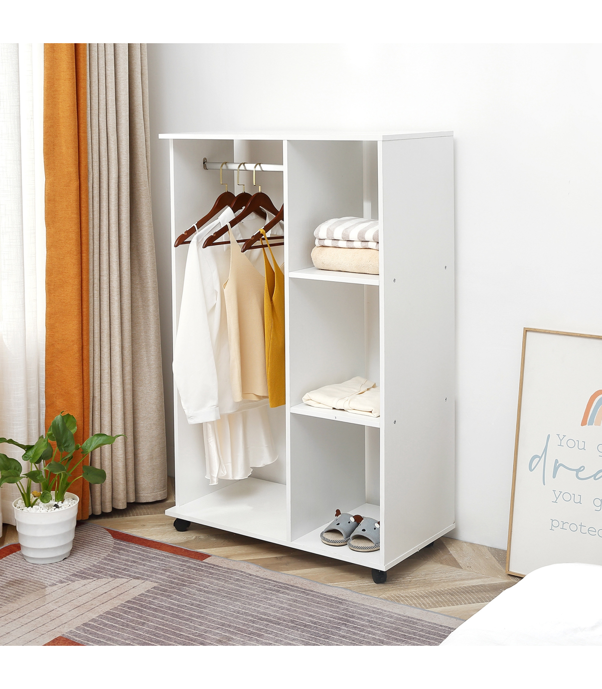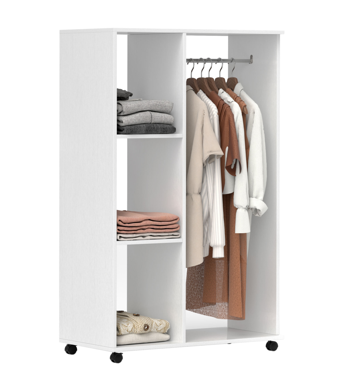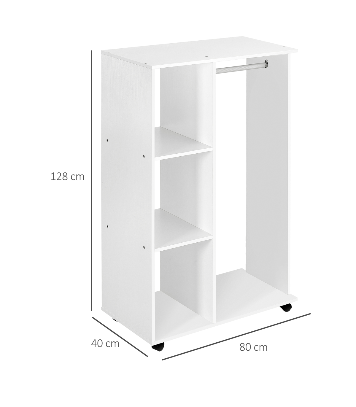- Storage Wardrobe White with Shelves - Description: - OPEN STORAGE: An airy approach to keeping all your clothing stored, keeping them smelling fresh. Great for homes and bedrooms short on space. - BIG STORAGE: A long hanging area with a strong aluminium rod on one side, with three open shelves on the other side providing plenty of space for keeping all your clothes tidy and organised. - PARTICLE BOARD FRAME: Strong and robust, with a melamine top coat for a smooth and easy-clean finish. - FOUR WHEELS: Allows you to move wardrobe around easily, two of which are lockable to keep in place when needed. - DIMENSIONS: - 128H x 80L x 40Wcm - Rail: 45.5Lcm - MAXIMUM LOAD WEIGHT: - Wardrobe: 10kg - Rail: 7.5kg - ASSEMBLY REQUIRED.
