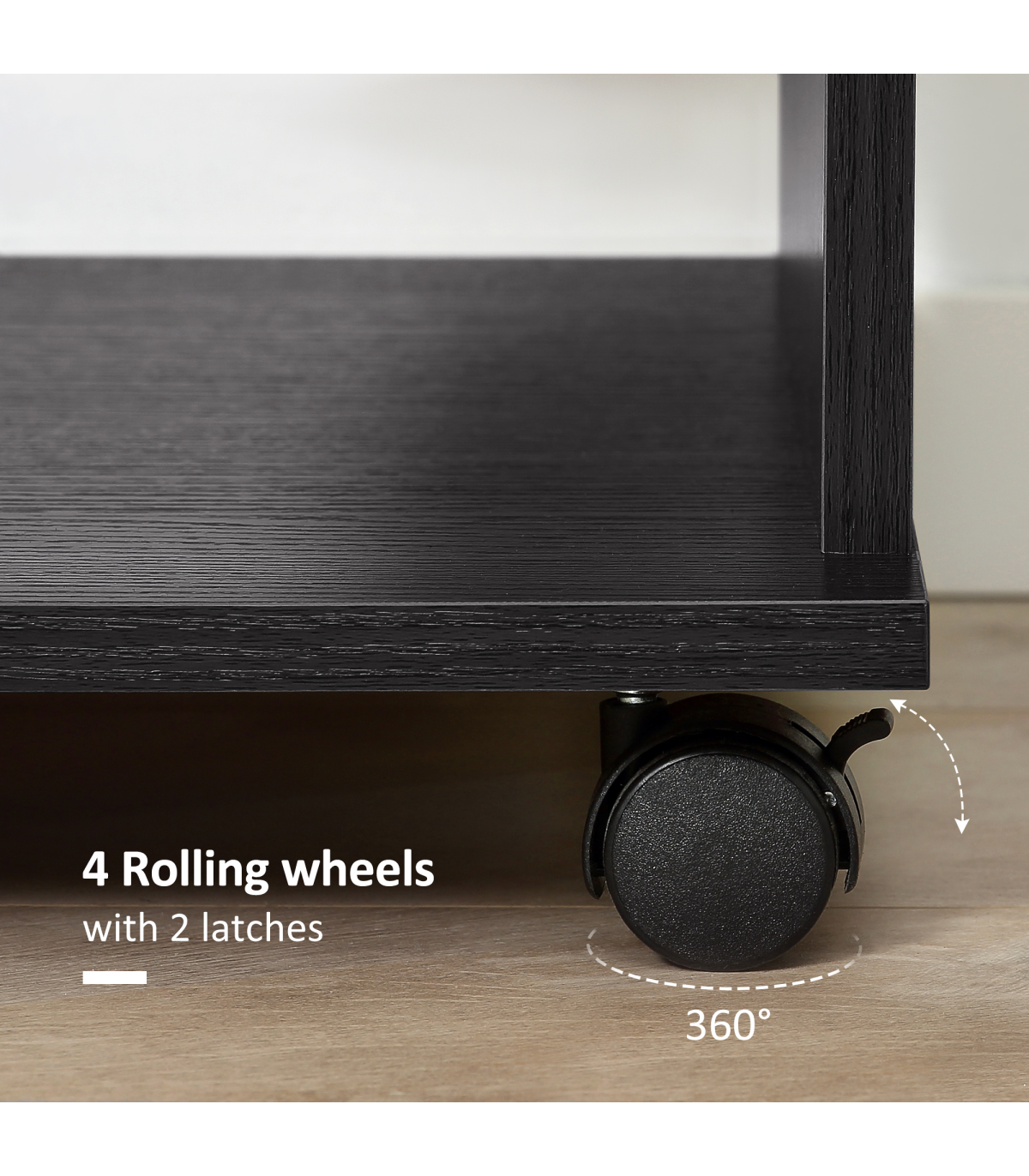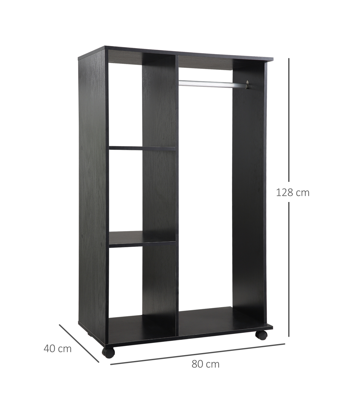 Rolling Open Wardrobe Hanging Rail Storage Shelves for Clothes, Black Description: - OPEN STORAGE: An airy approach to keeping all your clothing stored, keeping them smelling fresh. Great for homes and bedrooms short on space. - BIG STORAGE: A long hanging area with a strong aluminum rod on one side, with three open shelves on the other side - providing plenty of space for keeping all your clothes tidy and organized. - PARTICLE BOARD FRAME: Strong and robust, with a melamine top coat for a smooth and easy-clean finish. - FOUR WHEELS: Allows you to move wardrobe around easily, two of which are lockable to keep in place when needed. - DIMENSIONS: - Height: 128cm - Length: 80cm - Width: 40cm - Rail Length: 45.5cm - MAXIMUM LOAD WEIGHT: - Wardrobe: 15kg - Rail: 10kg - ASSEMBLY REQUIRED.