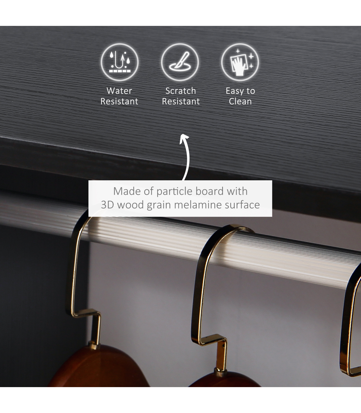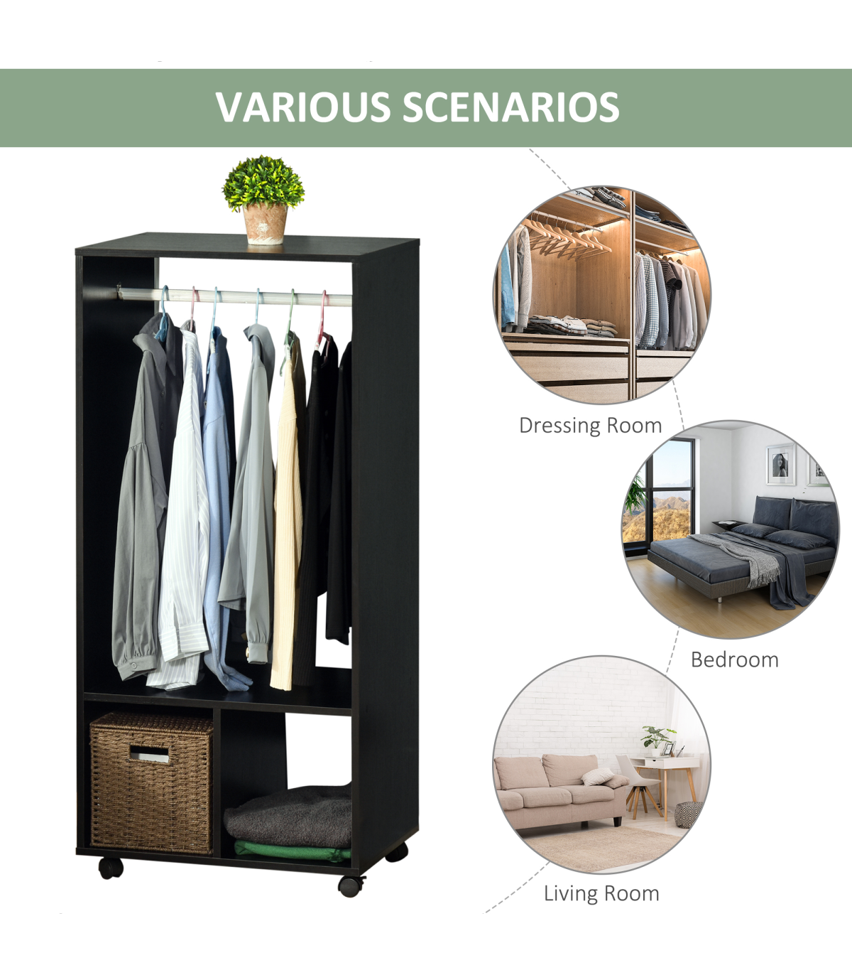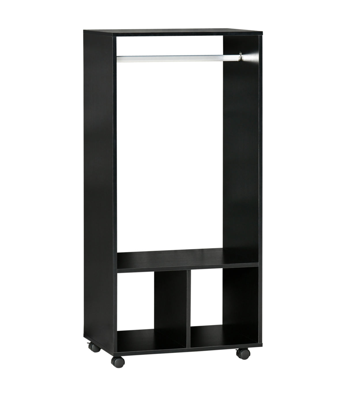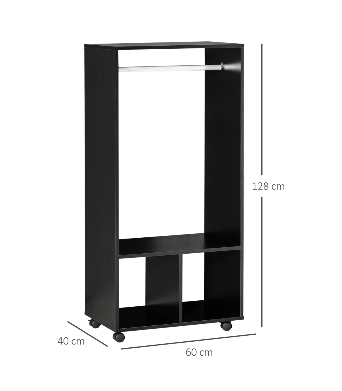 OPEN DESIGN: An easy way to grab your clothes, whenever. Also keeps them smelling fresh. Two bottom shelves suitable for folded clothes, shoes and bags.FOUR WHEELS: Easy to move the wardrobe around your home - even when full of clothes. Two can be locked so it stands in place.ALUMINIUM RAIL: Solid pole, holds clothing hangers securely in place. Easy to push hangers side-to-side.DIMENSIONS: 128H x 60L x 40Wcm. Shelf: 30H x 27.8W x 40Dcm.MAXIMUM LOAD: Whole: 15kg. Hanging rod: 5kg. ASSEMBLY REQUIRED.