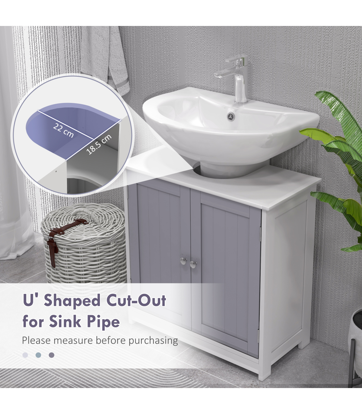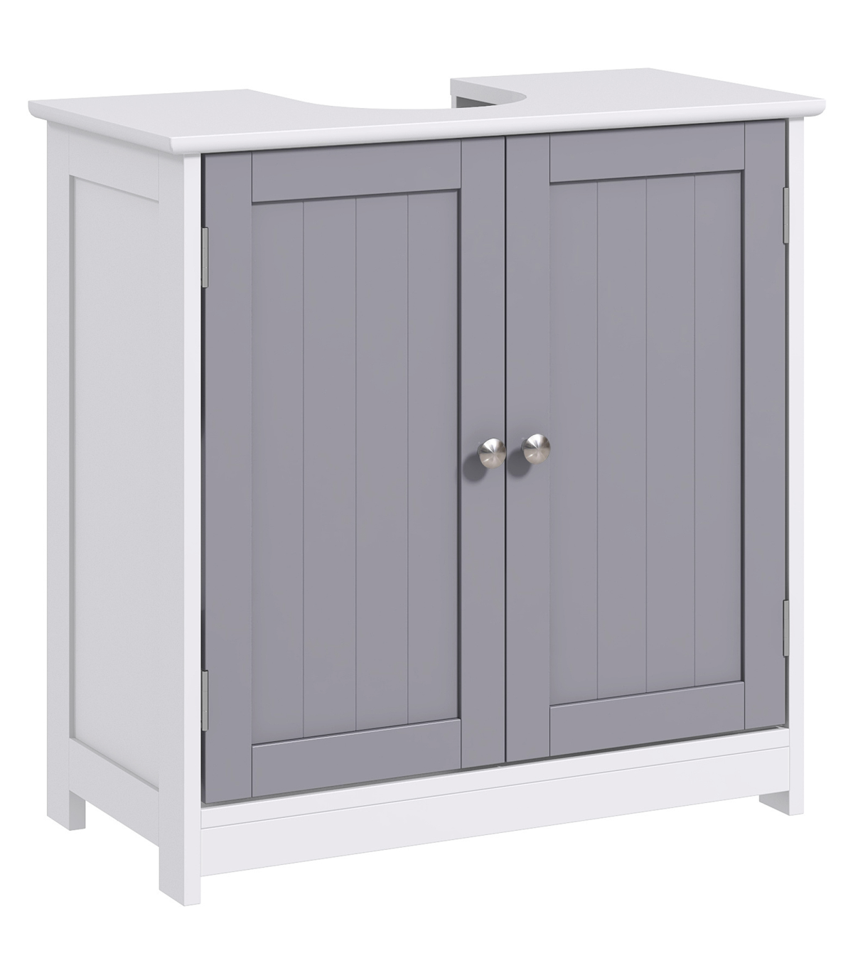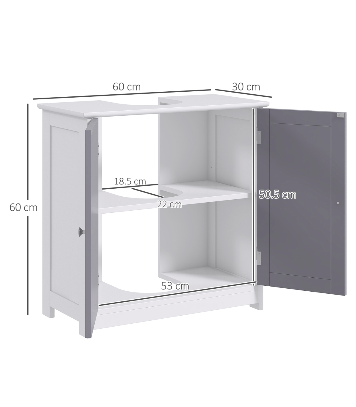 Kleankin 60x60cm Under-Sink Storage Cabinet with Adjustable Shelf - Grey White" Description: - UNDER-SINK STORAGE: Brings in extra storage room to an area hard to utilize. - 'U' shaped cut-out for the pipe: 18.5 x 22Dcm. Please measure the space before purchasing. - INNER SHELF: Creates two areas for storing and organizing toiletries and products. - Allows you to keep certain product separated for safety. - Can be adjusted up or down. - SOLID AND DURABLE: Crafted from MDF. - The structure can be relied upon for everyday use. - Smooth painted surface can be wiped clean easily. - FOUR FEET: Keeps unit balanced and elevates bottom for protection. - DIMENSIONS: 60H x 60L x 30Wcm. - Inner storage: 50.5H x 53W x 26.5Dcm. - MAXIMUM LOAD: 10KG. - ASSEMBLY REQUIRED.