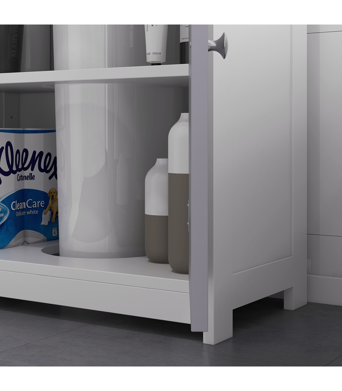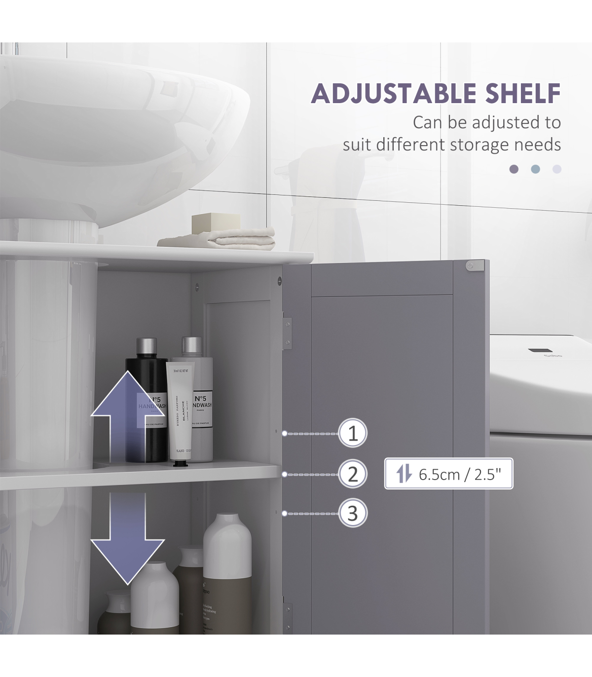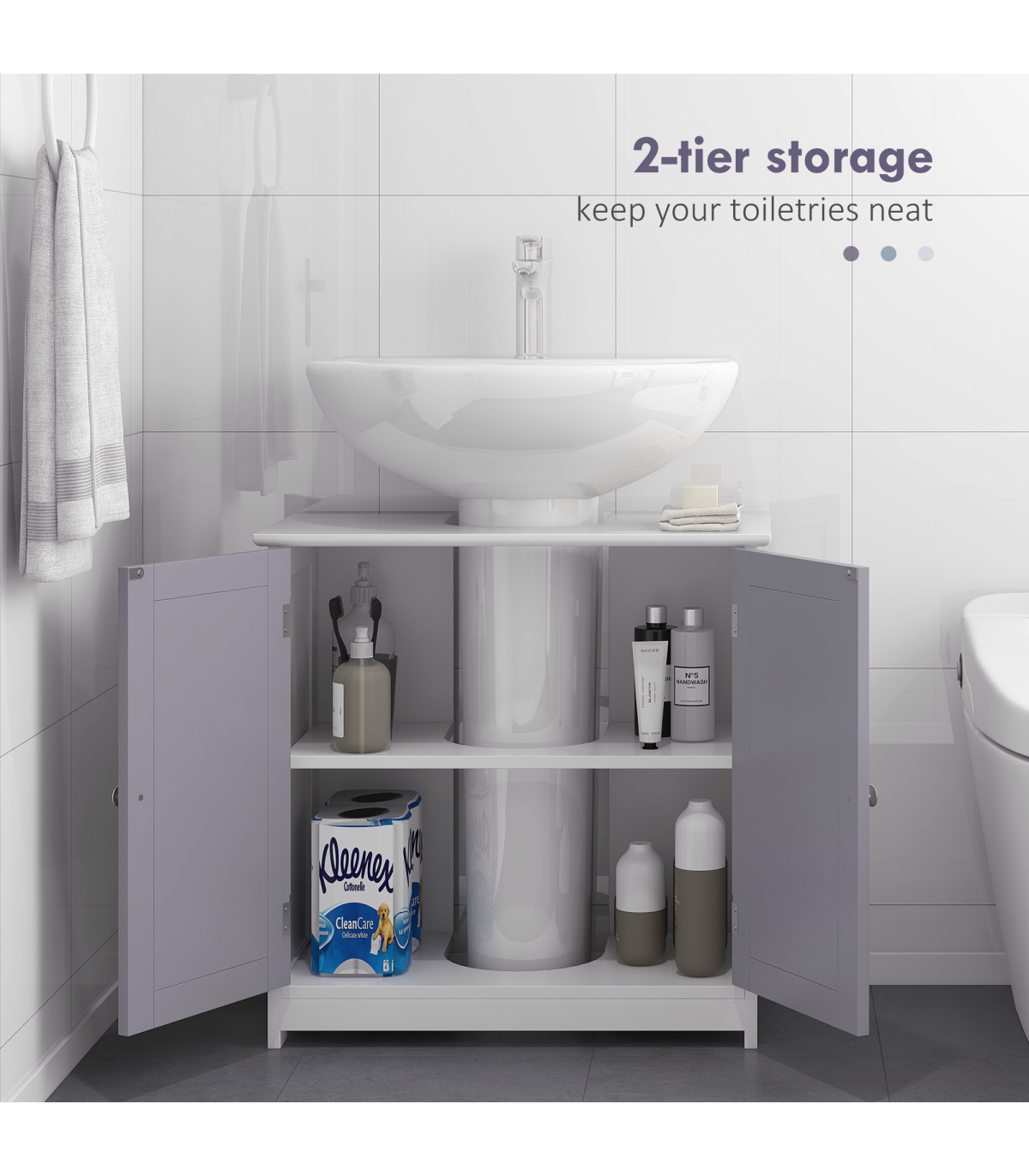 Kleankin 60x60cm Under-Sink Storage Cabinet with Adjustable Shelf - Grey White" Description: - UNDER-SINK STORAGE: Brings in extra storage room to an area hard to utilize. - 'U' shaped cut-out for the pipe: 18.5 x 22Dcm. Please measure the space before purchasing. - INNER SHELF: Creates two areas for storing and organizing toiletries and products. - Allows you to keep certain product separated for safety. - Can be adjusted up or down. - SOLID AND DURABLE: Crafted from MDF. - The structure can be relied upon for everyday use. - Smooth painted surface can be wiped clean easily. - FOUR FEET: Keeps unit balanced and elevates bottom for protection. - DIMENSIONS: 60H x 60L x 30Wcm. - Inner storage: 50.5H x 53W x 26.5Dcm. - MAXIMUM LOAD: 10KG. - ASSEMBLY REQUIRED.