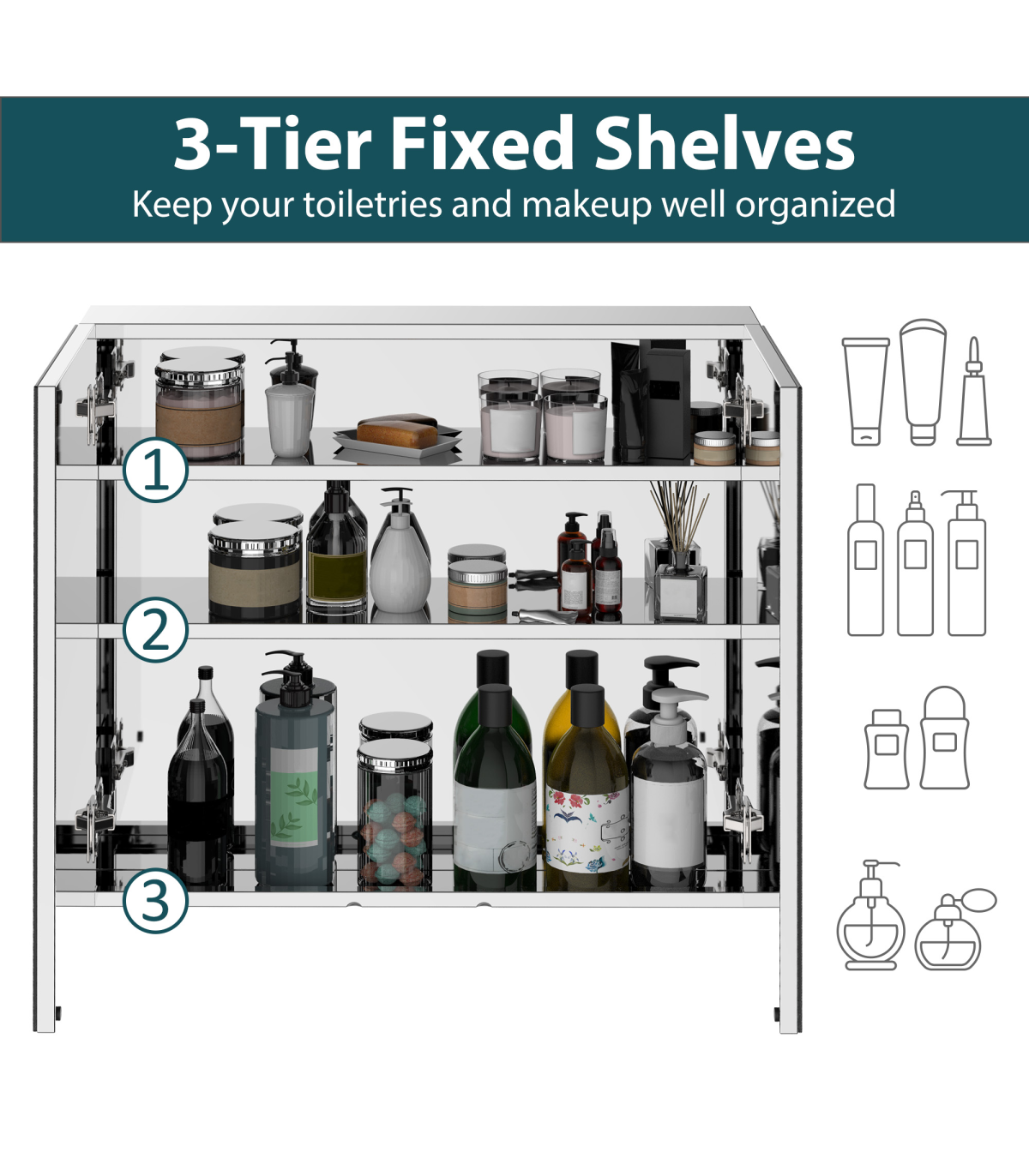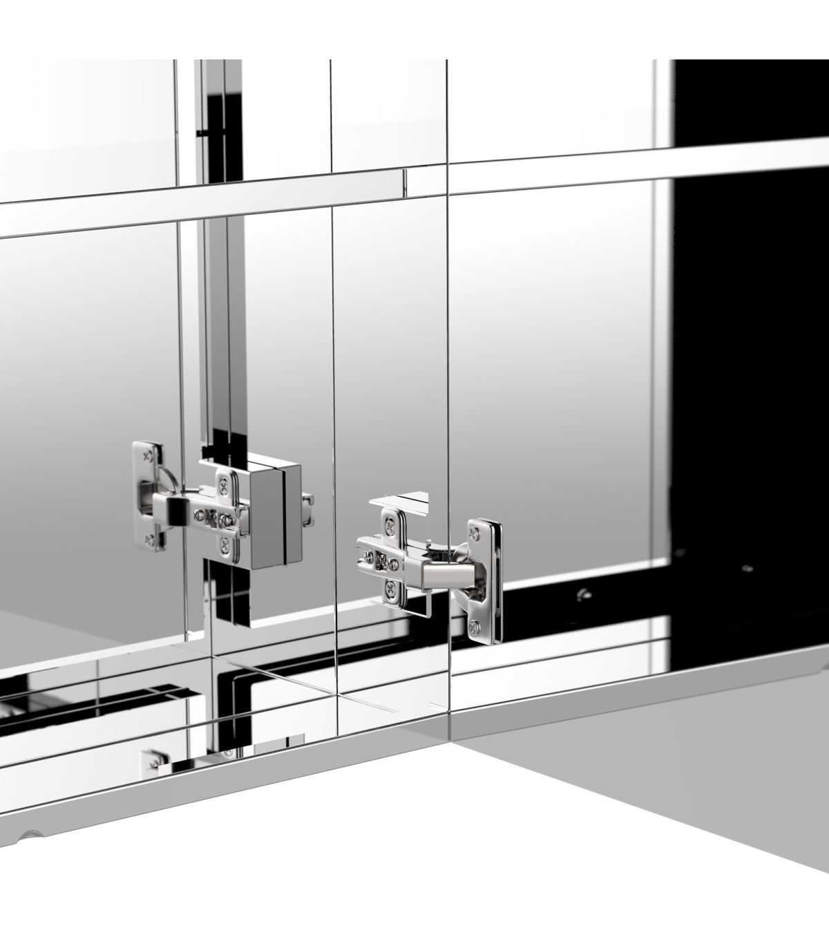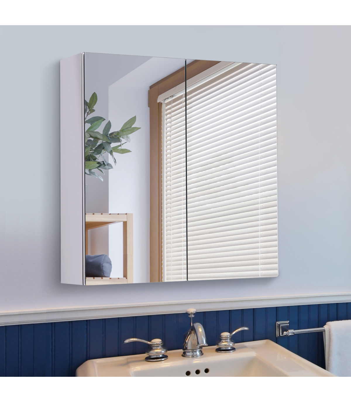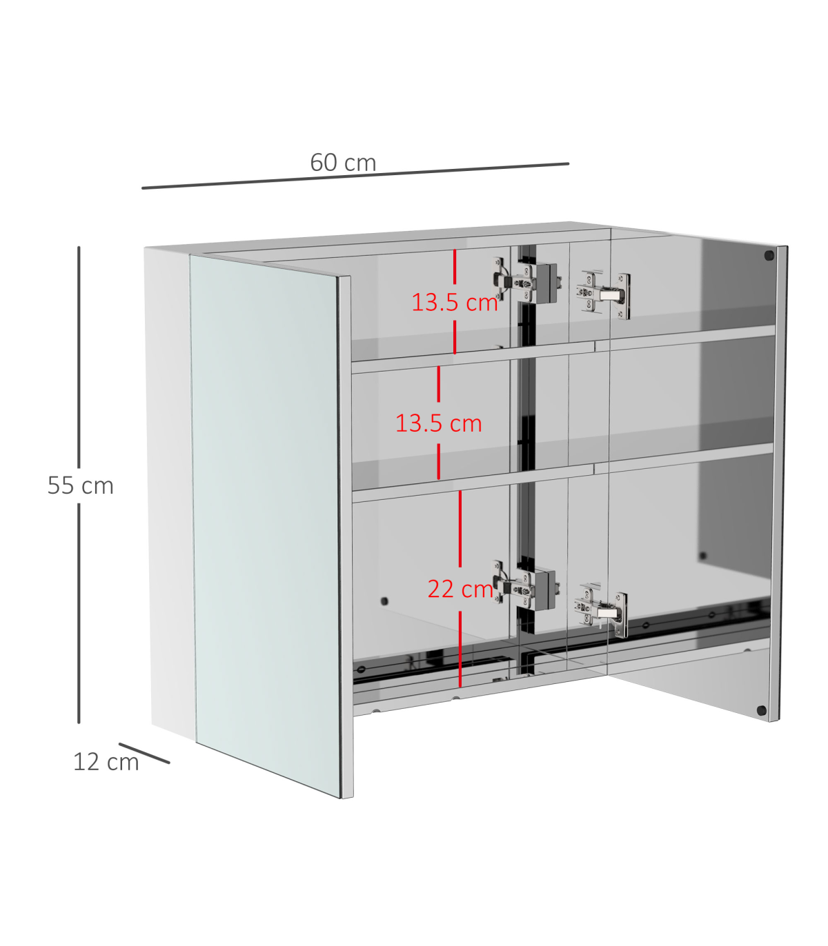 STYLISH, COMPACT CABINET: This two door, mirrored stainless steel floating bathroom cabinet creates a polished, clean look and gives you the ability to store personal hygiene essentials out of sight.AMPLE STORAGE OPTIONS: Three fixed interior metal shelves provide multiple levels of storage within this reflective medicine cabinet, the metal surface adding depth and an artistic touch when colorful items are stored in the cabinet.TRIPLE MIRROR DESIGN: Our mirror cabinet offers a triple mirror design, with a mirrored surface on the front, on the back of the door, and the rear wall of the interior of the cabinet so you can use it at any angle.SAFE CLOSING DOOR: A easy open and close door ensures there will be no slamming or surprise pinched fingers while using this cabinet, protecting both your glass mirror and your stored items as well.DURABLE, LASTING MATERIALS: Rust-resistant, stainless steel ensures years of continued use with an easy wipe down surfaces. DIMENSIONS: 55H x 60W x 12Dcm. ASSEMBLY REQUIRED.