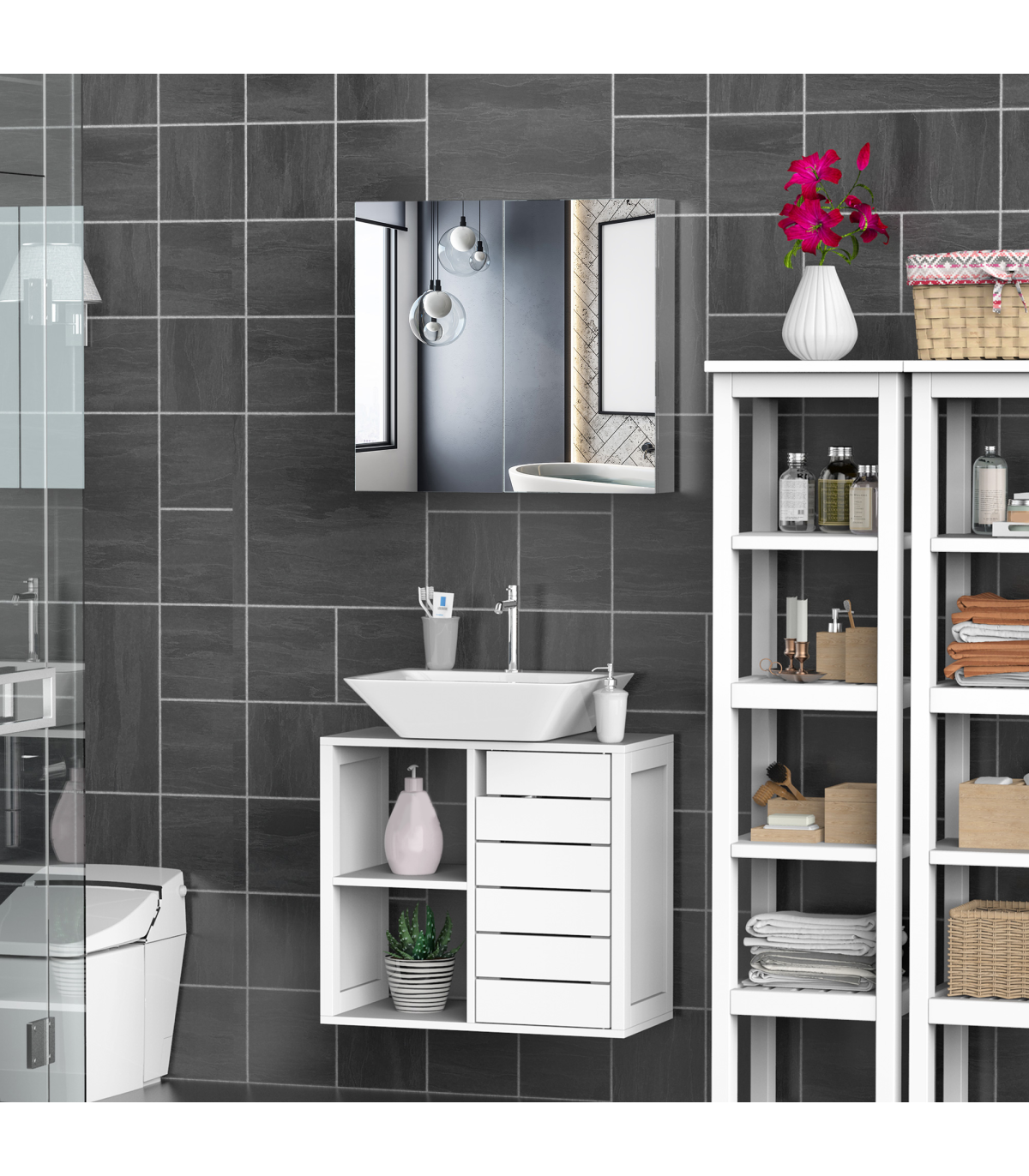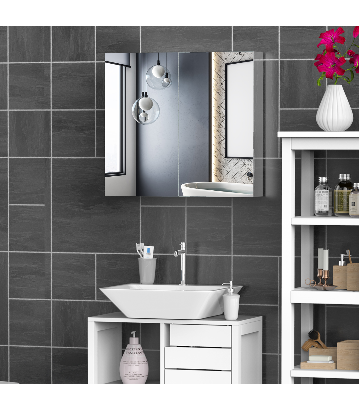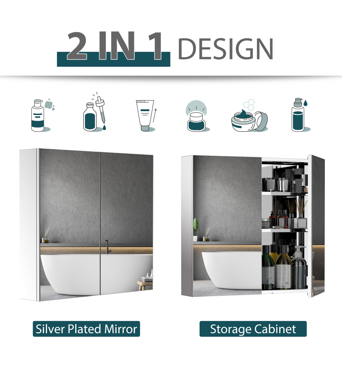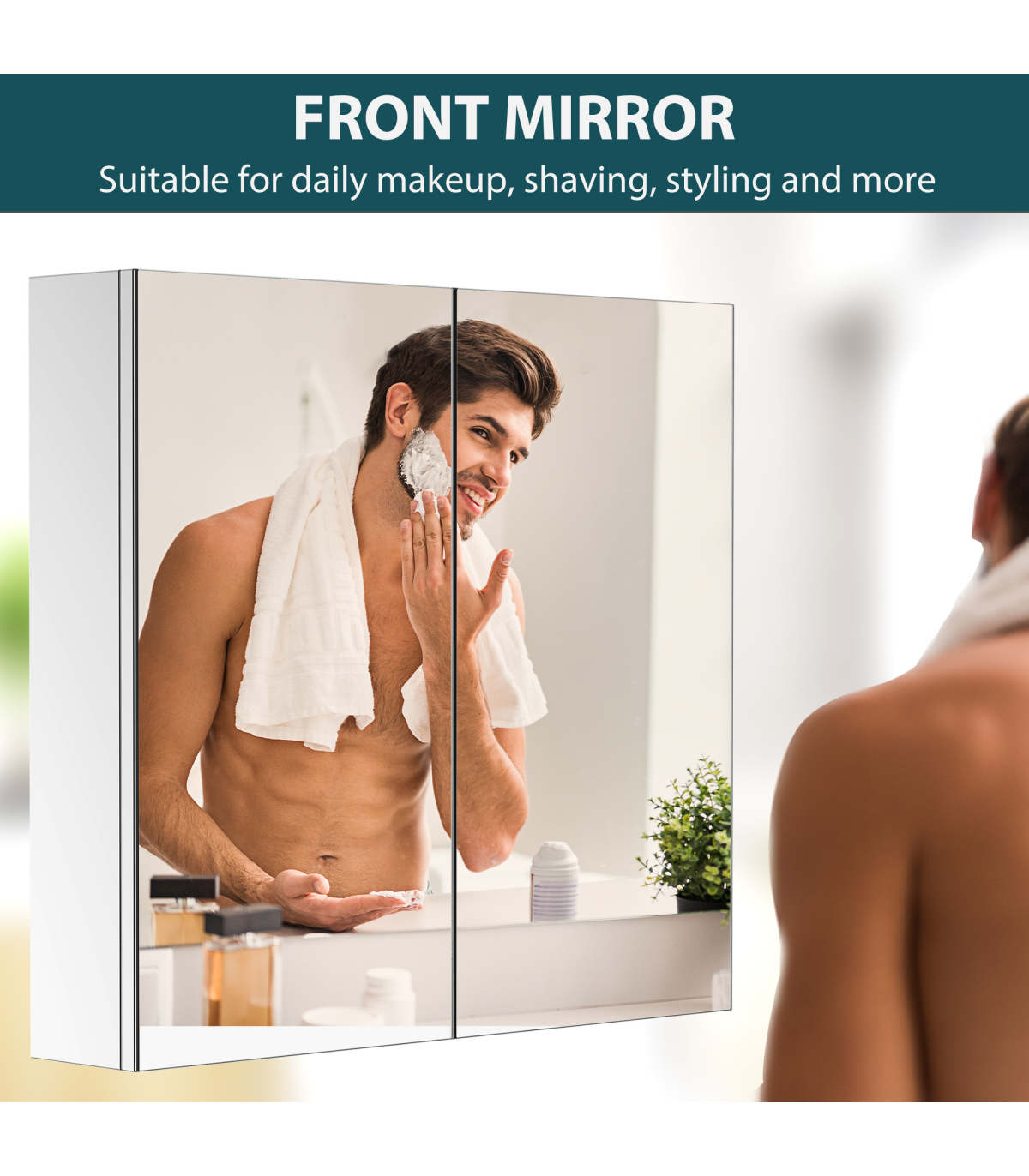 STYLISH, COMPACT CABINET: This two door, mirrored stainless steel floating bathroom cabinet creates a polished, clean look and gives you the ability to store personal hygiene essentials out of sight.AMPLE STORAGE OPTIONS: Three fixed interior metal shelves provide multiple levels of storage within this reflective medicine cabinet, the metal surface adding depth and an artistic touch when colorful items are stored in the cabinet.TRIPLE MIRROR DESIGN: Our mirror cabinet offers a triple mirror design, with a mirrored surface on the front, on the back of the door, and the rear wall of the interior of the cabinet so you can use it at any angle.SAFE CLOSING DOOR: A easy open and close door ensures there will be no slamming or surprise pinched fingers while using this cabinet, protecting both your glass mirror and your stored items as well.DURABLE, LASTING MATERIALS: Rust-resistant, stainless steel ensures years of continued use with an easy wipe down surfaces. DIMENSIONS: 55H x 60W x 12Dcm. ASSEMBLY REQUIRED.