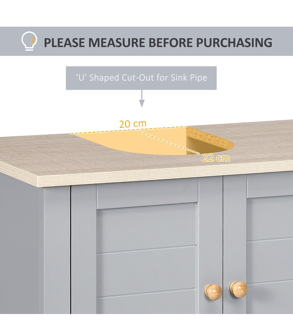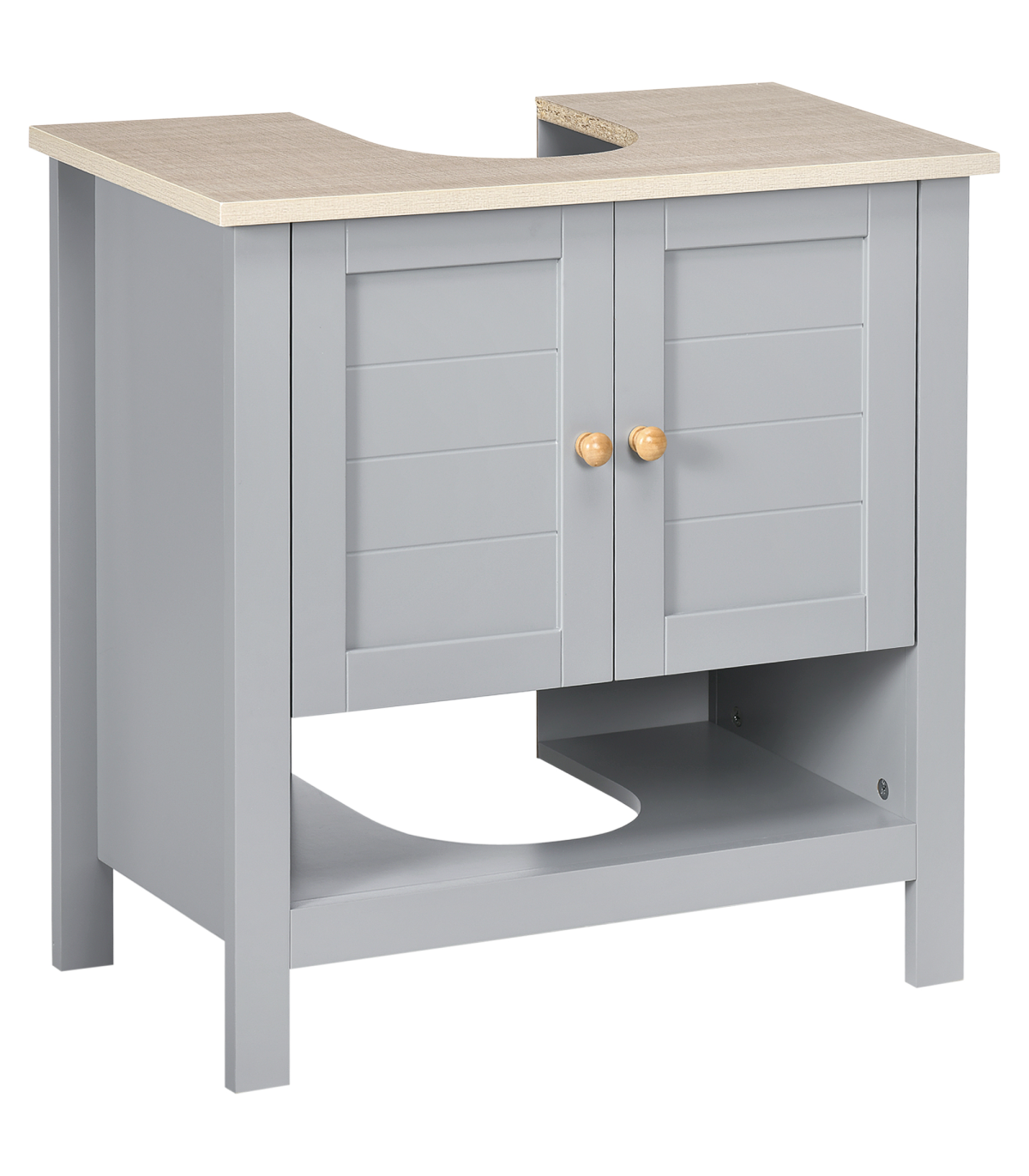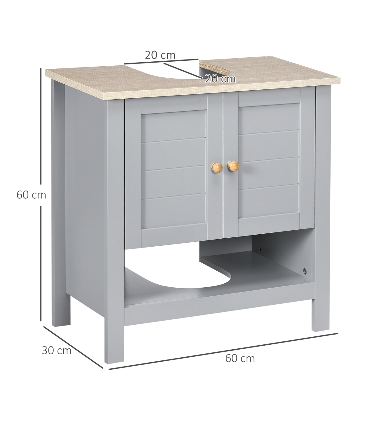 - "kleankin Bathroom Pedestal Under Sink Cabinet with Storage Shelf Double Door" - Description: - SPACE SAVING: This under sink unit fits underneath your washbasin, providing extra bathroom storage. - 20L x 8Wcm 'U' shaped cut-out for the sink pipe. Make sure to measure properly before purchasing. - STAND-OUT DESIGN: The cabinet has a mix of farmhouse rustic and retro style with a homely look in mid-grey and wood-effect panels. - Inviting and welcoming, it adds a touch of difference to contemporary home designs. - STORAGE CUPBOARD: Convenient room for keeping bathroom essentials, toiletries, bottles, towels, and more safely stored. - Adjustable shelf to accommodate differently-sized products. - DIMENSIONS: - Overall: 60H x 60W x 30Dcm - Inner: 15H x 49.5W x 26.5Dcm - Shelf: 13H x 49W x 26.6Dcm - Suitable basin size: 60cm (maximum) - MAXIMUM LOAD: - Whole cabinet: 40kg - Shelf: 4kg - ASSEMBLY REQUIRED.