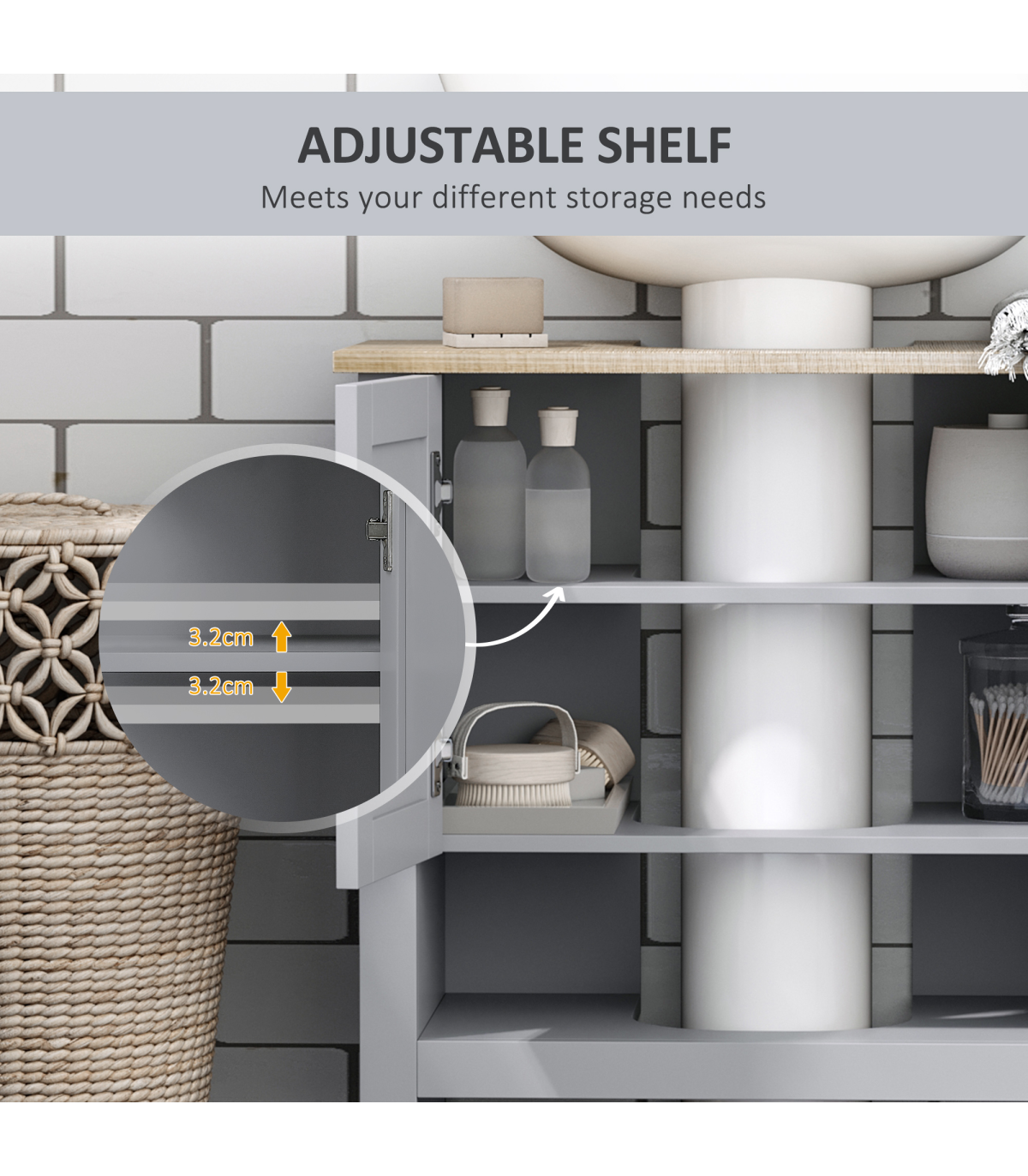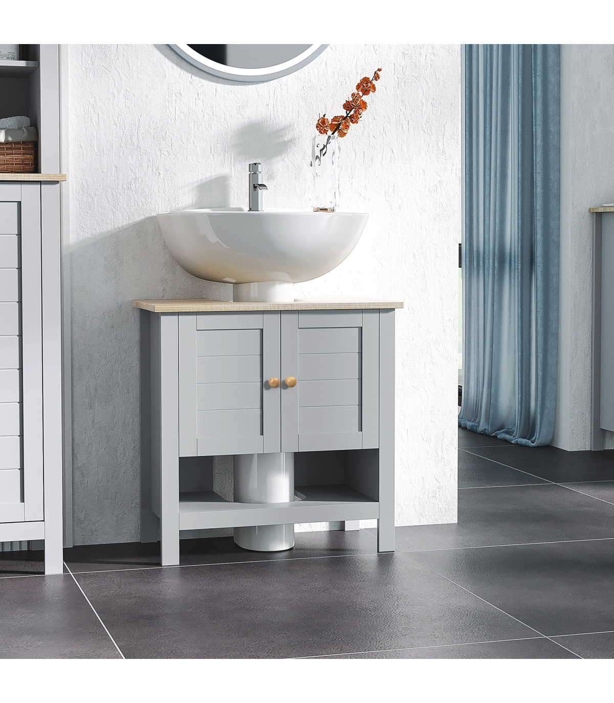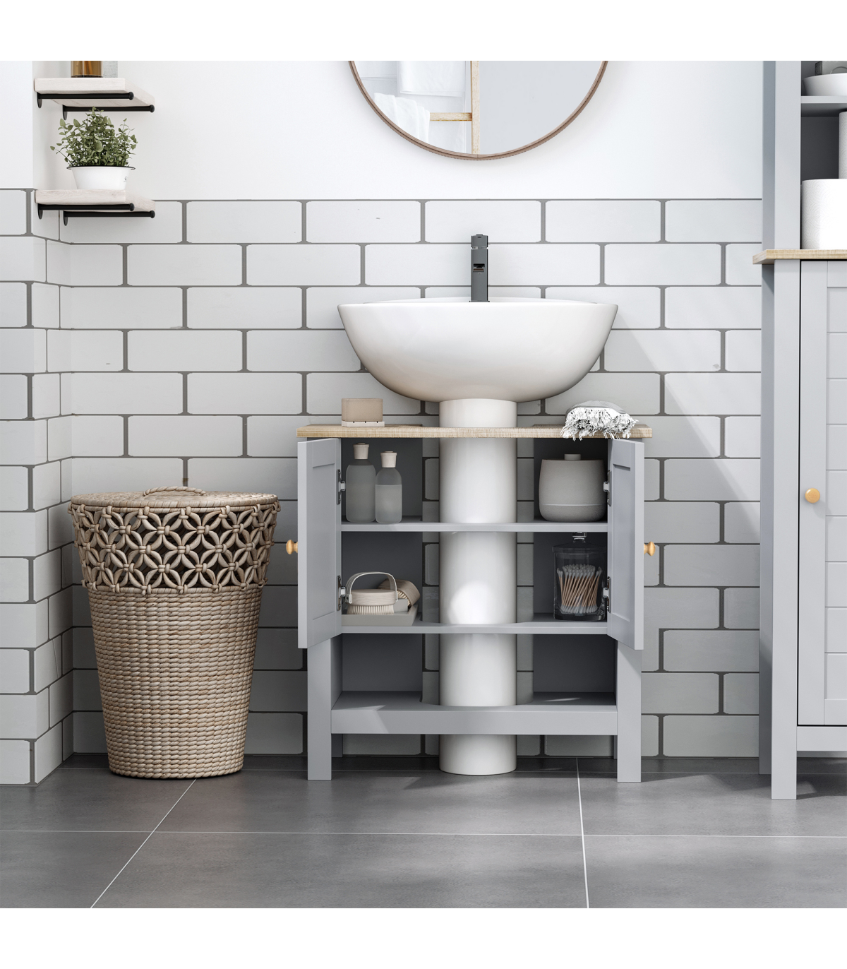 - "kleankin Bathroom Pedestal Under Sink Cabinet with Storage Shelf Double Door" - Description: - SPACE SAVING: This under sink unit fits underneath your washbasin, providing extra bathroom storage. - 20L x 8Wcm 'U' shaped cut-out for the sink pipe. Make sure to measure properly before purchasing. - STAND-OUT DESIGN: The cabinet has a mix of farmhouse rustic and retro style with a homely look in mid-grey and wood-effect panels. - Inviting and welcoming, it adds a touch of difference to contemporary home designs. - STORAGE CUPBOARD: Convenient room for keeping bathroom essentials, toiletries, bottles, towels, and more safely stored. - Adjustable shelf to accommodate differently-sized products. - DIMENSIONS: - Overall: 60H x 60W x 30Dcm - Inner: 15H x 49.5W x 26.5Dcm - Shelf: 13H x 49W x 26.6Dcm - Suitable basin size: 60cm (maximum) - MAXIMUM LOAD: - Whole cabinet: 40kg - Shelf: 4kg - ASSEMBLY REQUIRED.