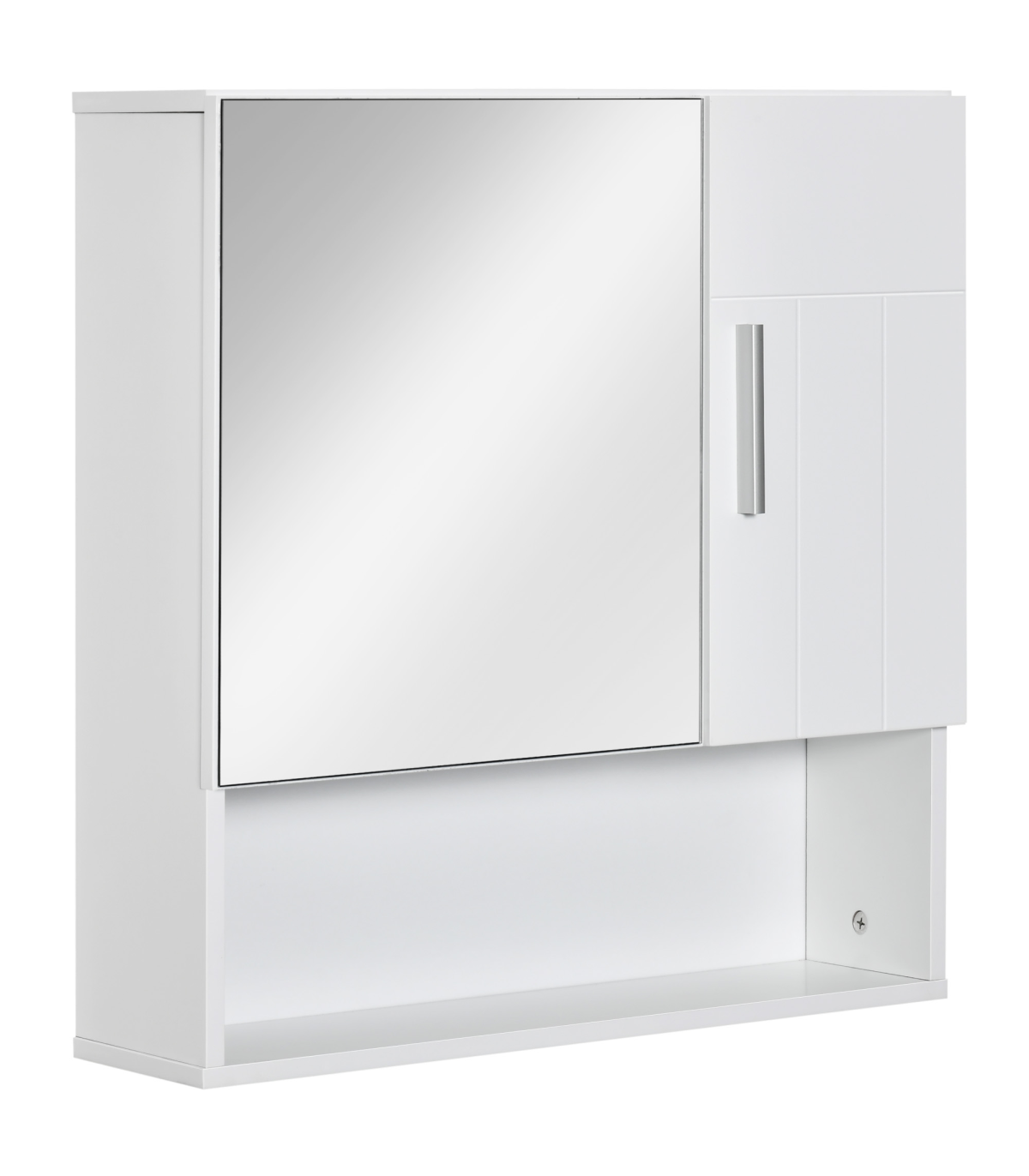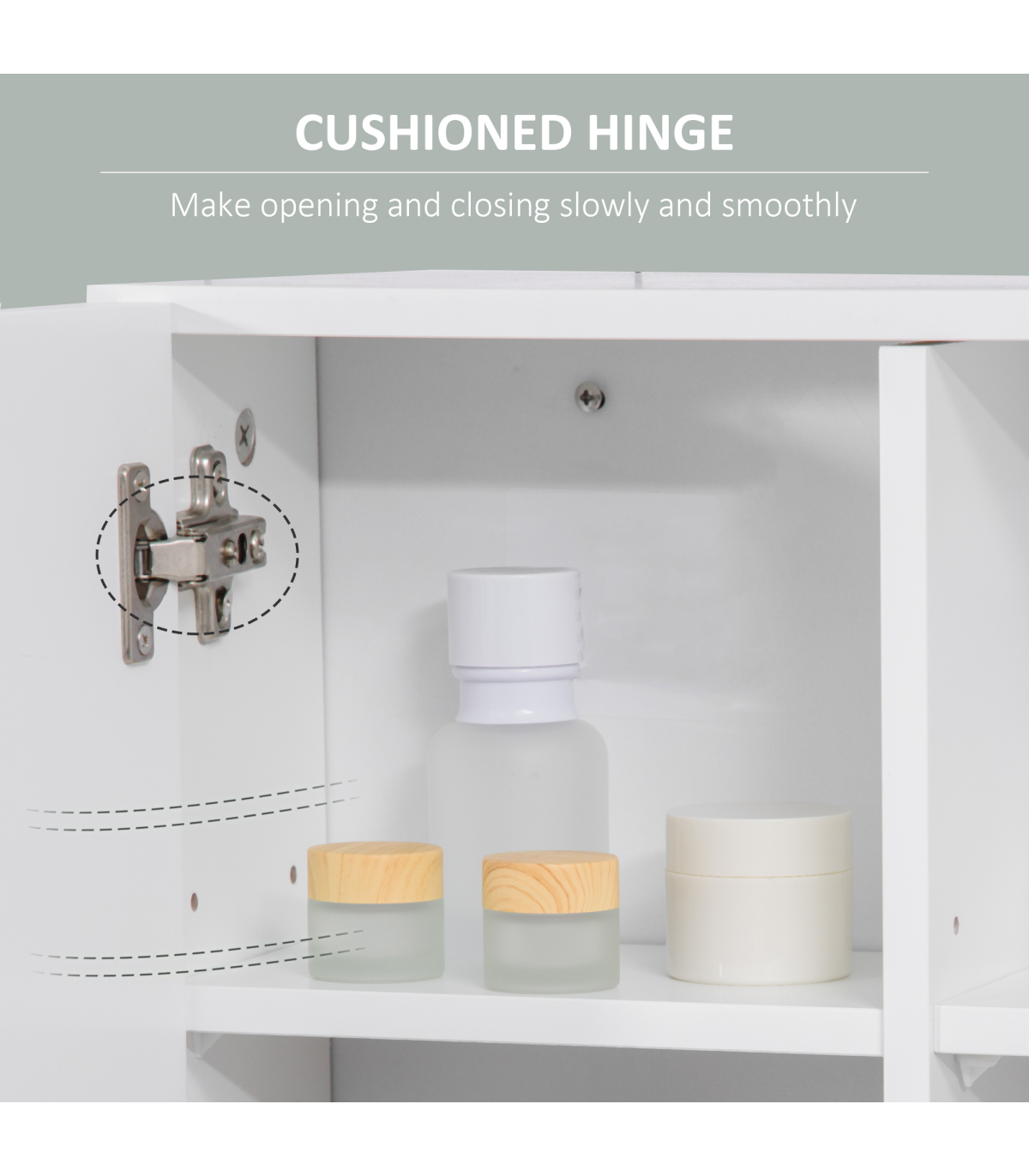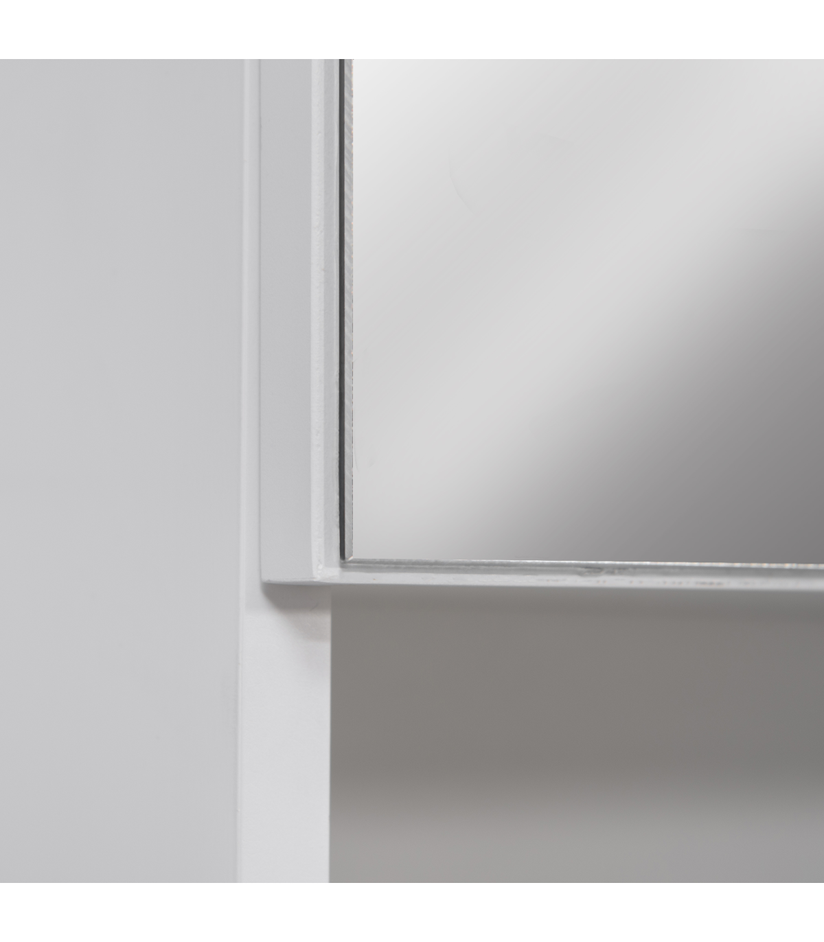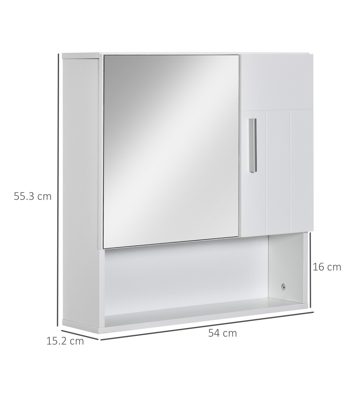 each with an adjustable shelf to fit different sized items in easily. One door is mirrored so you can ready. Cushioned hinges for soft door closing, this cabinet is finished with a lick of protective paint.