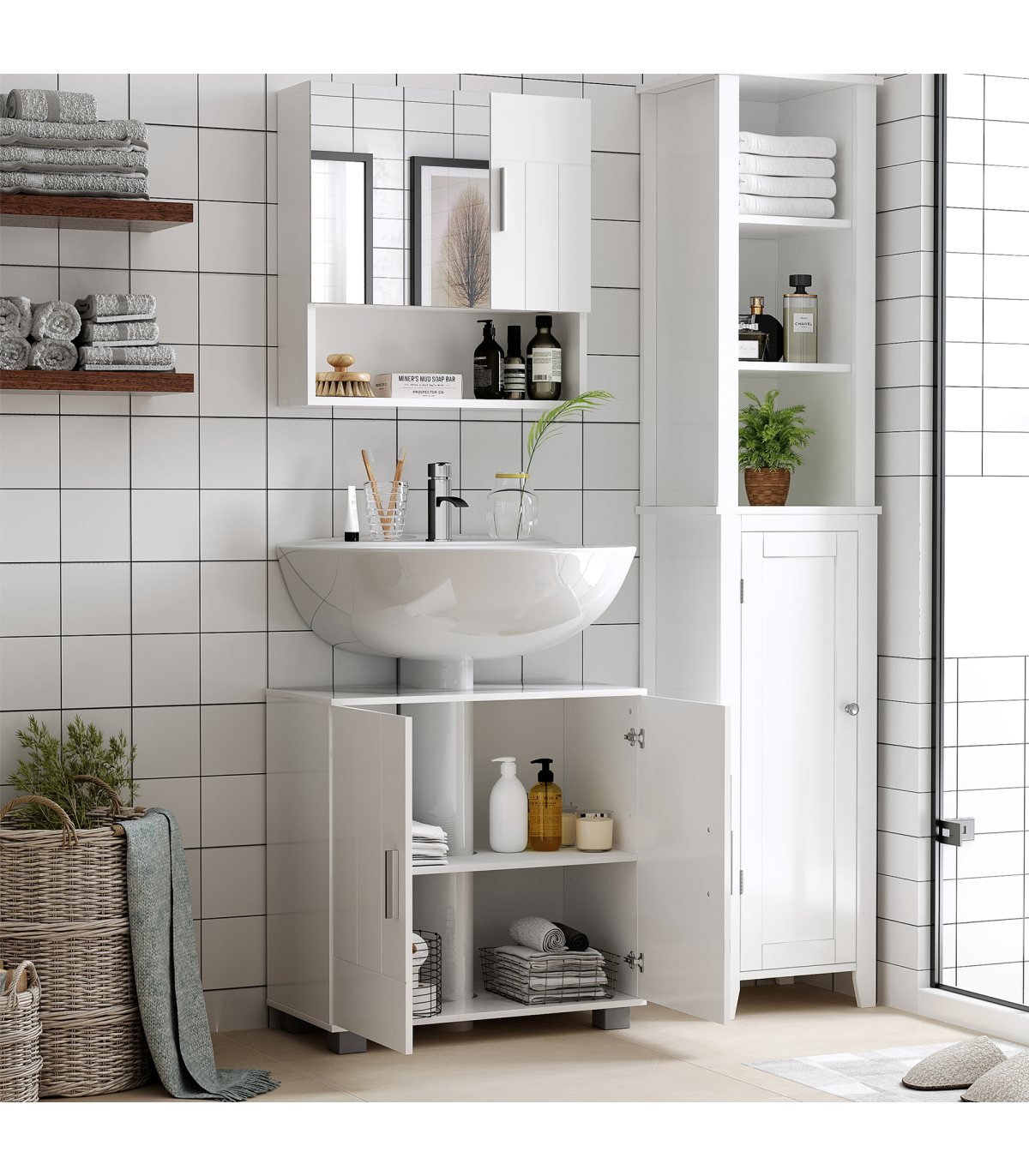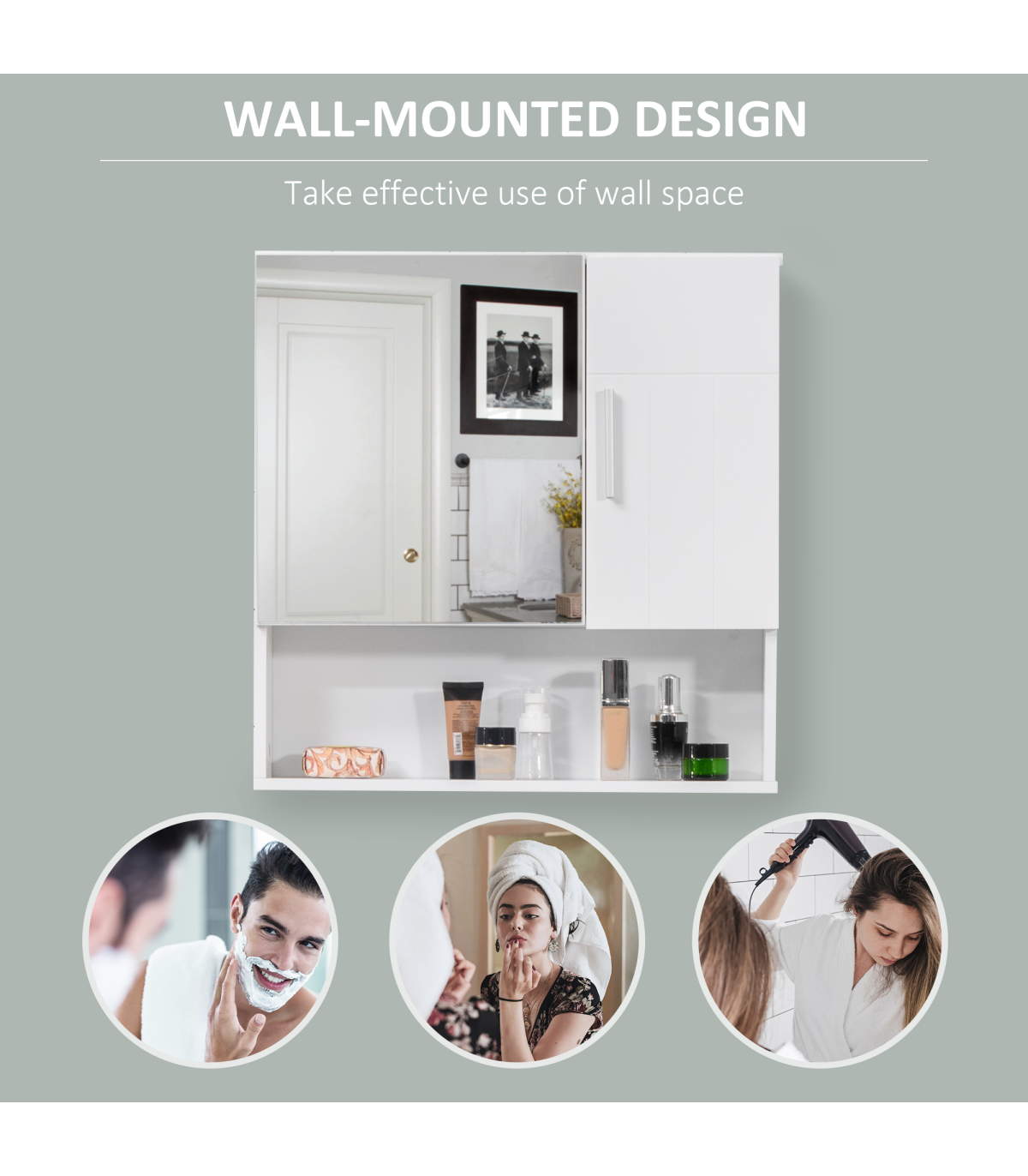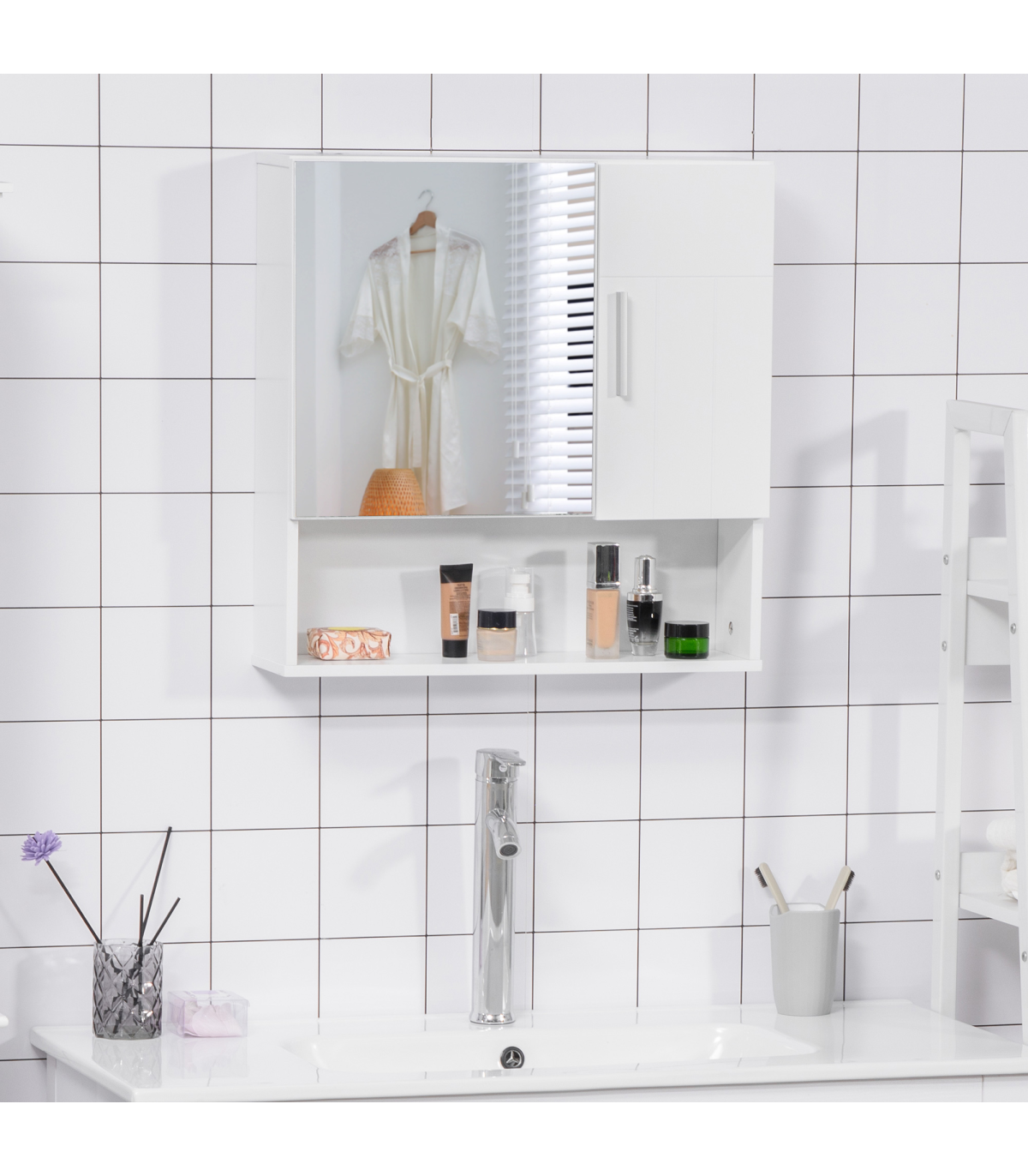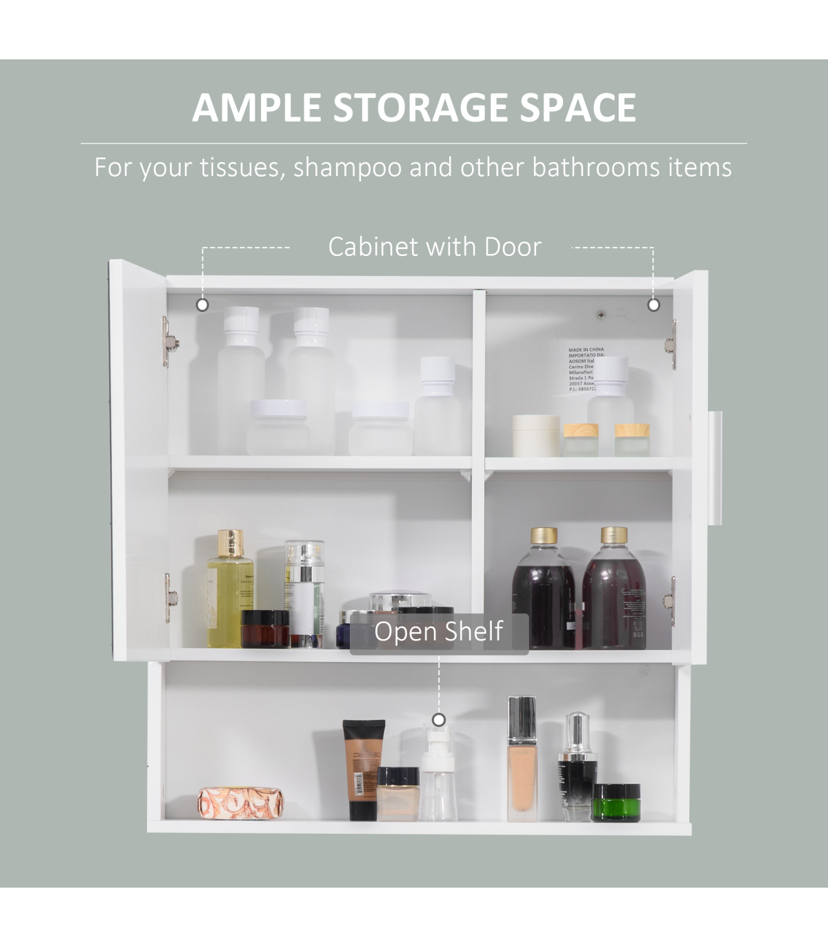 each with an adjustable shelf to fit different sized items in easily. One door is mirrored so you can ready. Cushioned hinges for soft door closing, this cabinet is finished with a lick of protective paint.