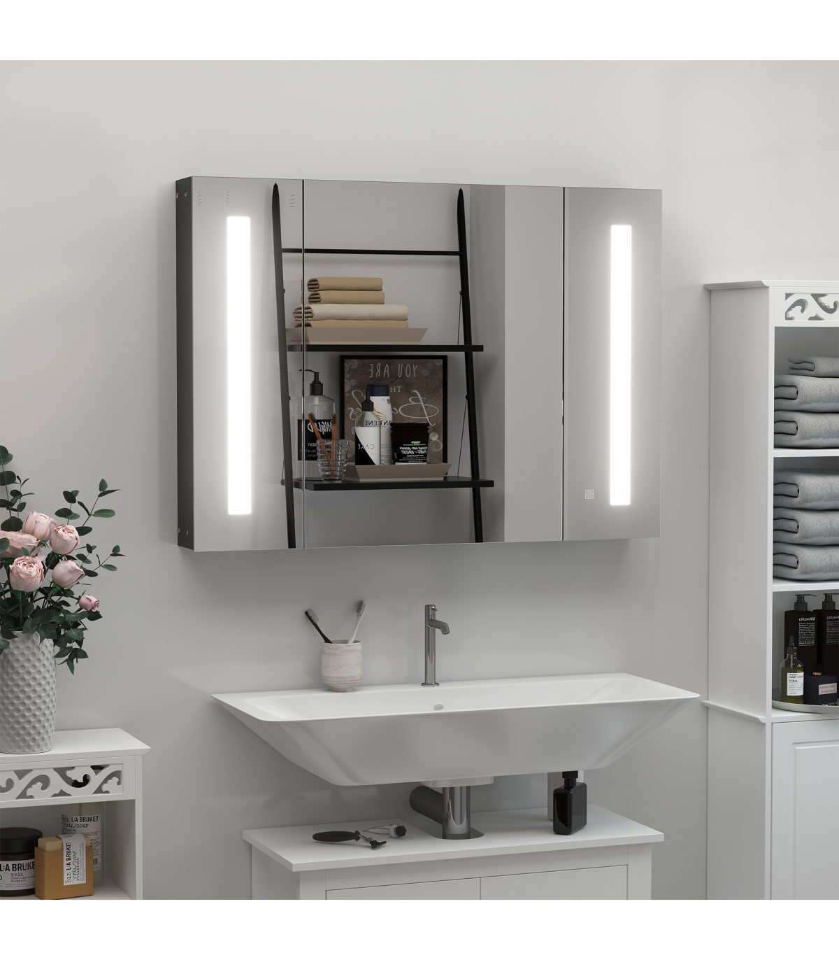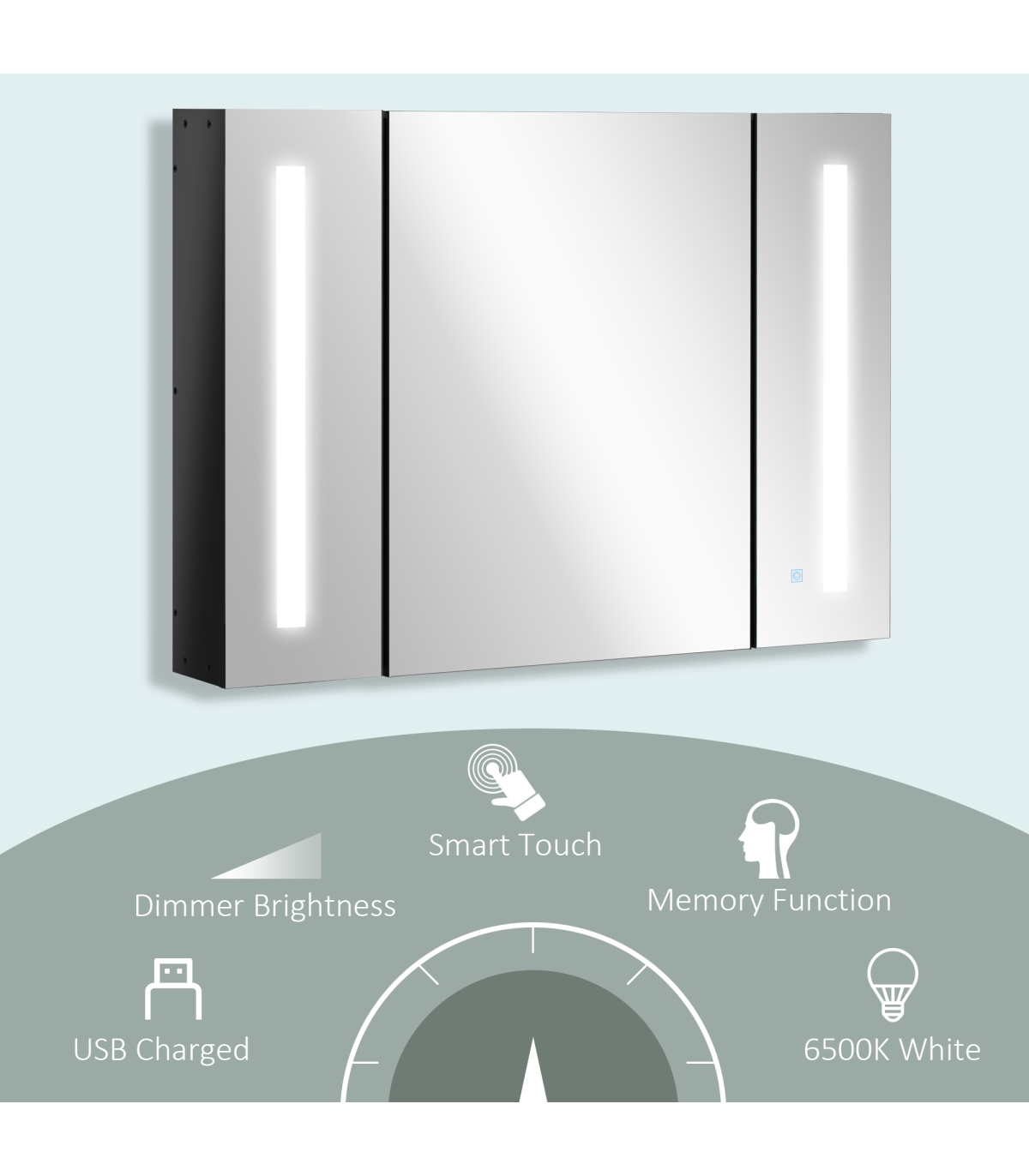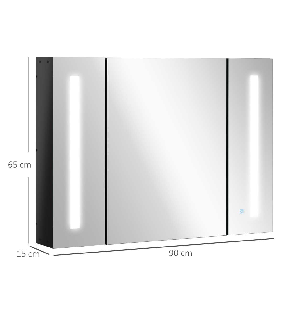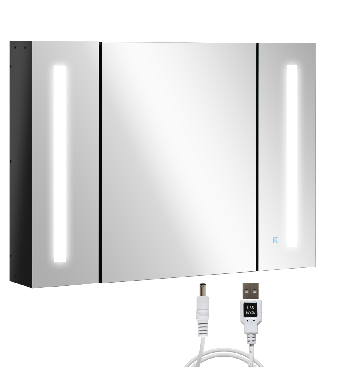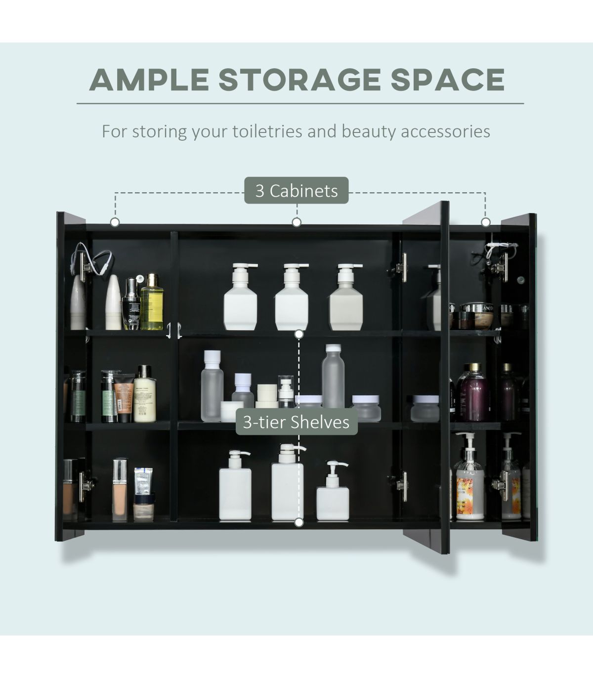 THREE MIRRORED CABINETS: Multi bathroom storage design: each part has a shelf inside, making it easy to organise toiletries, bottles, make-up and more. Mirrored bathroom cabinet design means it's easy to see your reflection as you get ready.ON-WALL DESIGN: Attach the mirror cabinet to the wall - a space-saving piece as there's no floor required! Great for fixing over your sink or the toilet.CUSHIONED HINGES: Open and close the doors safely and easily, won't damage the doors or make a harsh sound.DIMENSIONS: 65H x 90W x 15Dcm. Maximum load 15kg. ASSEMBLY REQUIRED. POWER ADAPTOR IS NOT INCLUDED.