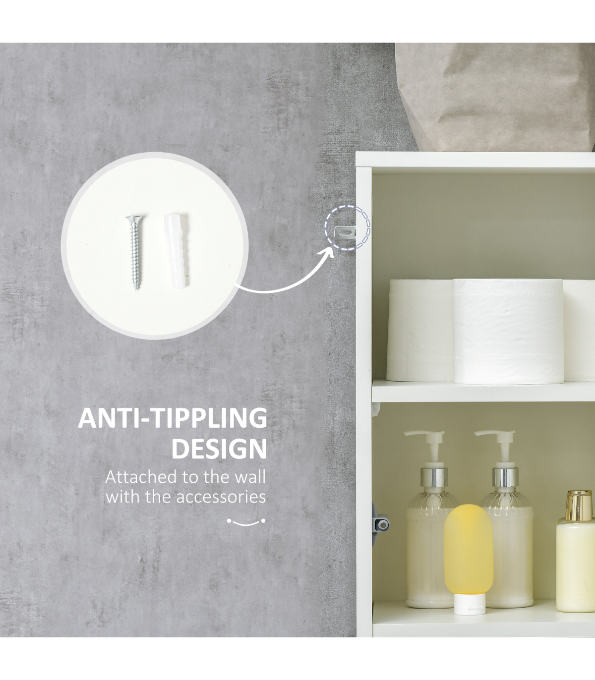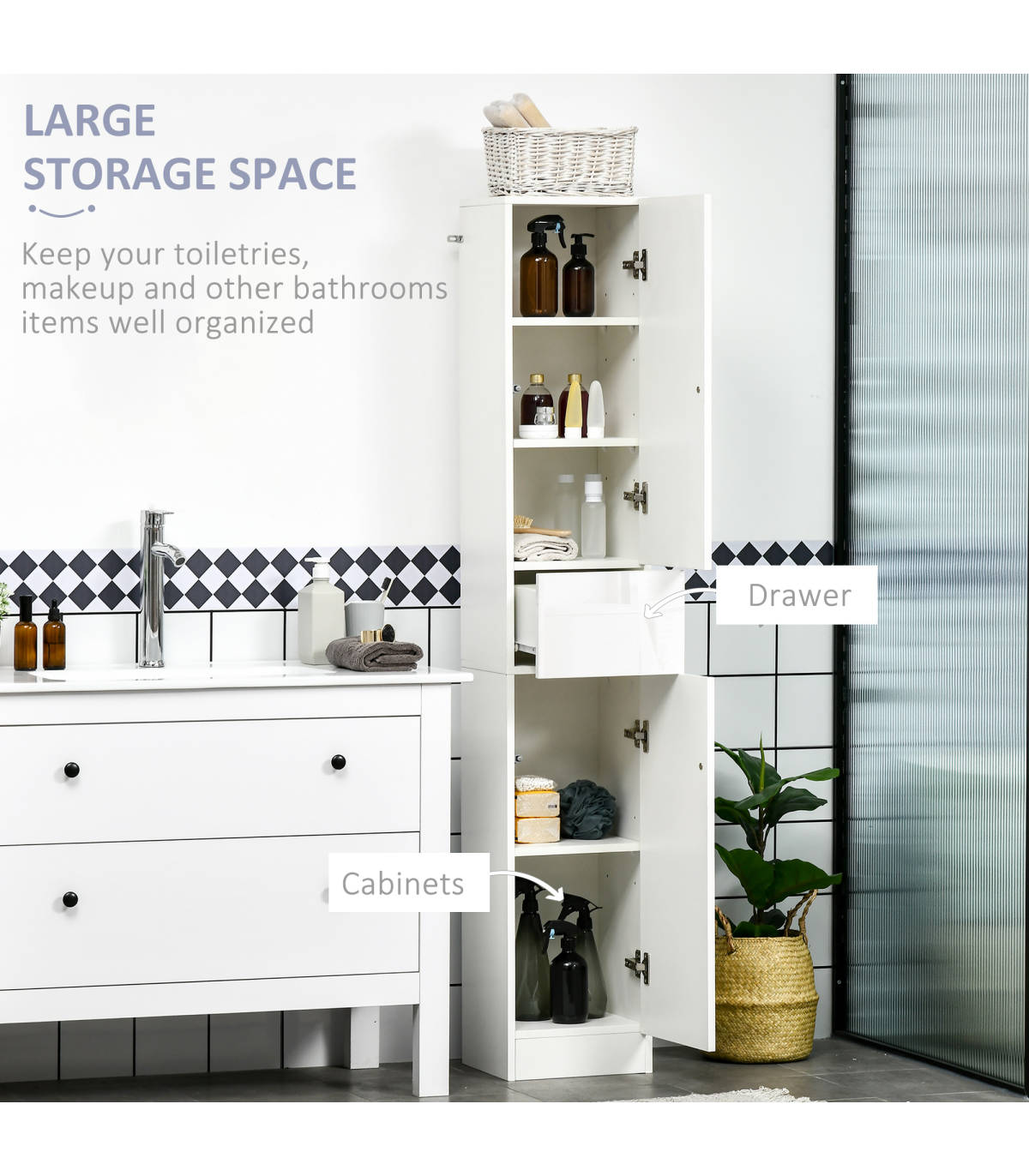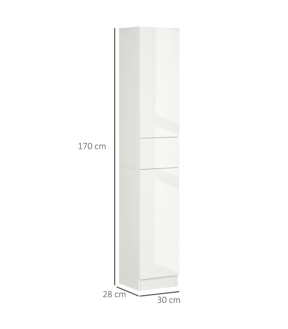 Tallboy design: Slimline, this bathroom storage cabinet is a must for tighter spots.Push-open system: An easy way to open the drawer and doors - no hands required!High gloss front doors: Sleek, natural shine finish. Creates a high fashion look. White is versatile. Smooth surface makes the bathroom storage unit easy to clean down.Anti-tipping straps: Attach this slim storage cabinet to the wall for safety.Dimensions: 170H x 30W x 28Dcm. Maximum load: 80kg. Assembly required.