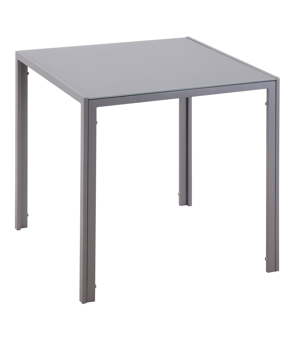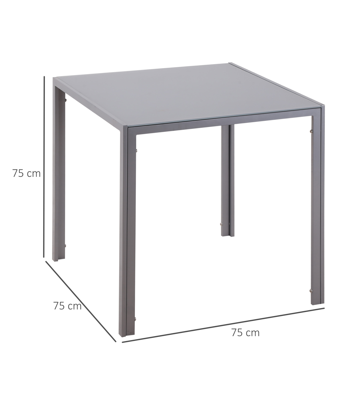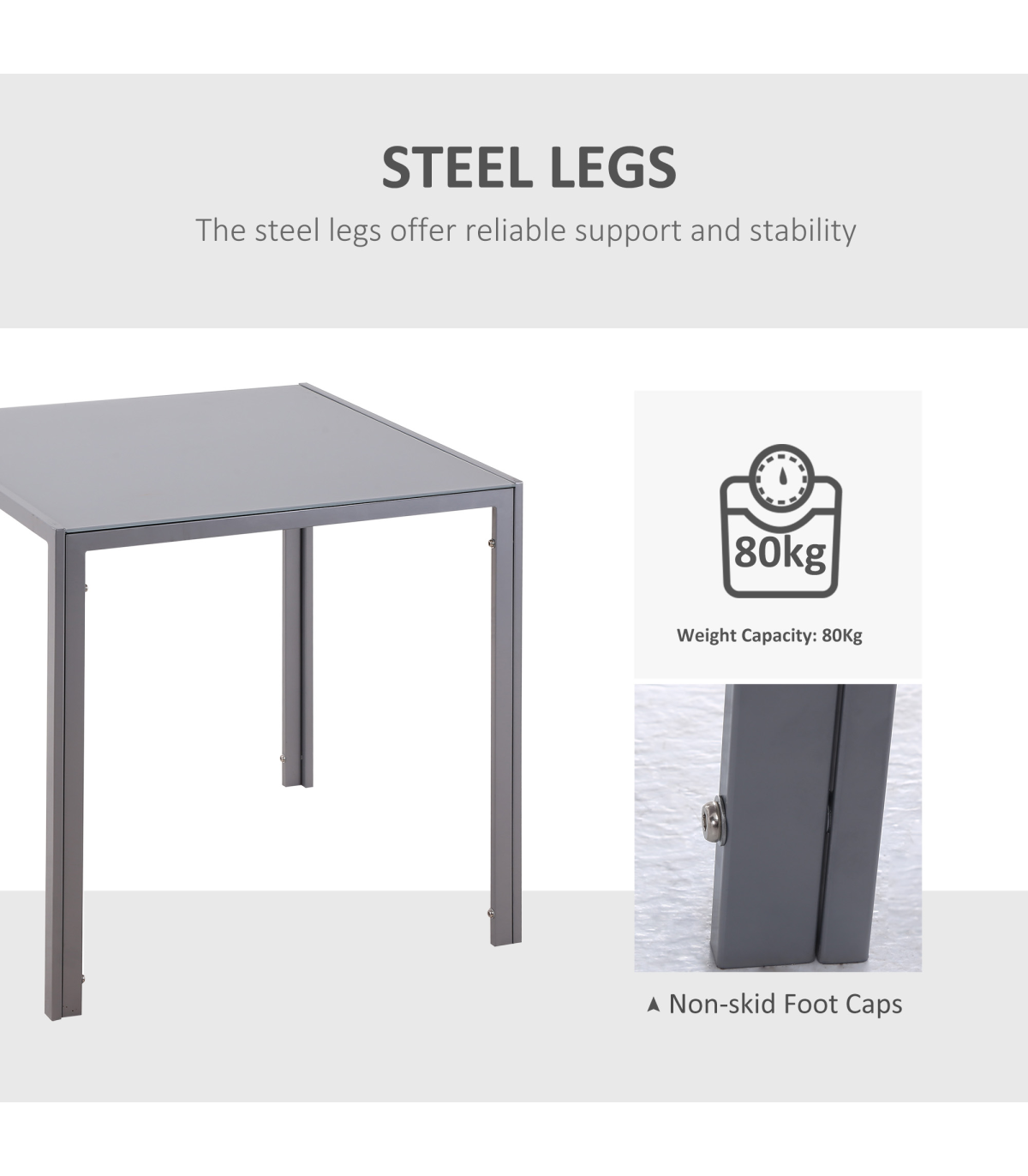 GLASS TABLE TOP: A sleek look to bring a modern feel into your dining areas, in the home and kitchen. Also ensures a solid and safe place to eat and drink from.STEEL FRAME: Powder coated for extra strength, a solid core structure to support the whole structure Square legs to keep stable.COMPACT SIZE: Small square shape is compact - perfect for smaller kitchens. Enjoy meals by yourself or with a friend.DIMENSIONS: 75H x 75L x 75Wcm. Glass: 6mm.MAXIMUM LOAD 80KG. ASSEMBLY REQUIRED.