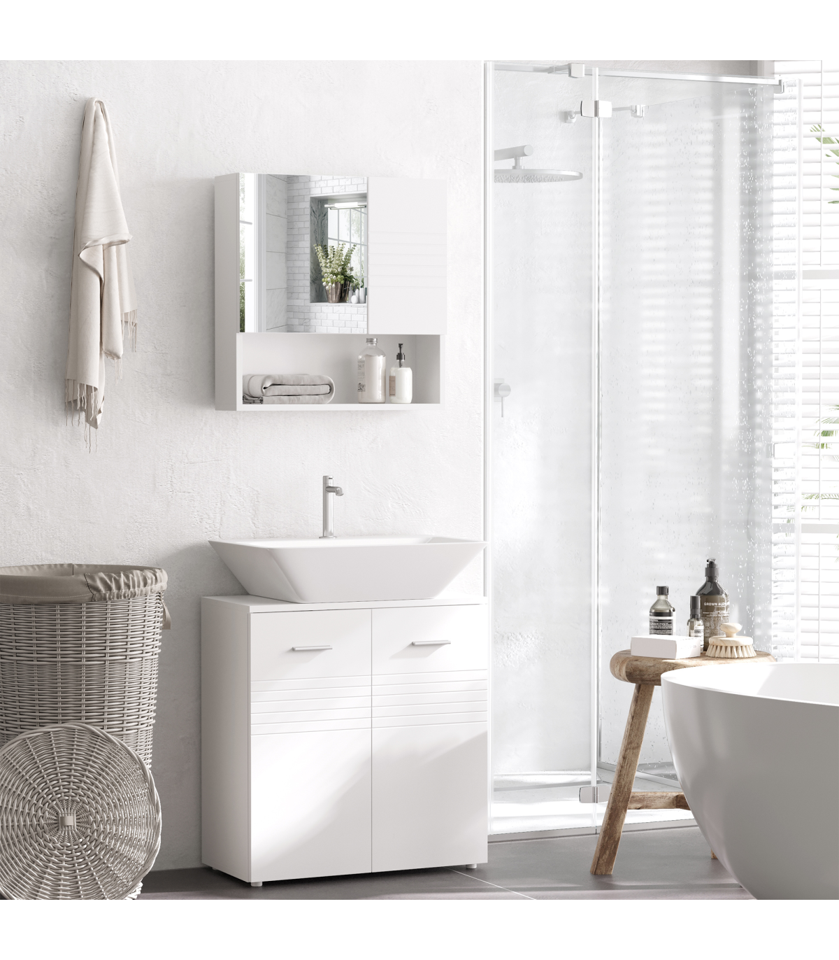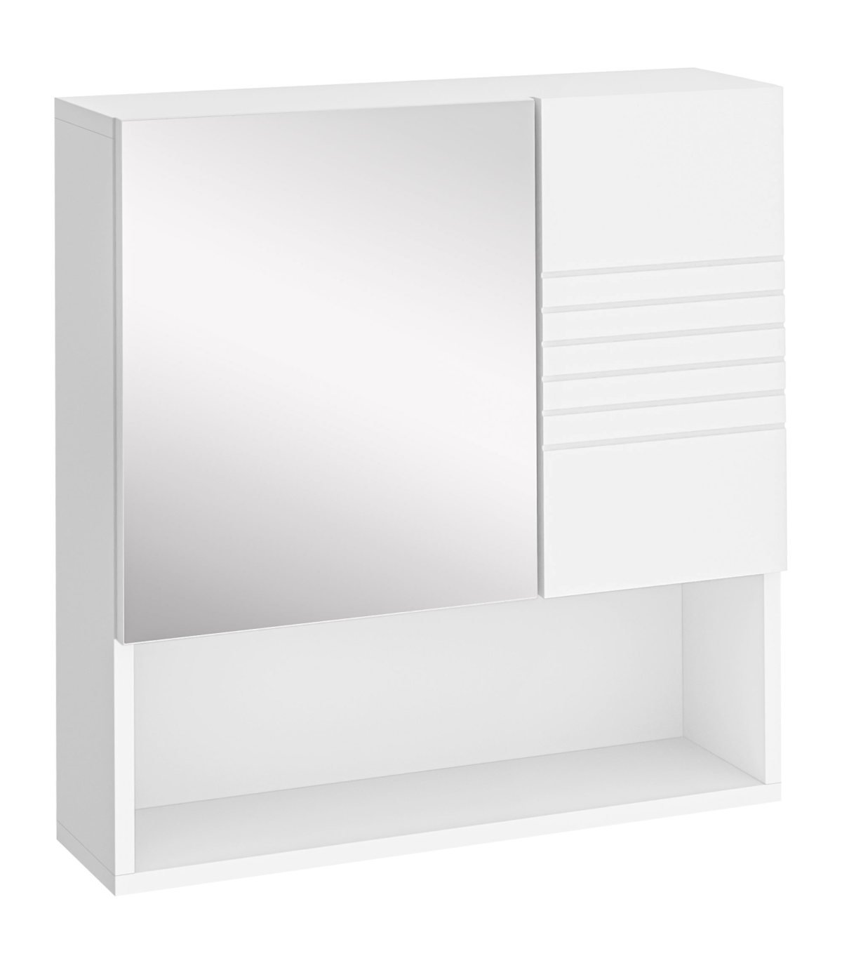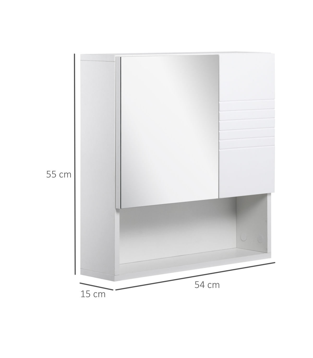 Spacious storage: Two cabinets and an open bottom shelf for keeping toiletries and bathroom essentials organised. The shelves can be adjusted to fit different size items.Wall-mounted design: Great for saving space and your bathroom essentials will be an arm's reach away.Mirrored Door: Shave, style your hair and put makeup on without missing a spot.Dimensions: 55H x 54W x 15Dcm. Mirror: 37H x 32.8Wcm.Maximum load 10kg, assembly required