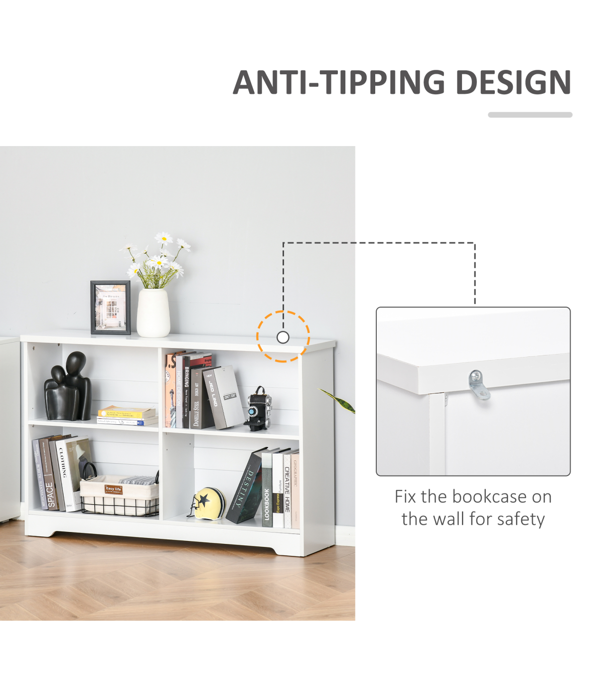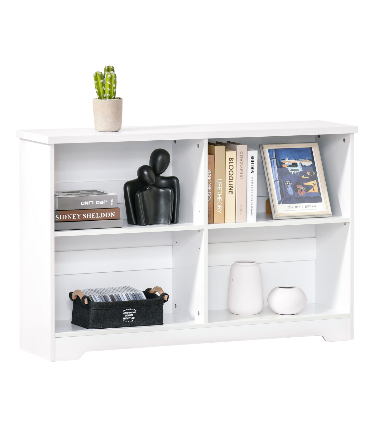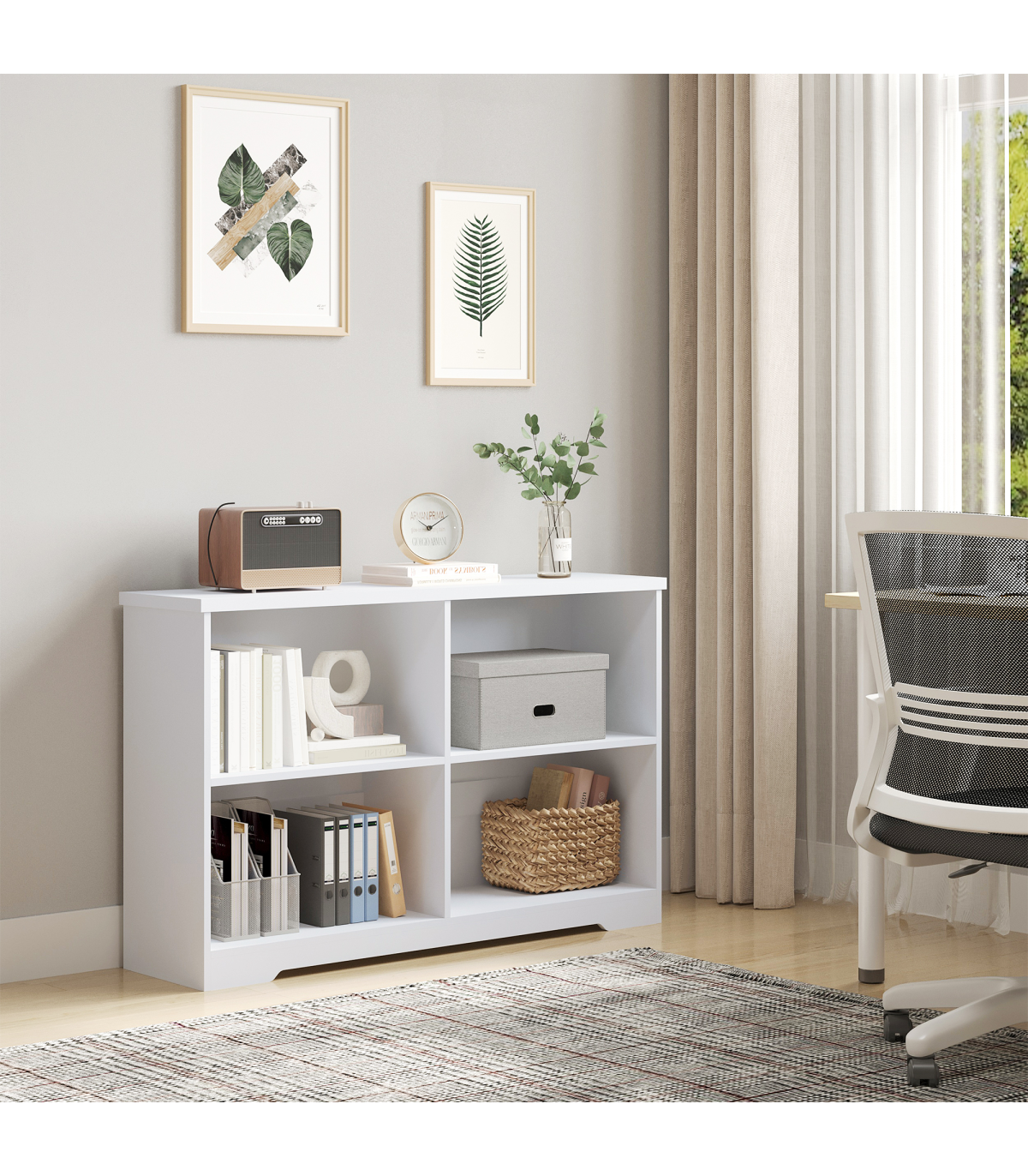 MINIMALISTIC STYLE: Clean white colour in a simple rectangular shape. Easy to bring in your home, office or other living space - no matter the design.FOUR COMPARTMENTS: Provides plenty of storage and display space for your books and decorations. Easily keeps the room tidy and organised.ADJUSTABLE SHELVES: Both can move up and down to a maximum 6.4cm radius. Allows you to set to a space which suits you. RAISED BASE: Helps protect from light damage.ANTI-TIPPING: Straps on back to keep it attached to the wall. Safe for homes with children and pets. DIMENSIONS: 76.5H x 118.2L x 29.5Dcm. Single storage compartment: 31.5H x 56.5L x 28Dcm.MAXIMUM LOAD 28KG. ASSEMBLY REQUIRED.