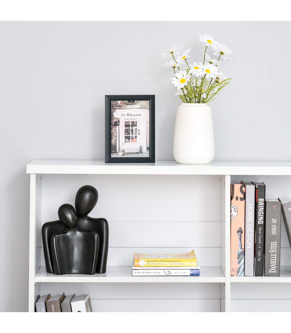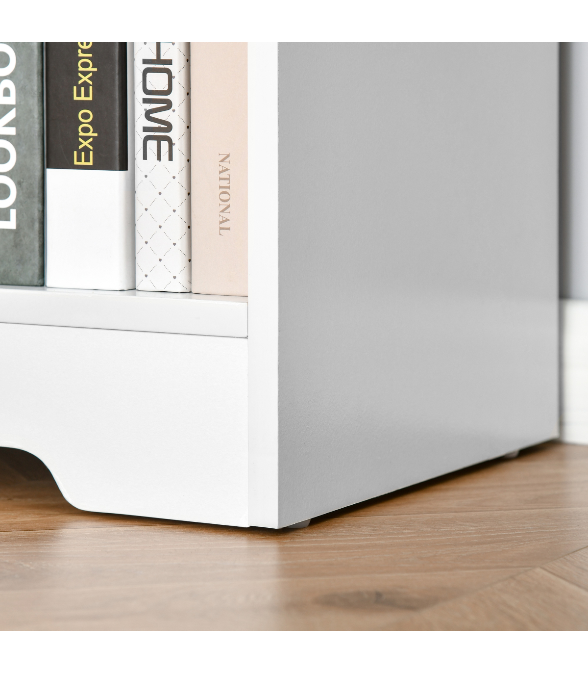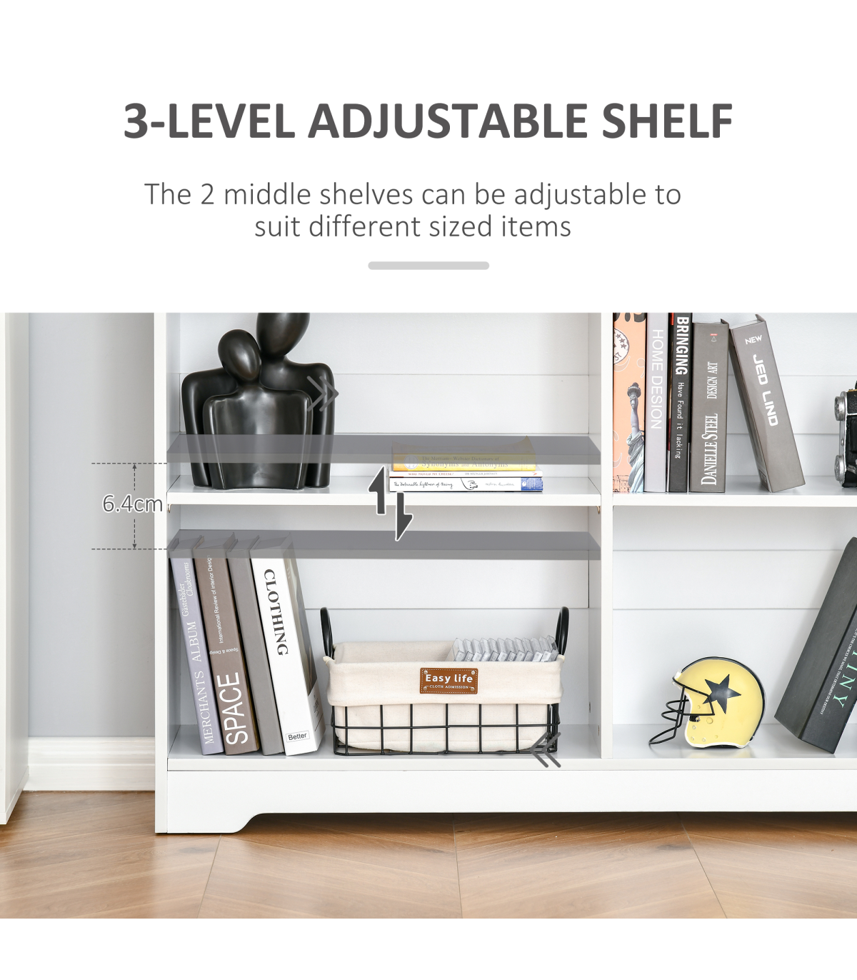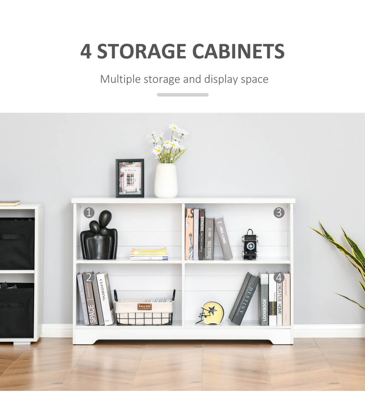MINIMALISTIC STYLE: Clean white colour in a simple rectangular shape. Easy to bring in your home, office or other living space - no matter the design.FOUR COMPARTMENTS: Provides plenty of storage and display space for your books and decorations. Easily keeps the room tidy and organised.ADJUSTABLE SHELVES: Both can move up and down to a maximum 6.4cm radius. Allows you to set to a space which suits you. RAISED BASE: Helps protect from light damage.ANTI-TIPPING: Straps on back to keep it attached to the wall. Safe for homes with children and pets. DIMENSIONS: 76.5H x 118.2L x 29.5Dcm. Single storage compartment: 31.5H x 56.5L x 28Dcm.MAXIMUM LOAD 28KG. ASSEMBLY REQUIRED.