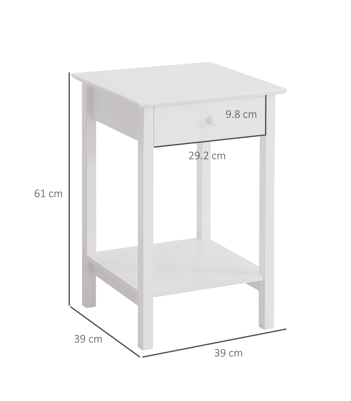 - Wooden Bedside Table Cabinet W/ Drawer Shelf Storage End Side White - Description: - Stylish and Elegant: Clean white design that looks great with all style decor. - Spacious: Features one top drawer and a bottom shelf. - Lightweight: Can be moved around easily. - PERFECT FOR ALL AROUND THE HOME: Can be used in the bedroom, kitchen, living room, and hallway. - Sturdy Construction: Built from particleboard to ensure durability and stability for years to come. - EASY TO MAINTAIN: Smooth surface finish makes it quick and simple to clean. - Dimensions: 61H x 39L x 39Wcm. - ASSEMBLY REQUIRED.