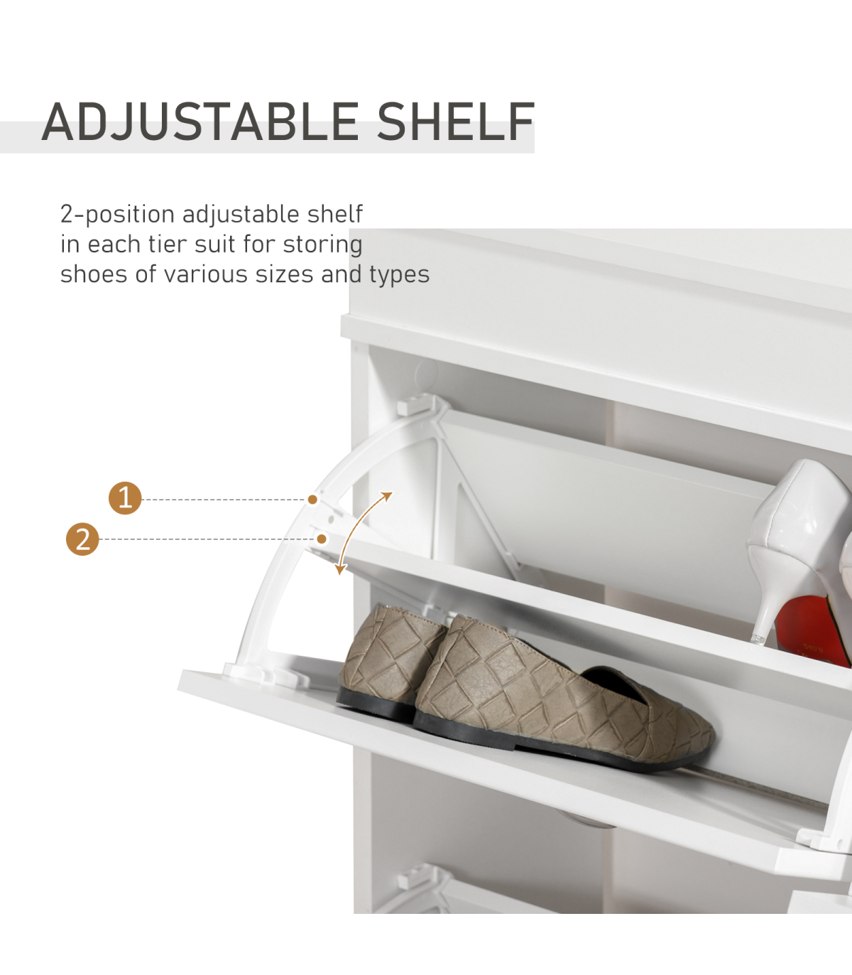 - FLEXIBLE STORAGE: 2-position adjustable shelf in each tier suitable for storing shoes of various sizes and types. The smooth countertop offers additional holding and display space, perfect for keys and ornaments.