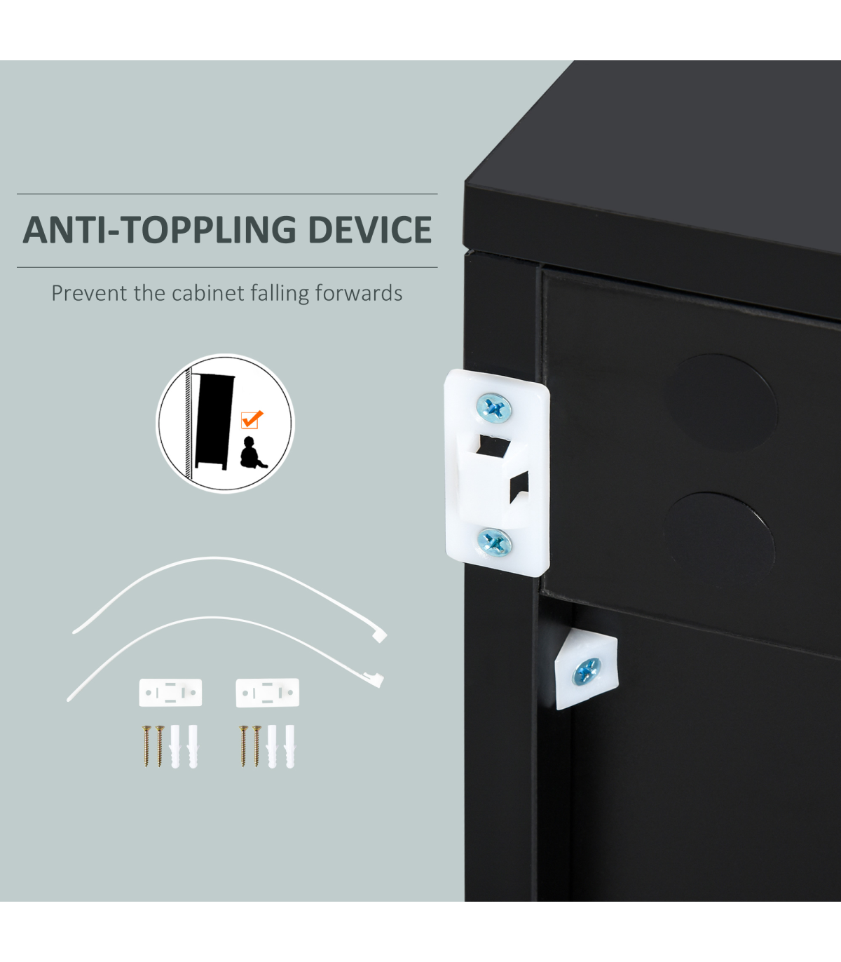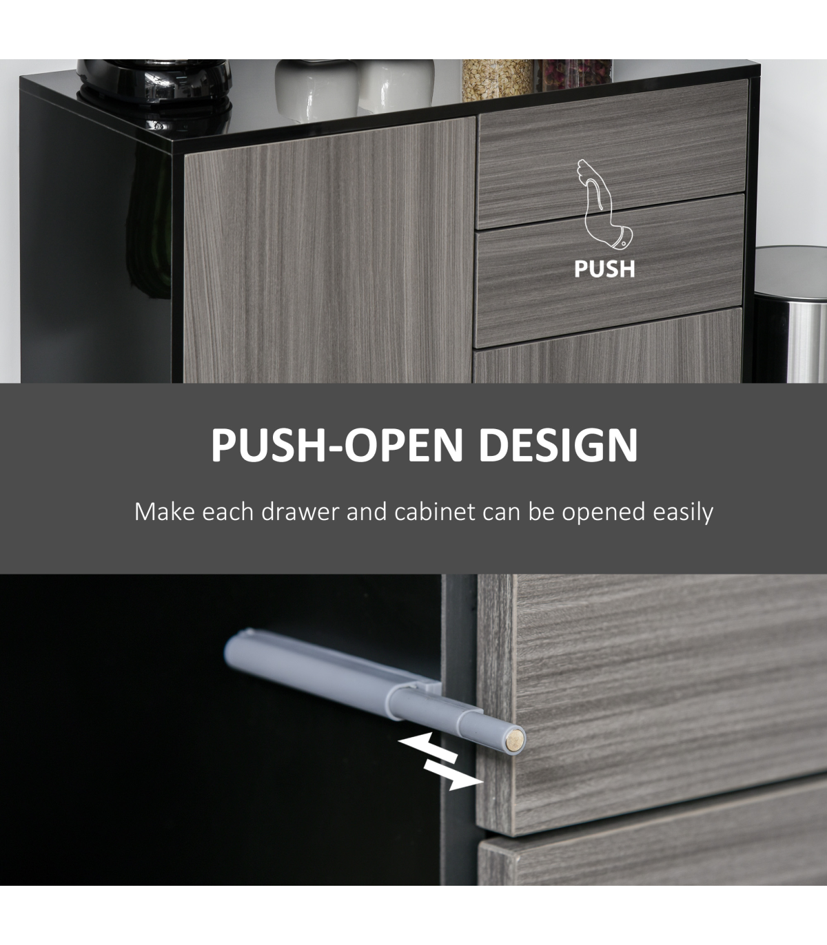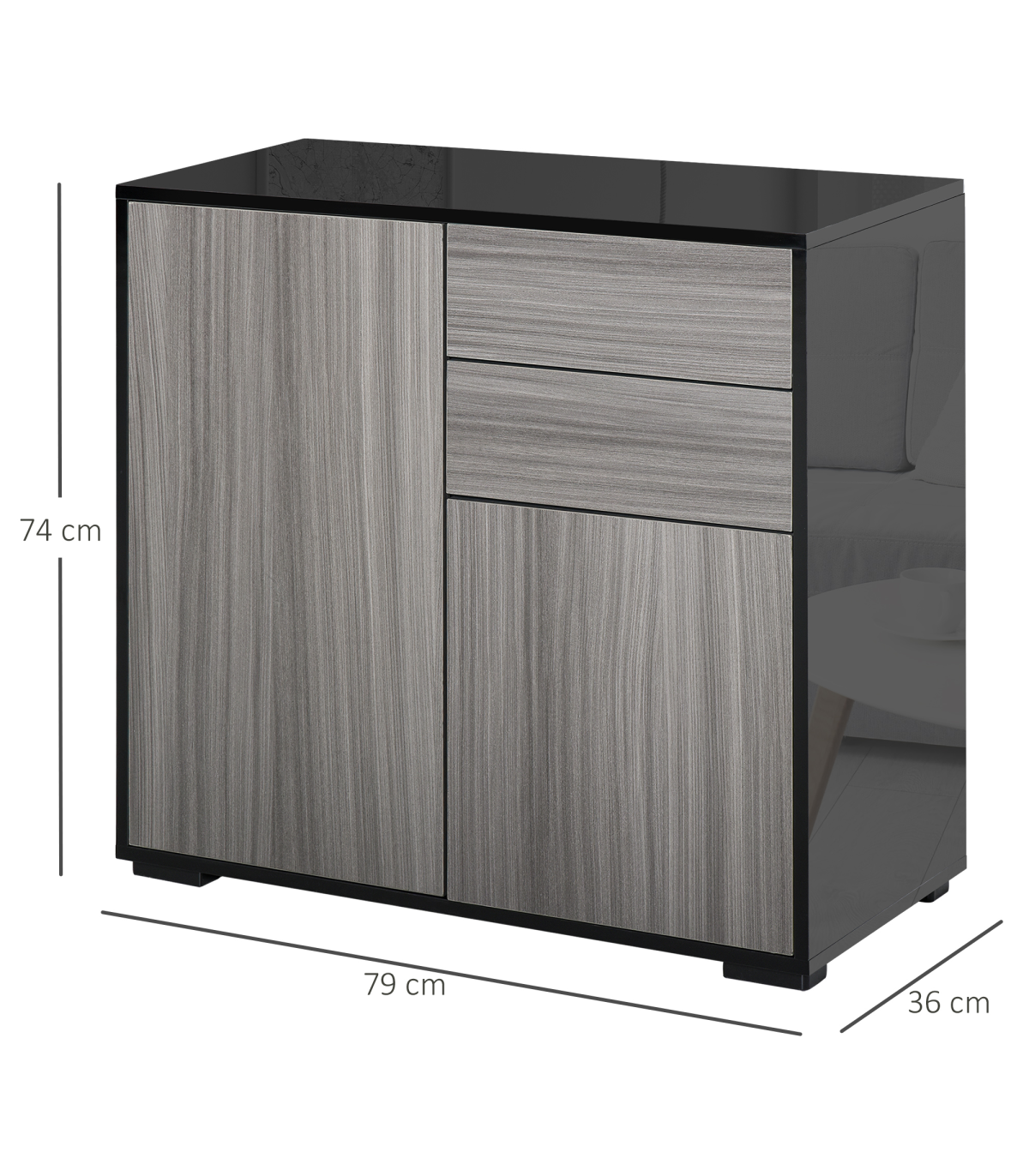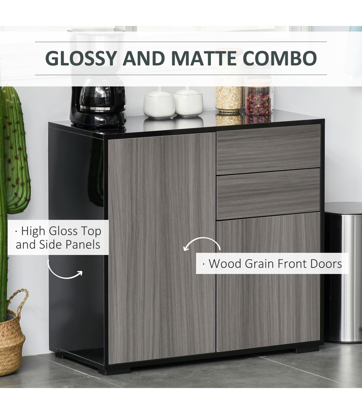 GLOSSY AND MATTE COMBO: Do you still have a hard time deciding between a glossy and a matte cabinet? The cabinet combines the two for a sophisticated look that is effortless. In contrast to the matte finish on the front panels, the glossy finish on the top and side highlights the cabinet's outlines, enhancing the feel of light and spaceMULTIPLE STORAGE COMPARTMENTS: Features two drawers and two cabinets, giving you plenty of room for keeping plates, boxes and more discreetly stored. Small cabinet features an three-level adjustable shelf.PUSH OPEN: Simply one click, and your drawers and cabinet doors open themselves. Saves time and effort.ANTI-TIPPING DESIGN: This freestanding furniture features an anti-tipping strap and can be fixed to the wall to prevent it from tipping over. DIMENSIONS: 74H x 79W x 36Dcm.MAXIMUM LOAD 50KG. ASSEMBLY REQUIRED.