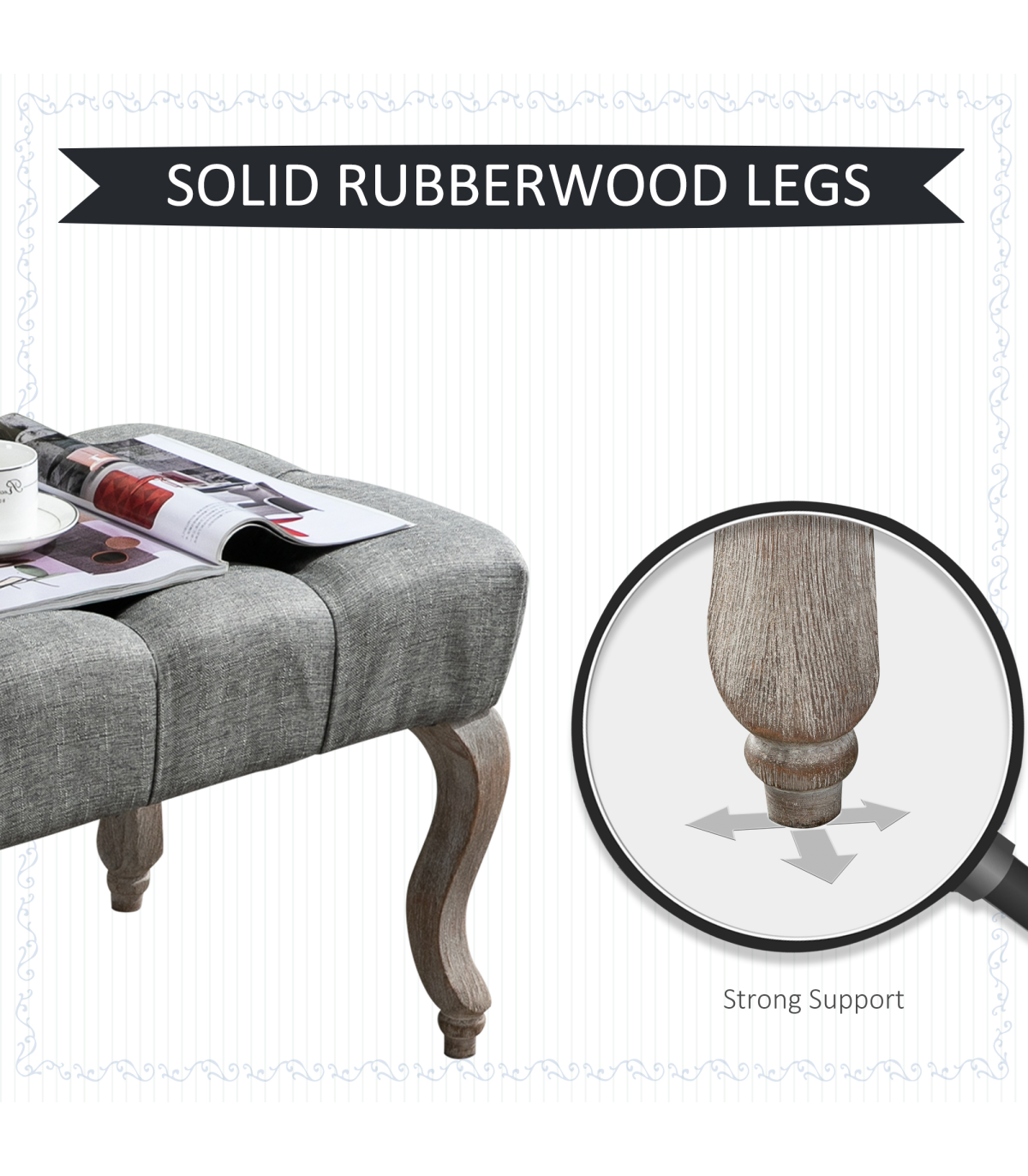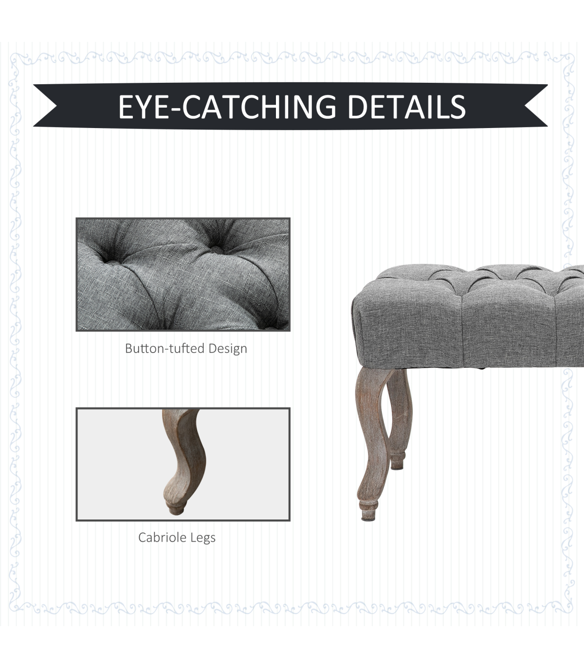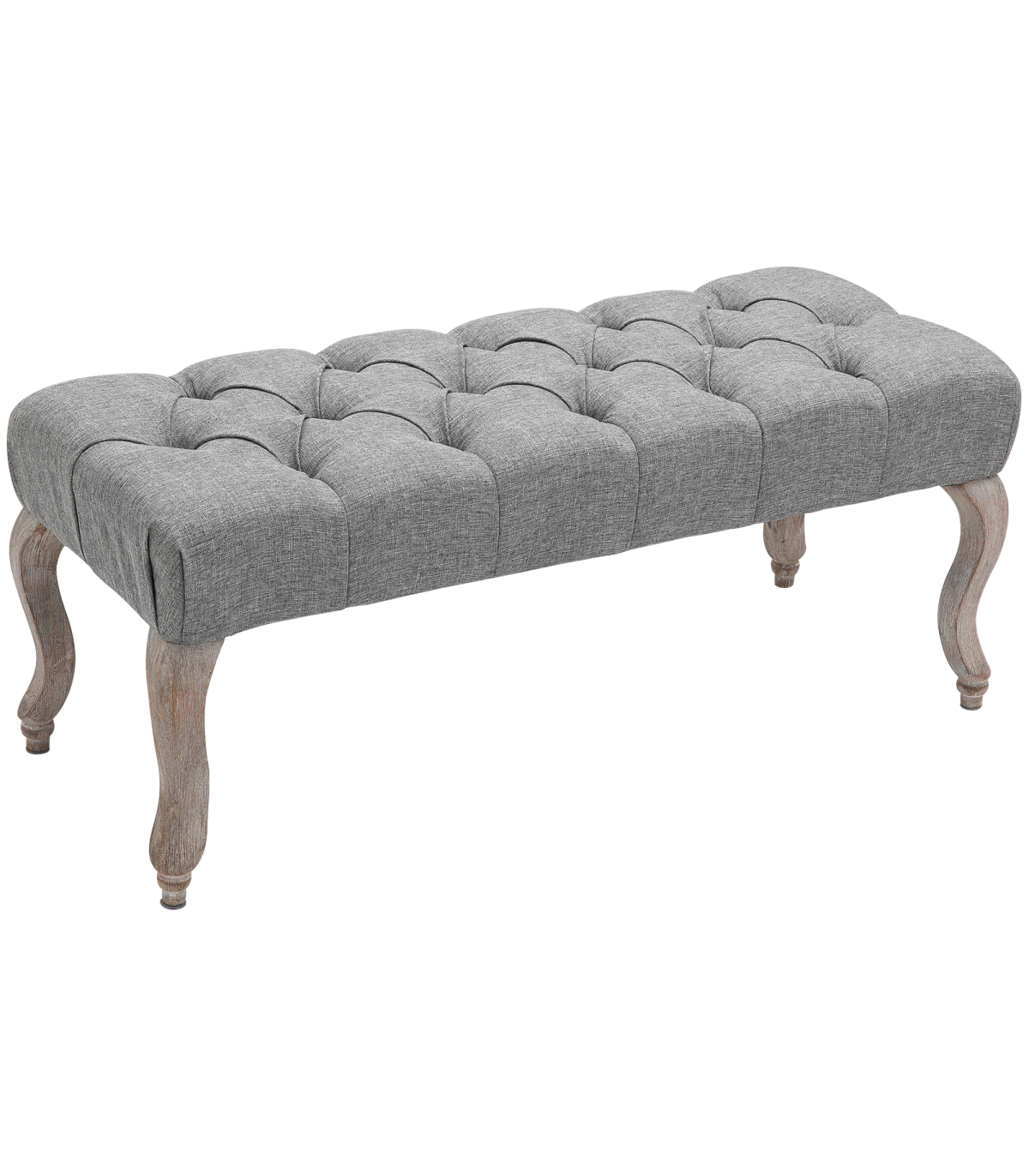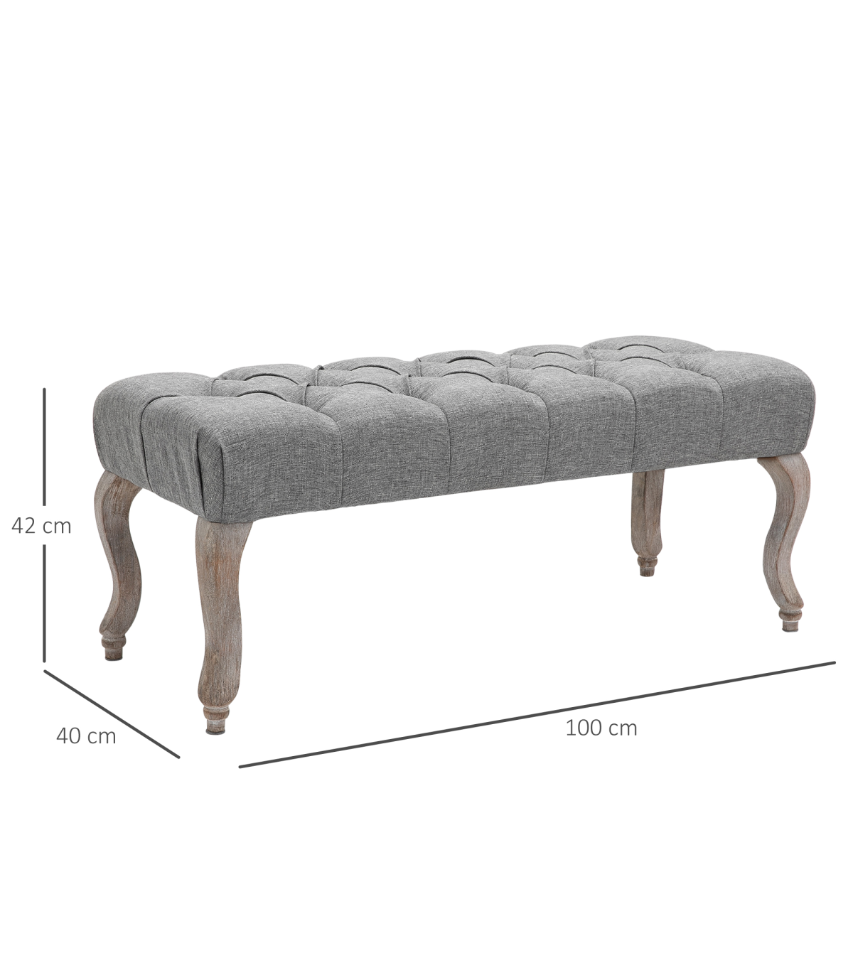 VINTAGE DESIGN: Brings a timeless elegance into your home. Curved legs with tufting on the seat for extra beauty and appeal.VERSATILE: Can be used in the bedroom, hallway, spare room, office and living room, creating an extra seat where needed.CUSHION TOP: Soft top seat for comfort every time you sit. Linen-look upholstery is smooth, breathable and can be spot cleaned easily.STURDY: Rubberwood legs ensure a solid and tough frame, keeping it balanced. Foot pads protect your floor. DIMENSIONS: 42H x 100W x 40Dcm.MAXIMUM LOAD 150KG. ASSEMBLY REQUIRED.