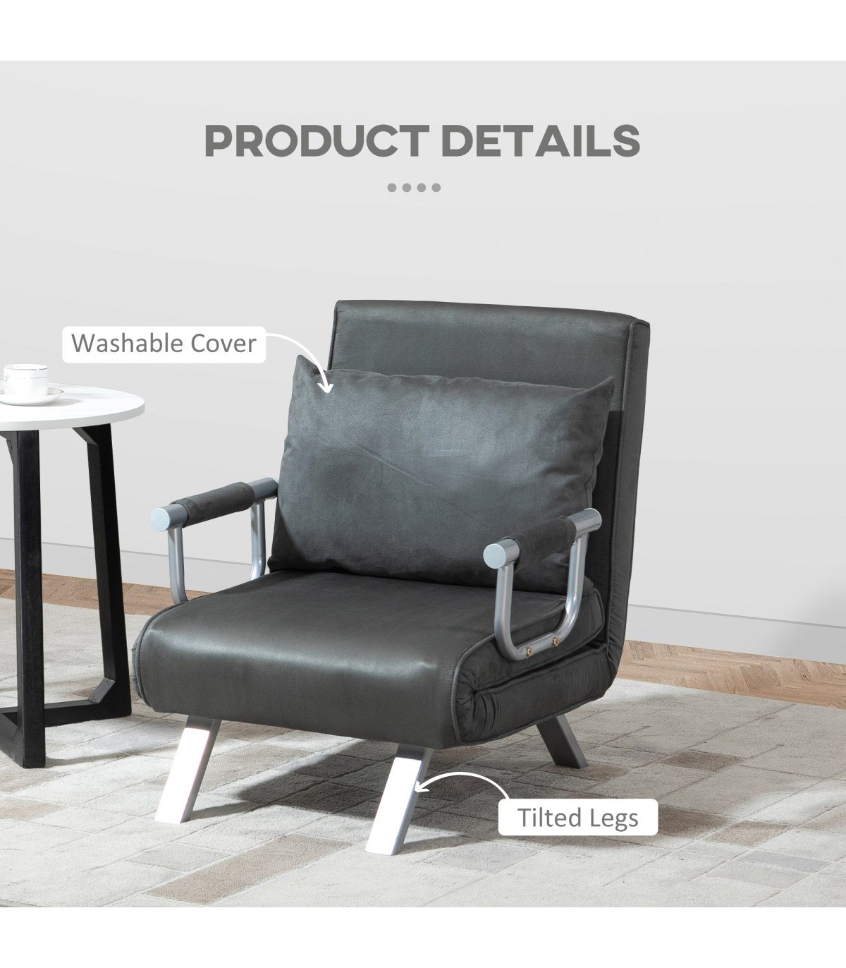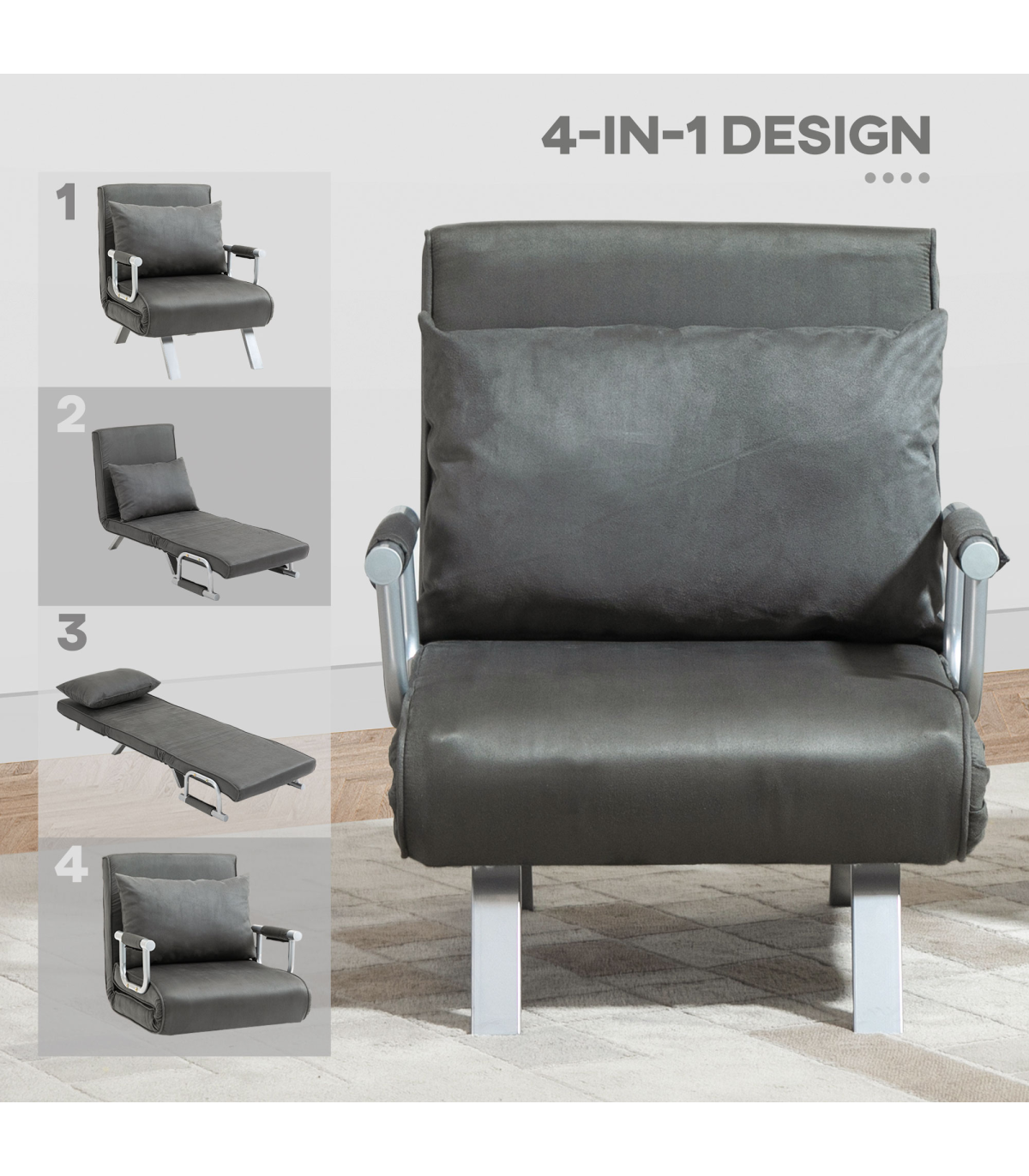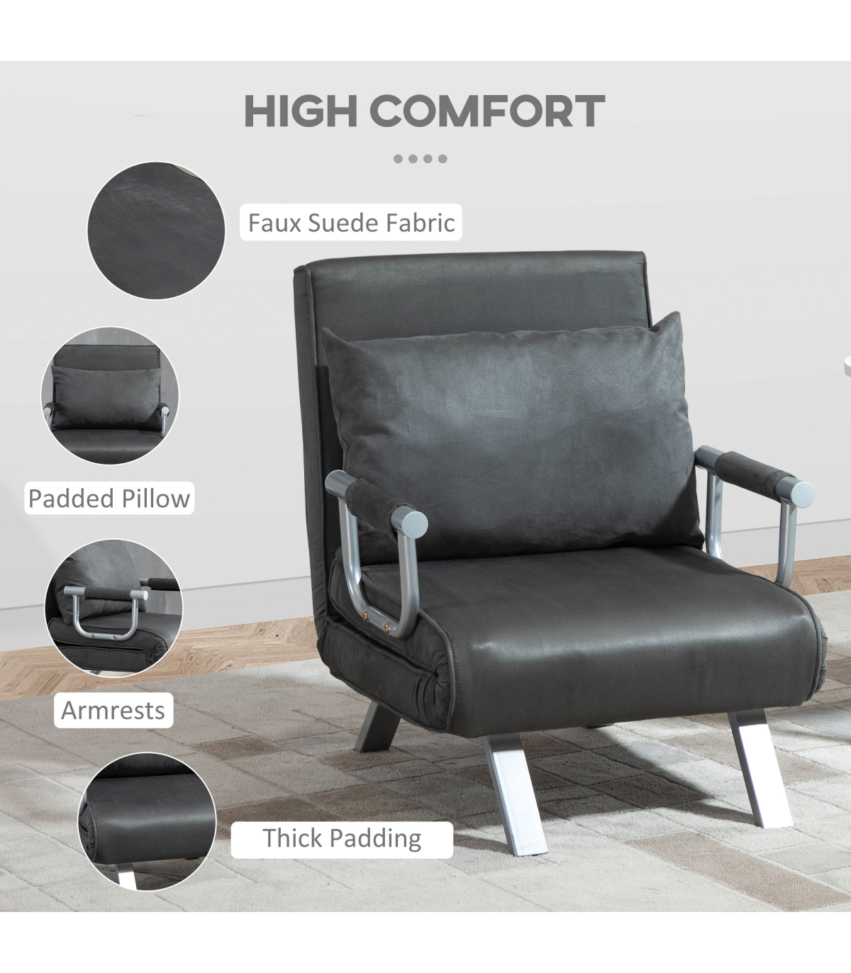 TWO-IN-ONE DESIGN: Transforms from a single chair to a sofa bed - an excellent space saver for smaller spaces. Ideal for when visitors stay overnight, giving them somewhere proper to rest.ADJUSTABLE BACK: Can be set to five different positions, allowing you to find the perfect shape which supports you as you rest and sleep.STEEL FRAME: A solid structure which supports your body when in use. Four angled legs to keep the balance. SPONGE PADDING: Thickly filled, ensures you'll be sitting comfortably. Also comes with cushion for extra comfort and support.SUEDETTE UPHOLSTERY: Making the foldable bed soft to the touch and create a stylish look.FOLDING CHAIR BED DIMENSIONS: Chair: 80H x 65W x 69Dcm. Bed: 25H x 185.5L x 60Wcm. MAXIMUM LOAD 100KG. ASSEMBLY REQUIRED.