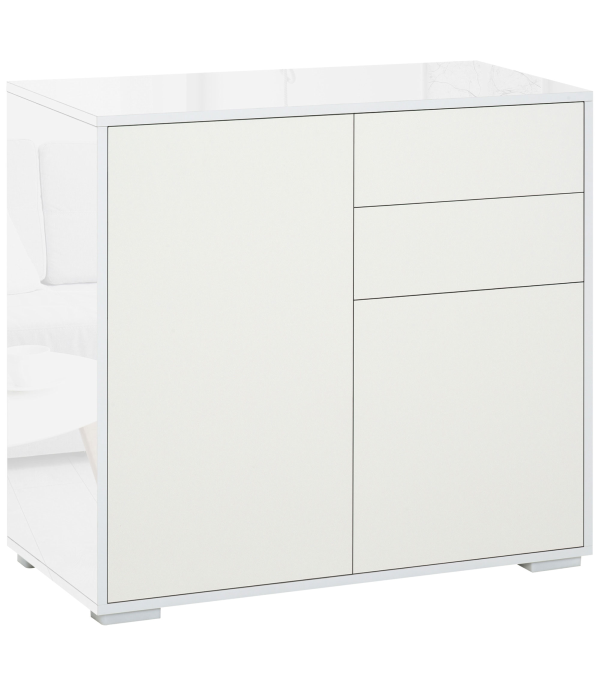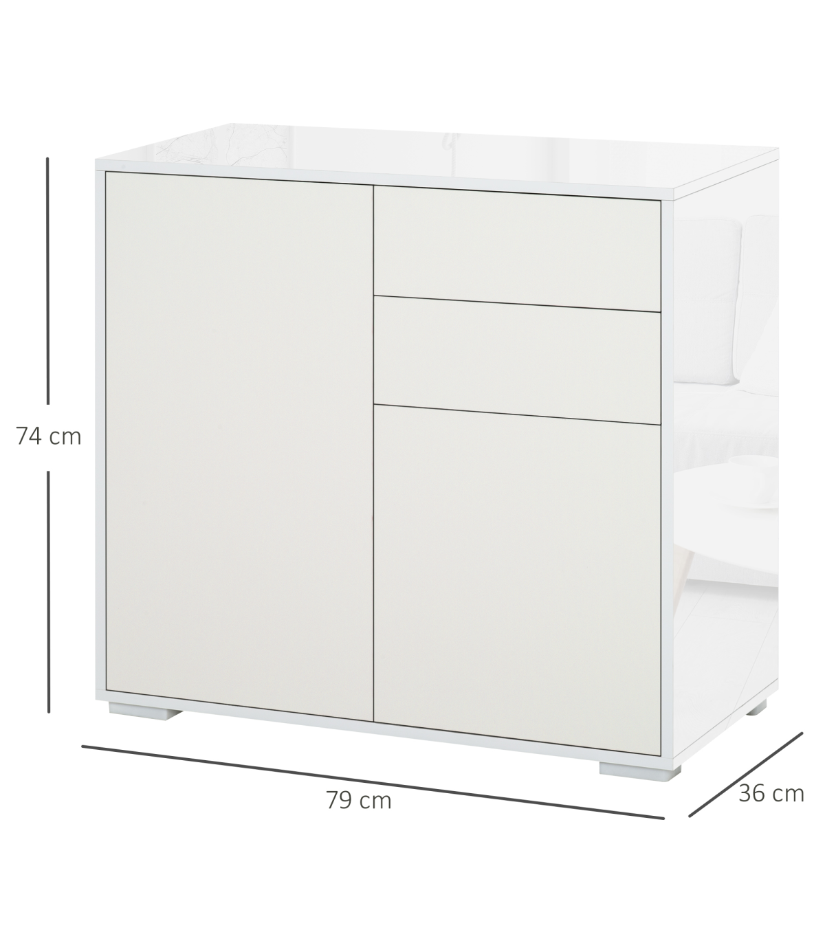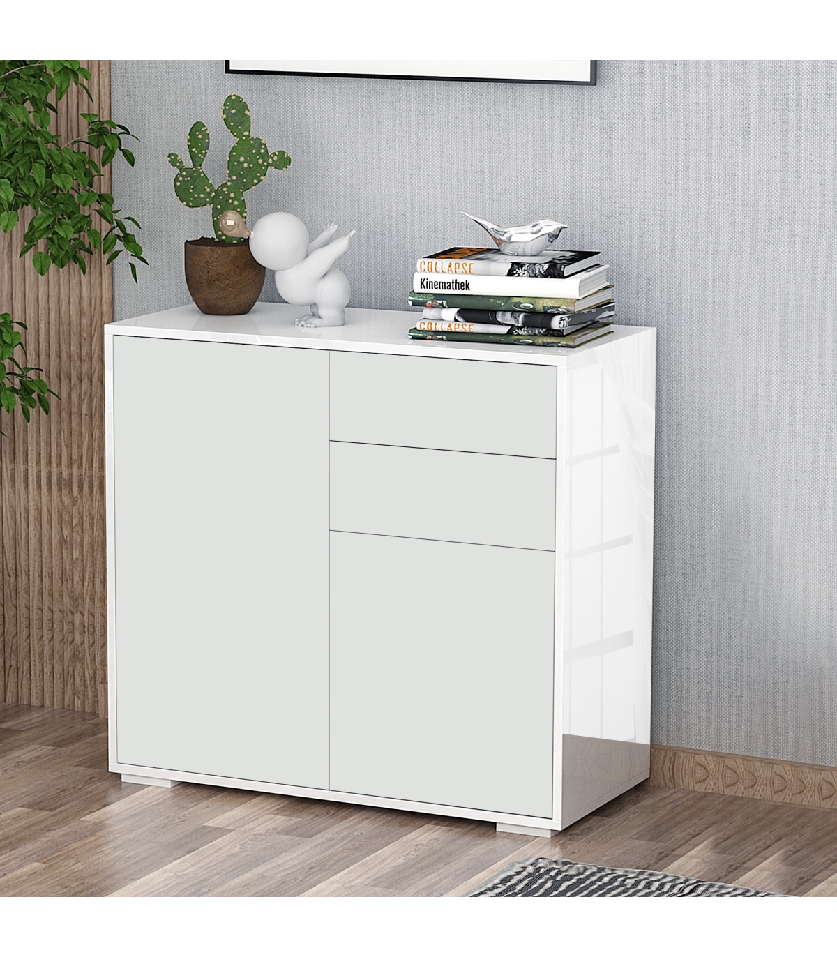 GLOSSY AND MATTE COMBO: Do you still have a hard time deciding between a glossy and a matte cabinet? The cabinet combines the two for a sophisticated look that is effortless. In contrast to the matte finish on the front panels, the glossy finish on the top and side highlights the cabinet's outlines, enhancing the feel of light and spaceMULTIPLE STORAGE COMPARTMENTS: Features two drawers and two cabinets, giving you plenty of room for keeping plates, boxes and more discreetly stored. Small cabinet features an three-level adjustable shelf.PUSH OPEN: Simply one click, and your drawers and cabinet doors open themselves. Saves time and effort.ANTI-TIPPING DESIGN: This freestanding furniture features an anti-tipping strap and can be fixed to the wall to prevent it from tipping over. DIMENSIONS: 74H x 79W x 36Dcm.MAXIMUM LOAD 50KG. ASSEMBLY REQUIRED.