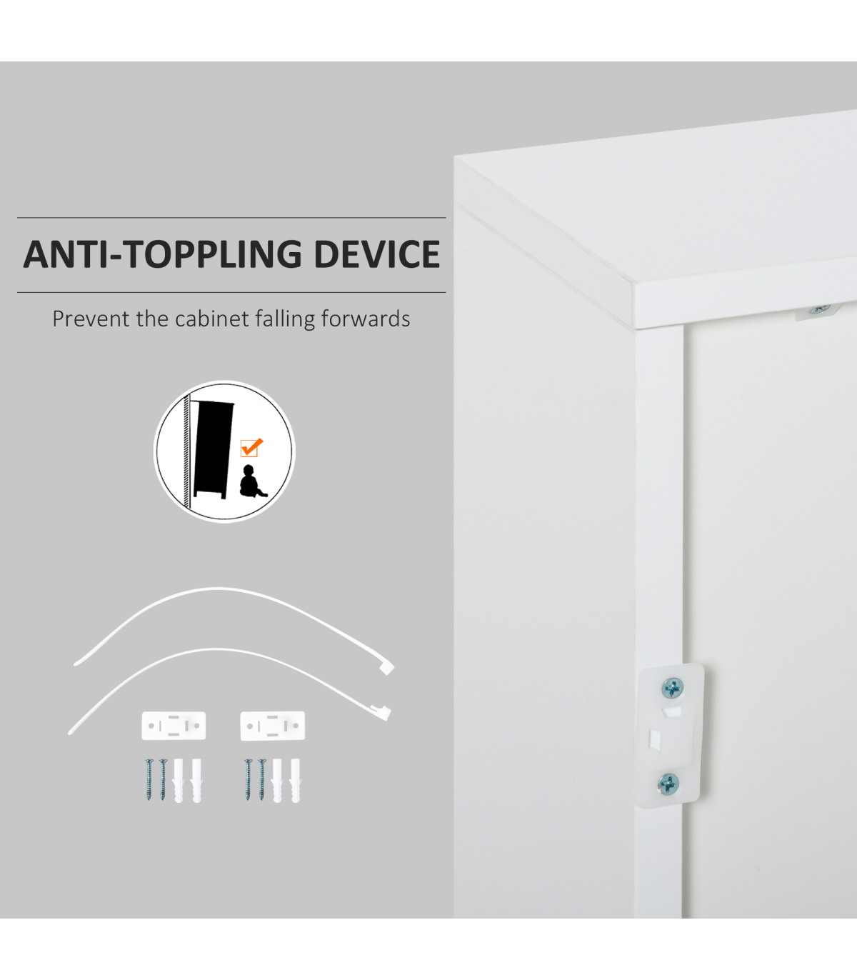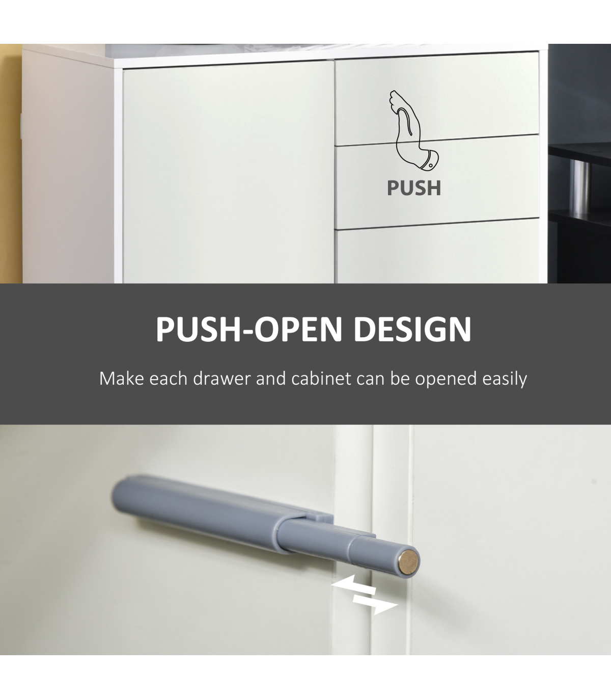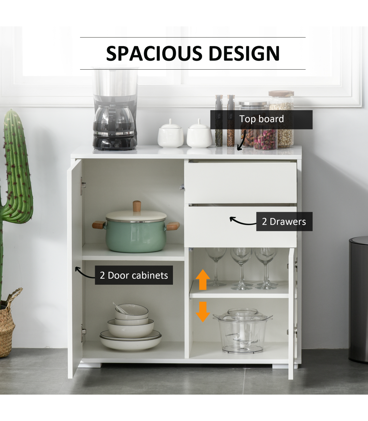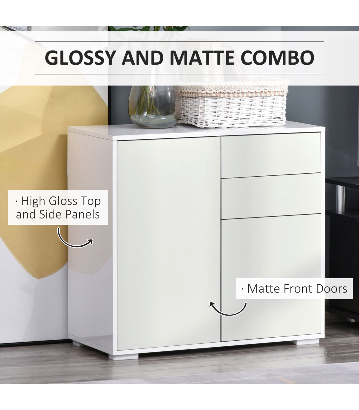 GLOSSY AND MATTE COMBO: Do you still have a hard time deciding between a glossy and a matte cabinet? The cabinet combines the two for a sophisticated look that is effortless. In contrast to the matte finish on the front panels, the glossy finish on the top and side highlights the cabinet's outlines, enhancing the feel of light and spaceMULTIPLE STORAGE COMPARTMENTS: Features two drawers and two cabinets, giving you plenty of room for keeping plates, boxes and more discreetly stored. Small cabinet features an three-level adjustable shelf.PUSH OPEN: Simply one click, and your drawers and cabinet doors open themselves. Saves time and effort.ANTI-TIPPING DESIGN: This freestanding furniture features an anti-tipping strap and can be fixed to the wall to prevent it from tipping over. DIMENSIONS: 74H x 79W x 36Dcm.MAXIMUM LOAD 50KG. ASSEMBLY REQUIRED.