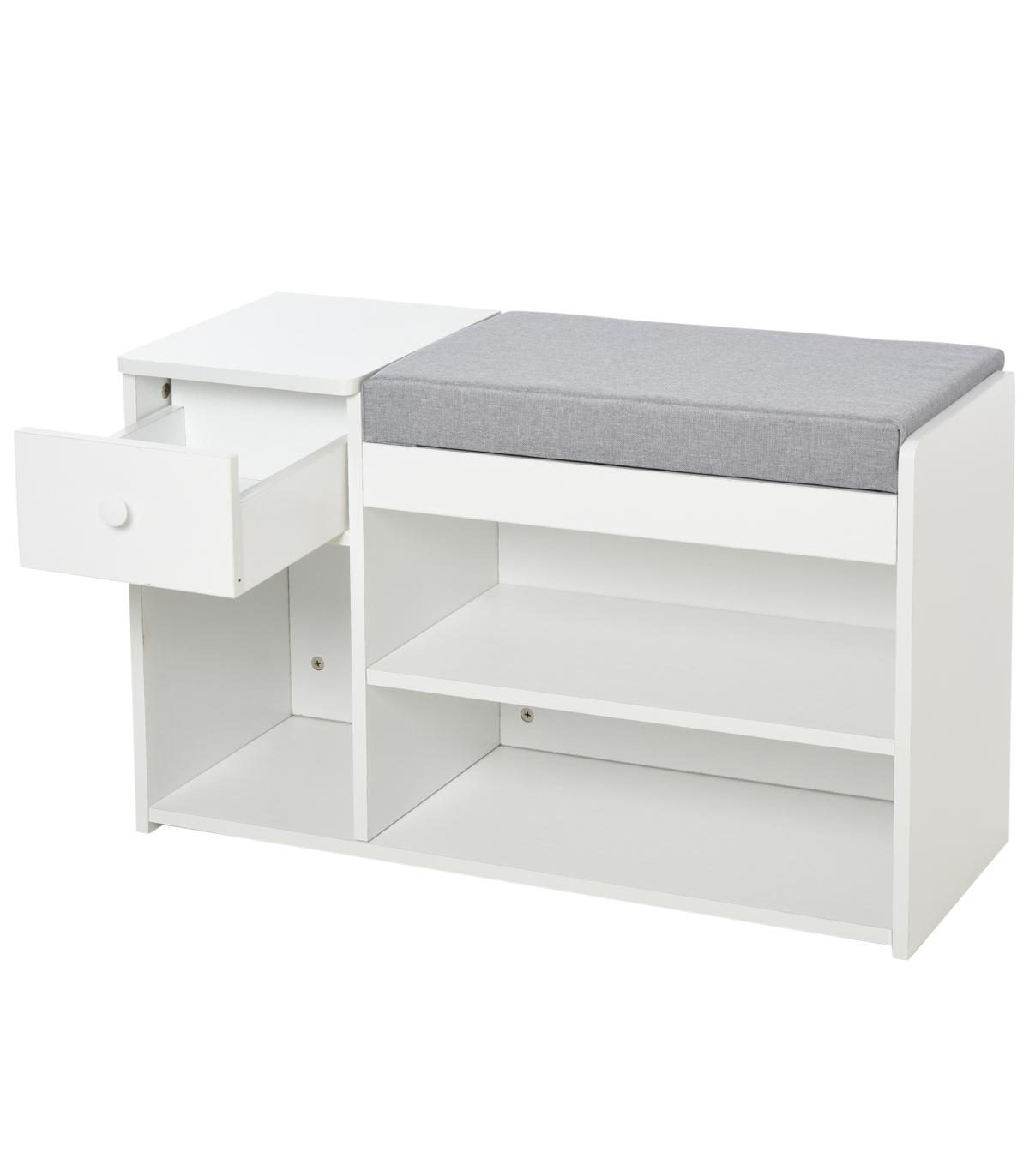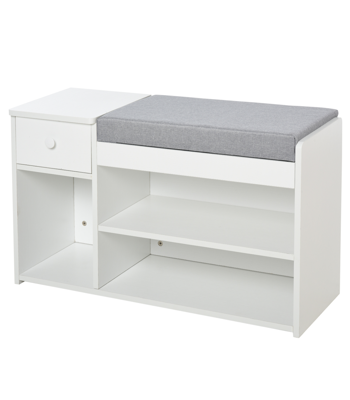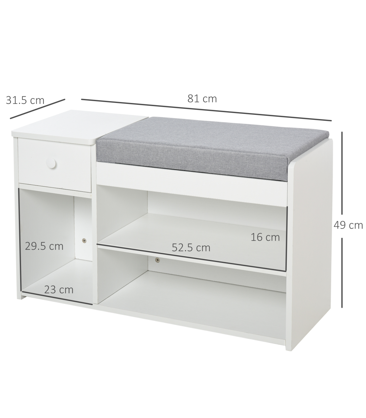 DUO DESIGN: Blends together lots of storage into a bench with a cushioned section. Allows storage of shoes and boots, and provides a place to sit whilst putting them on.STURDY: Made from a blend of particle board and MDF, ensuring the structure is tough and durable for continual everyday use.TOP CUSHION: Filled with sponge and wrapped in linen, it allows you to sit comfortably whilst putting shoes on/taking them off. Linen is smooth, breathable and easy to clean.SPACIOUS: Features three open compartments for shoes and boots and a top drawer for storage of smaller items - keys, cards, shoe polish. Small handle on drawer for easier opening and closing. DIMENSIONS: 49H x 81L x 31.5Wcm. Top cushion: 6H x 53L x 30.8Wcm.MAXIMUM LOAD 150KG. ASSEMBLY REQUIRED.